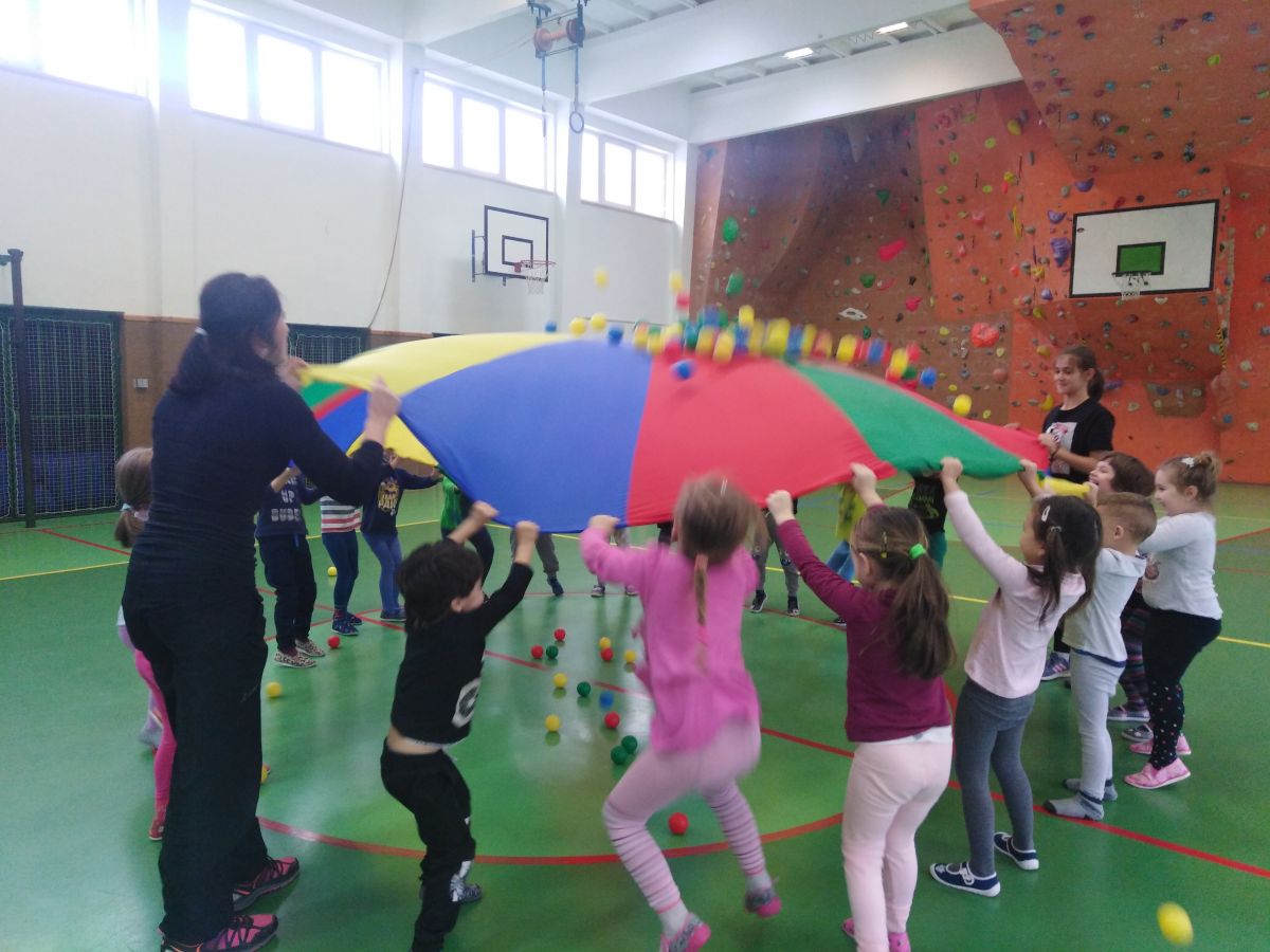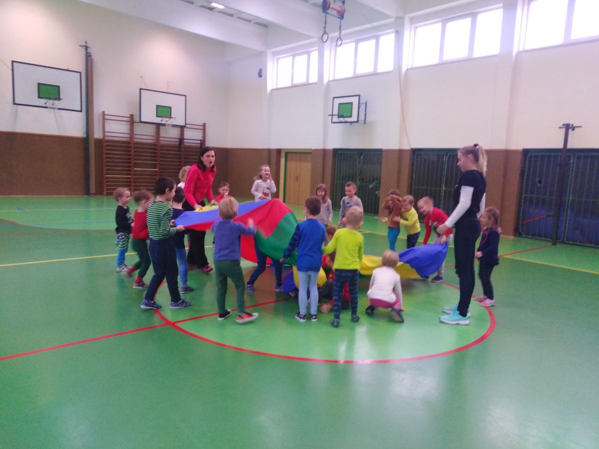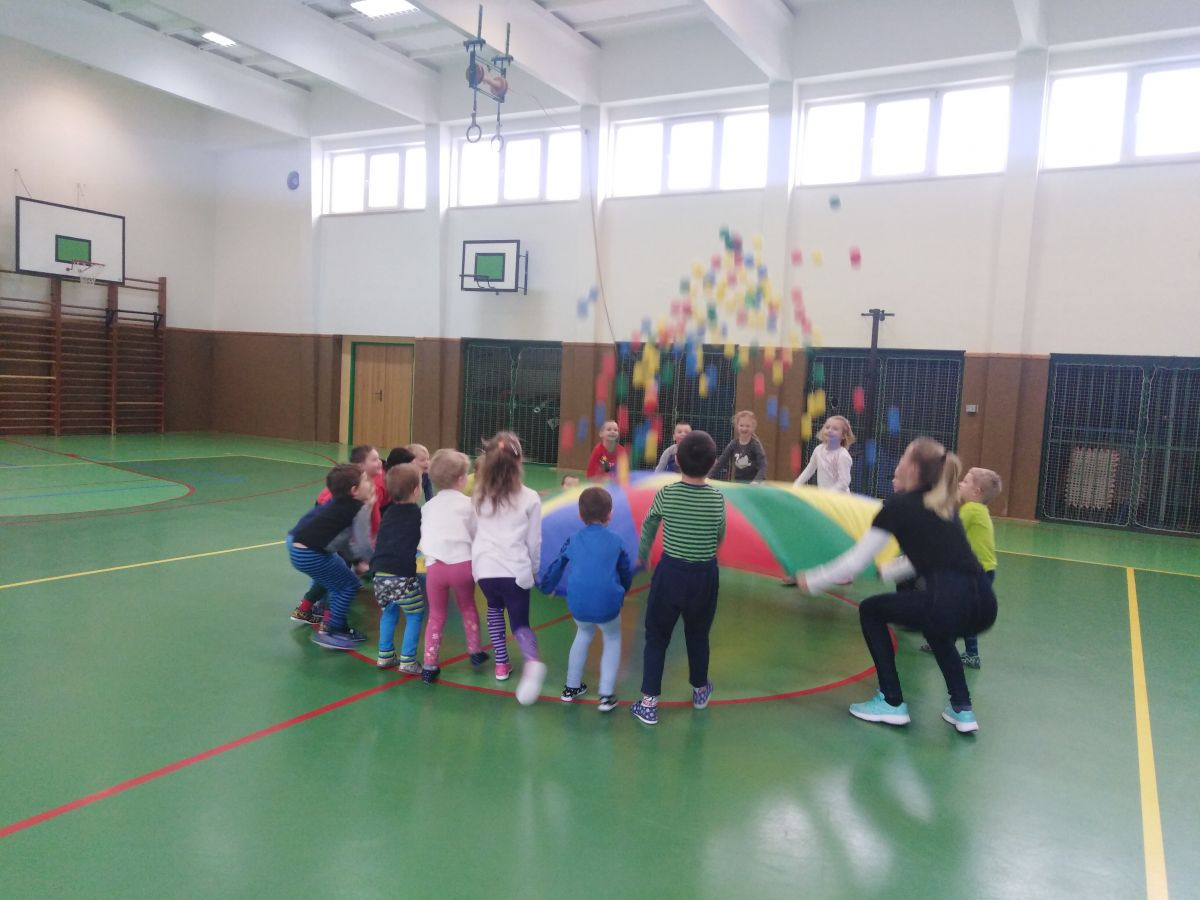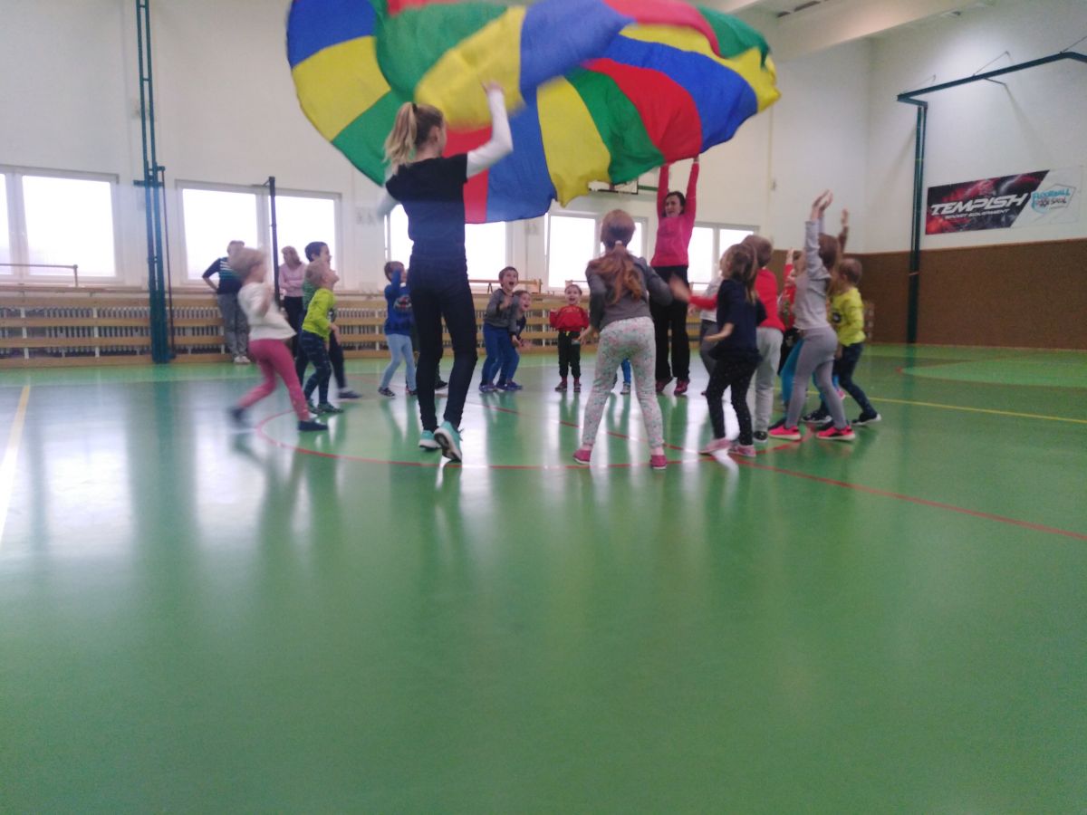 Děti zažily spoustu legrace s padákem, pod kterým podbíhaly nebo naopak pomocí padáku vyhazovaly do vzduchu míčky.