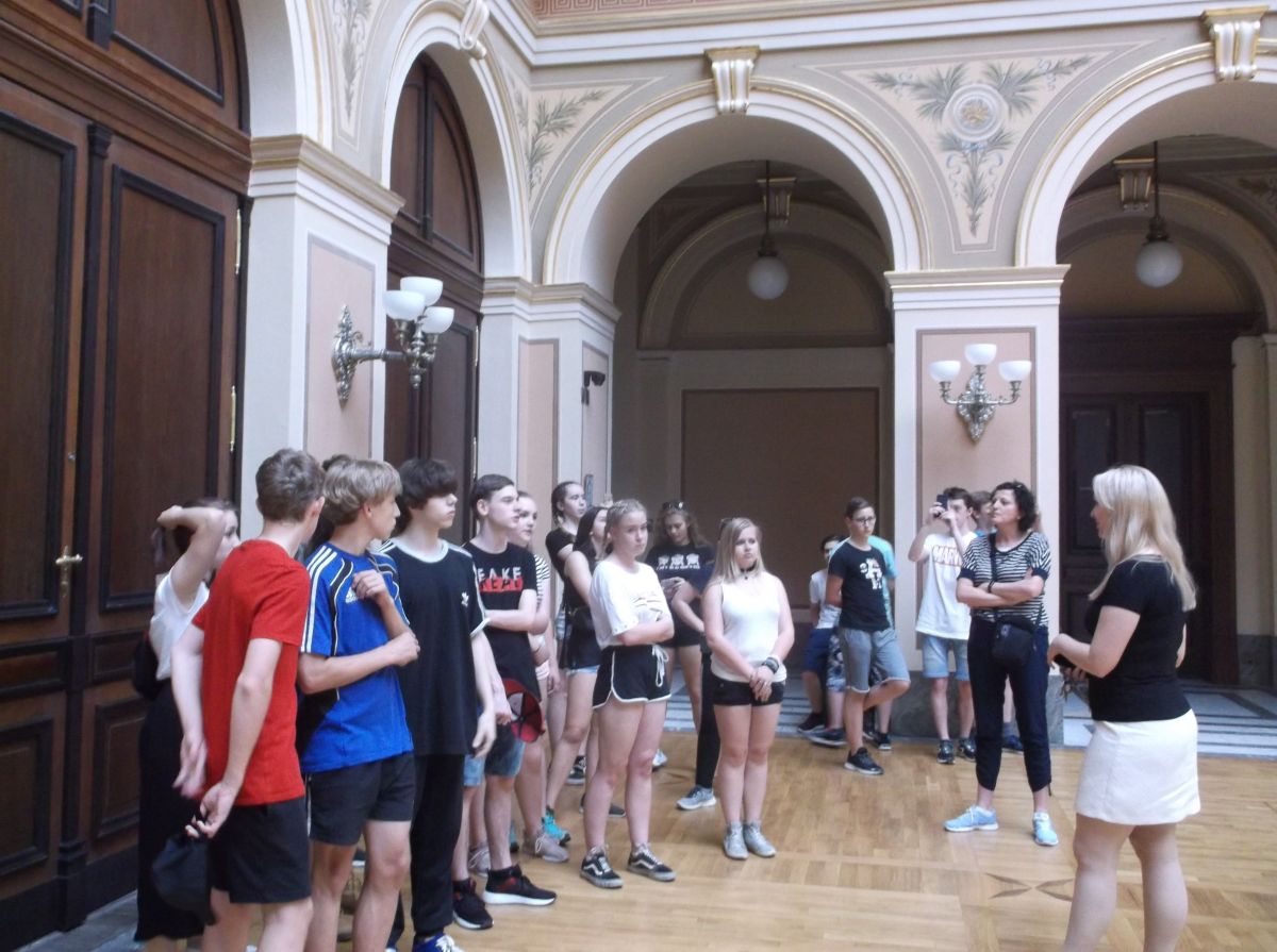 Druhý den, časně ráno, jsme vyrazili k Pražskému hradu. Kolem osmé a deváté hodiny nebyla na Hradčanském náměstí ani noha, takže jsme si tuto cestu historickými Hradčany vychutnali o to víc. Řadu žáků na celém výletě zaujala (zcela oprávněně) nádherná Katedrála sv. Víta, Václava a Vojtěcha. Po prohlídce dalších částí Hradu jsme vyrazili na oběd a posilněni vydatným jídlem jsme zamířili na kopec Petřín. Ti, kteří ještě nebyli znaveni horkem a únavou, vystoupali 299 schodů na Petřínskou rozhlednu. Jiní se šli zasmát do Zrcadlového bludiště. Lanovkou jsme sjeli dolů na Újezd a čekal nás poslední bod programu, což bylo Národní muzeum. To bylo v minulých letech citlivě a krásně opraveno a většinu z nás naprosto uchvátilo.