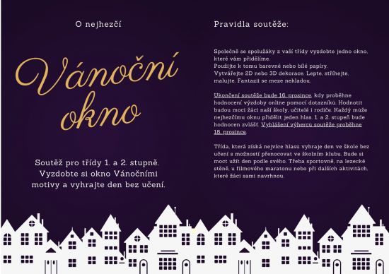 Ukončení soutěže bude 16. prosince, kdy proběhne hodnocení výzdoby online pomocí dotazníků. Hodnotit budou moci žáci naší školy, učitelé i rodiče. Každý může nejhezčímu oknu přidělit jeden hlas.
