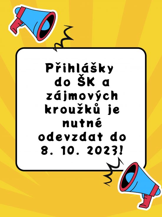 Přihlášky do ŠK a zájmových kroužků je nutné odevzdat do 8. 10. 2023!