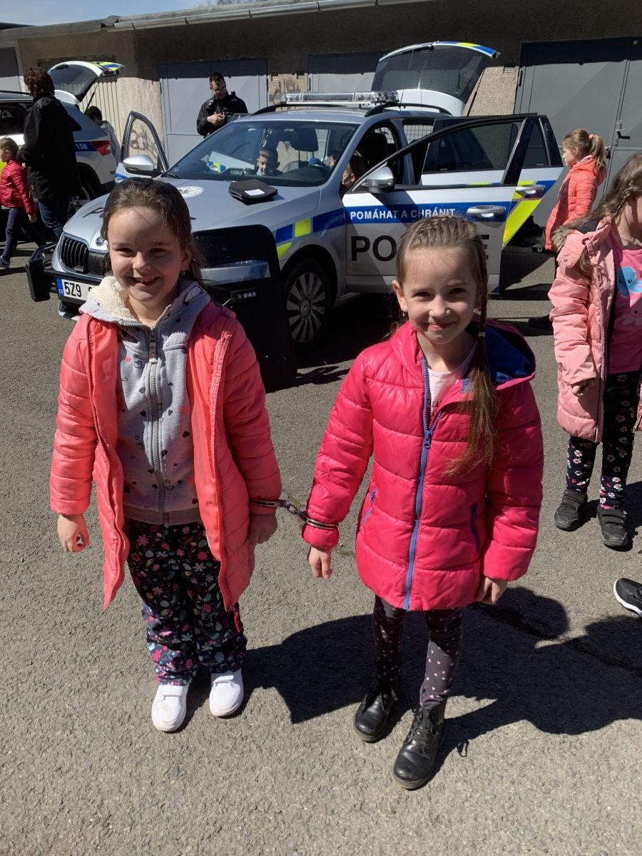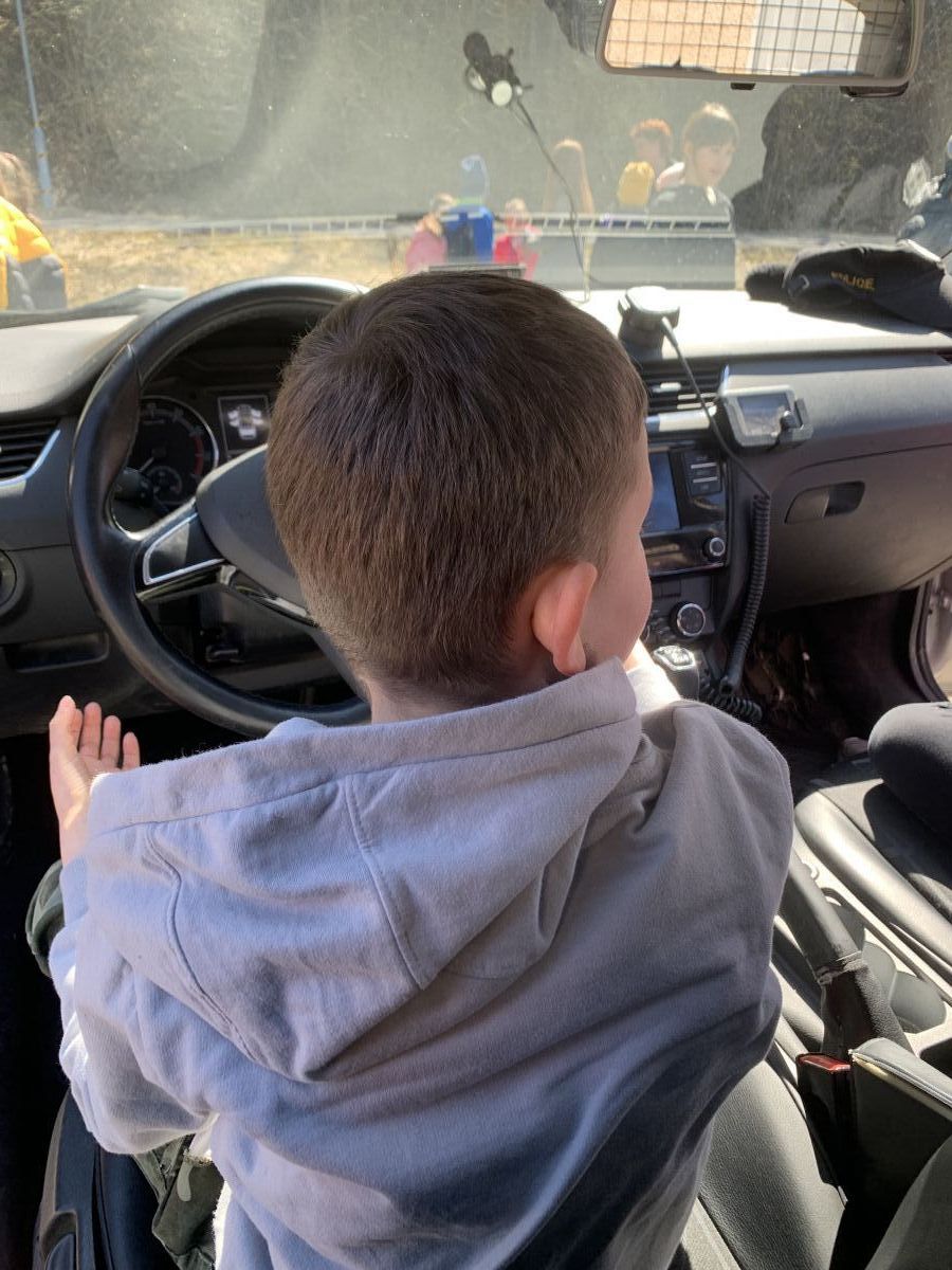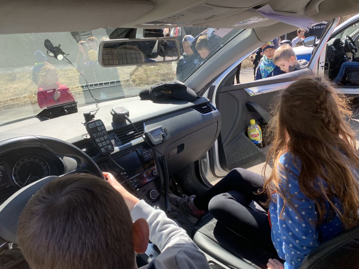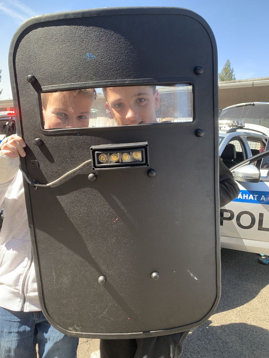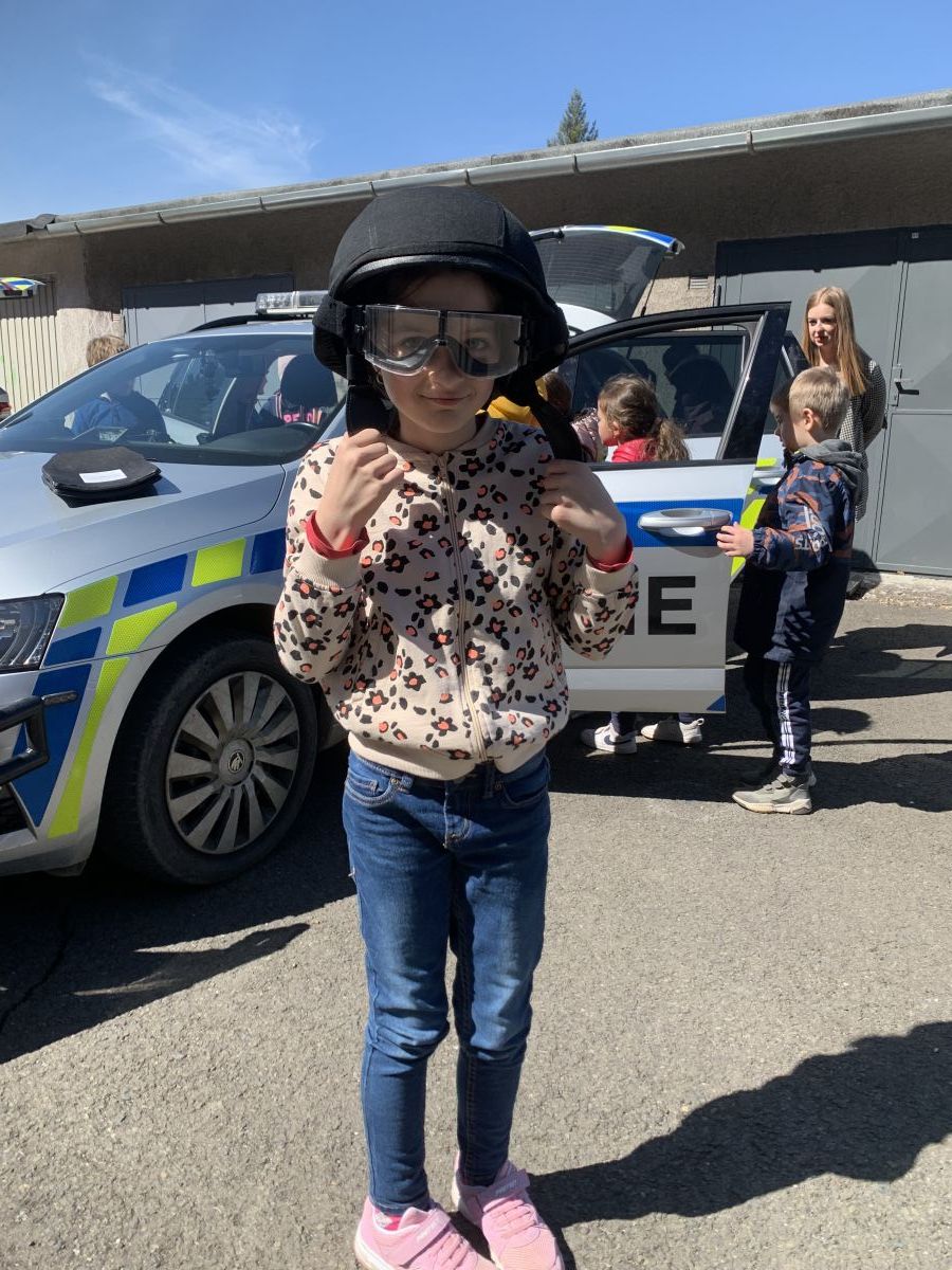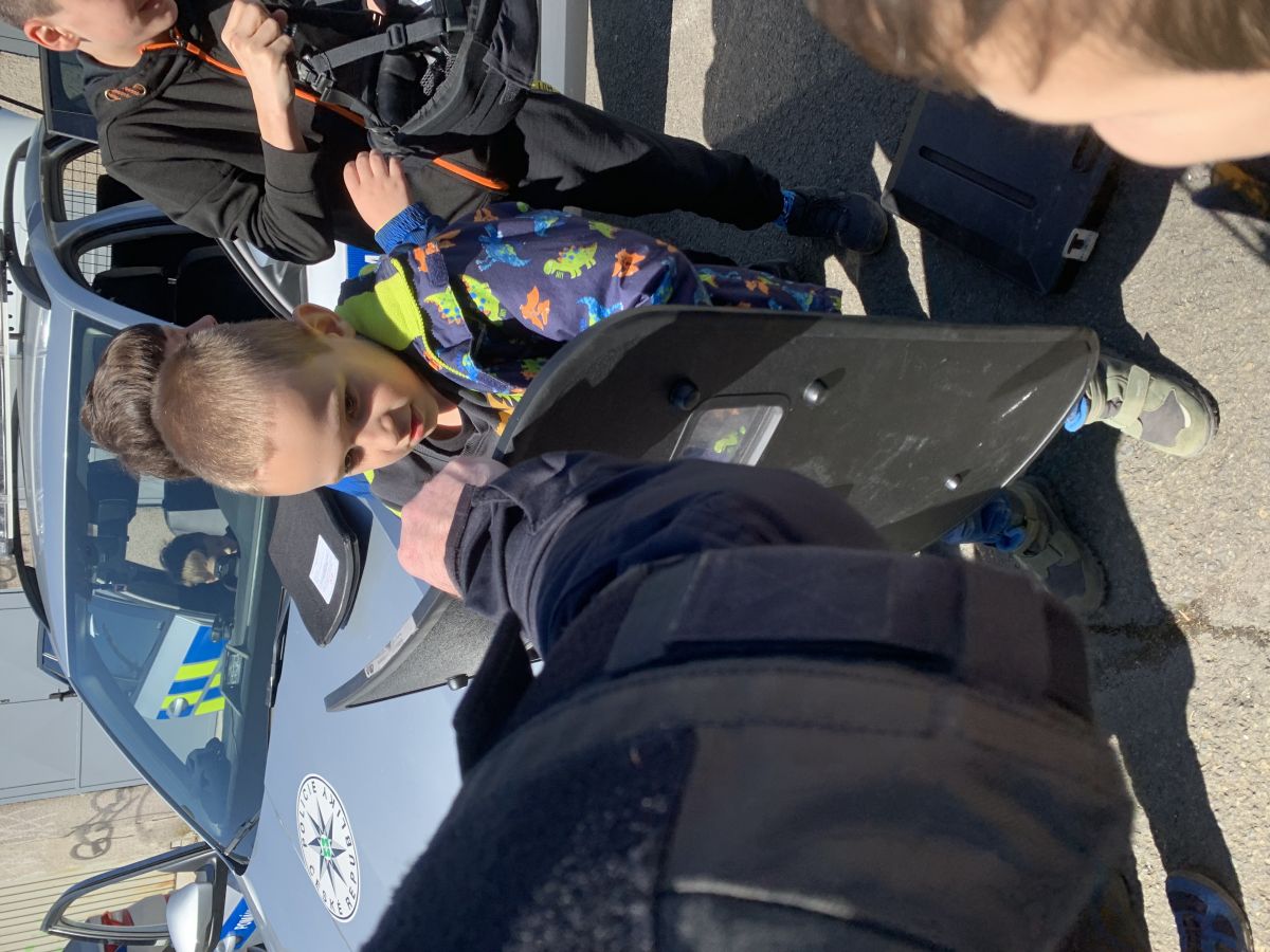 Policisté nám vysvětlili, co všechno obnáší jejich práce. Společně jsme si vyjasnili, kdy je vhodné policii přivolat a jak postupovat, zopakovali si důležitá telefonní čísla a ještě nám zbyl čas na dotazy. Auta jsme prošmejdili křížem krážem a vyzkoušeli jsme si helmu, pouta, štít, vestu a další policejní oděvy.