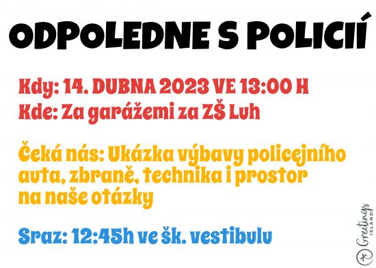Zjisti, co obnáší práce policisty, prozkoumej policejní auto, omrkni zbraně a klidně se ptej na to, co tě zajímá. 14. dubna ve 13:00 za garážemi za ZŠ Luh. (akce se koná jen za příznivého počasí)