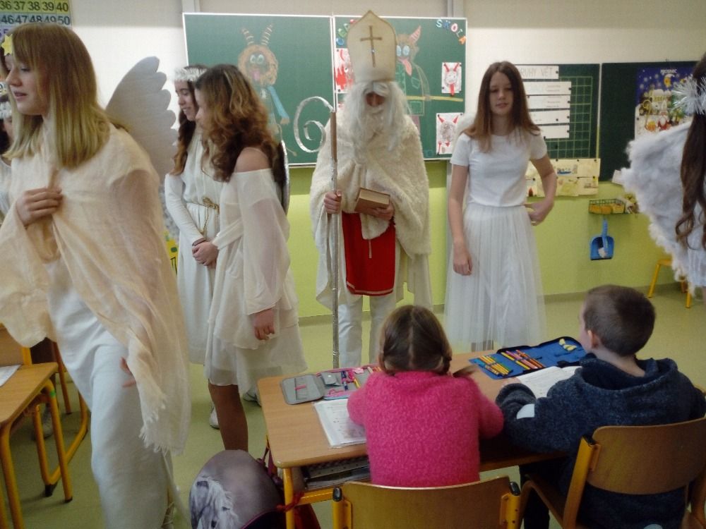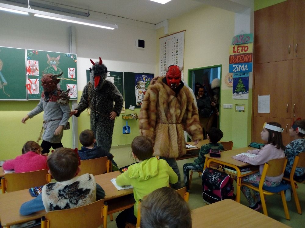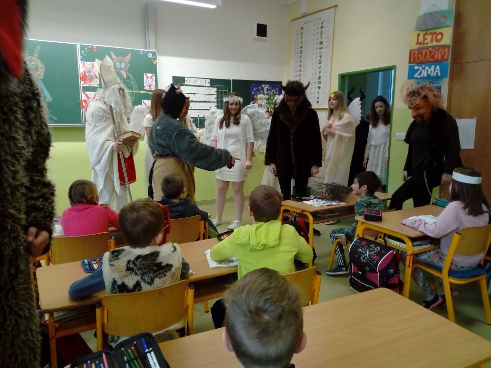 Nejdříve jsme se připravili na čerty – namalovali jsme si je uhlem. Pak se pekelníci objevili s Mikulášem a anděly i v naší třídě s nadílkou.