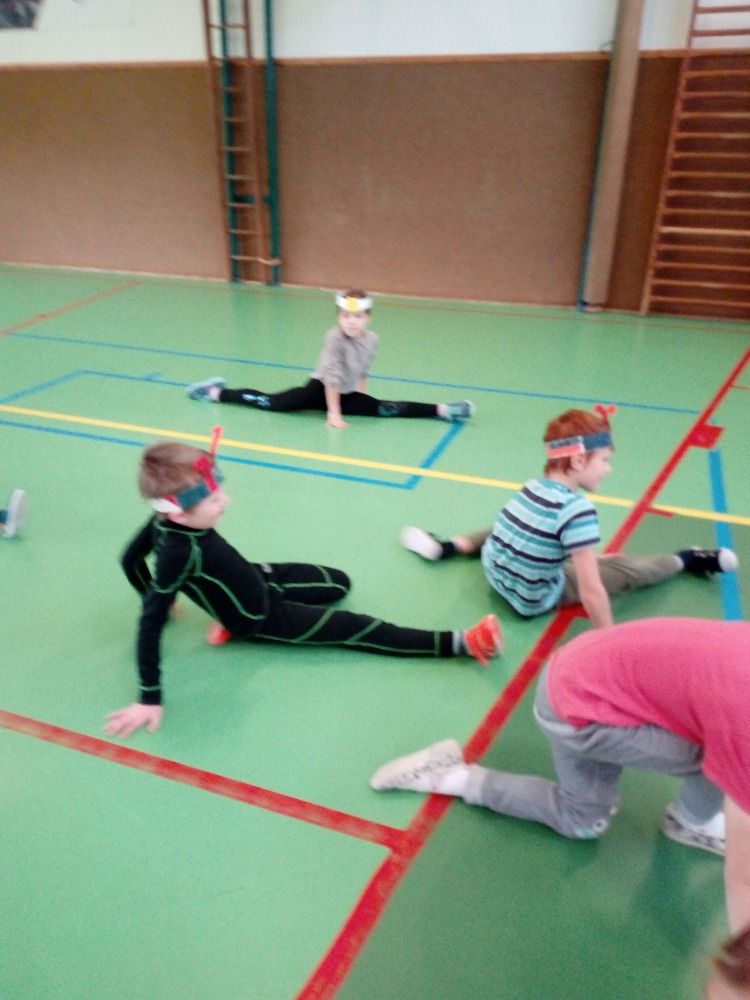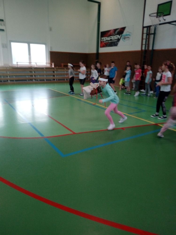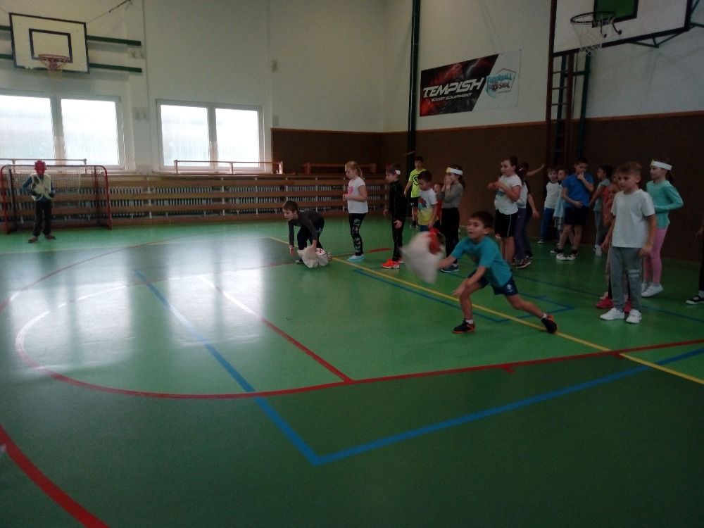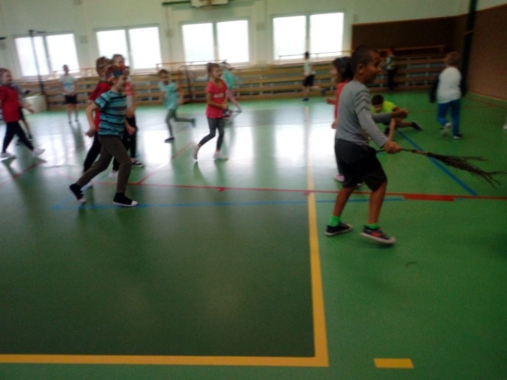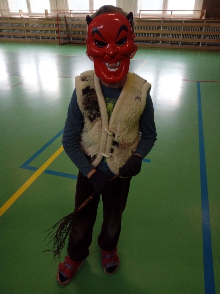 V tělocvičně jsme se rozcvičovali s andělem, závodili jsme s čertovským pytlem. Při čertovské honičce koště jen lítalo. Rohatý dělal rozhodčího i při hodu koštětem.