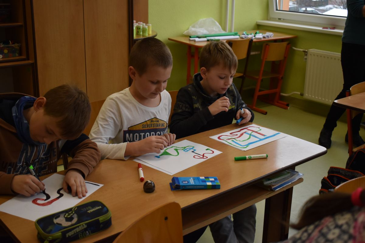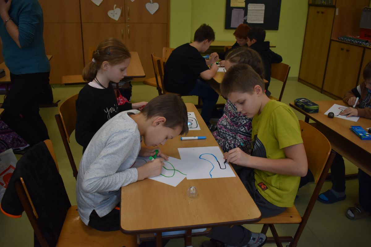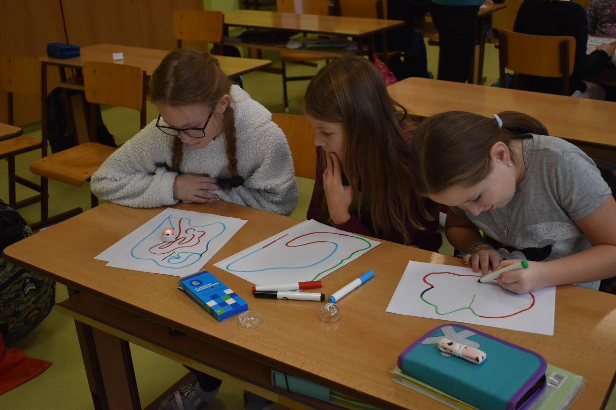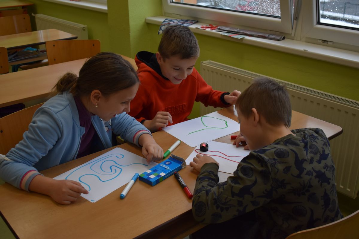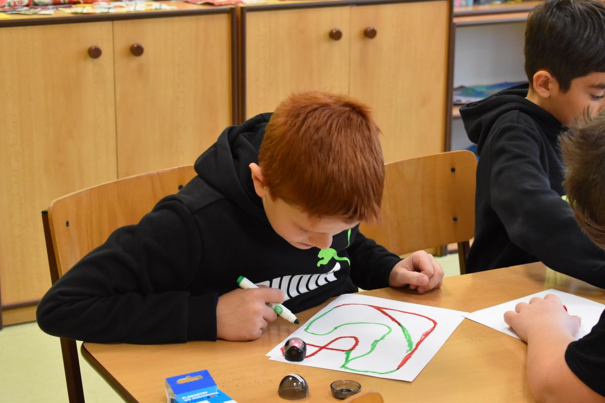Žáci 4.B se seznamovali s malými robůtky Ozoboty. Rozdělili se do skupinek a kreslili fixem různé dráhy a sledovali chování Ozobota.
