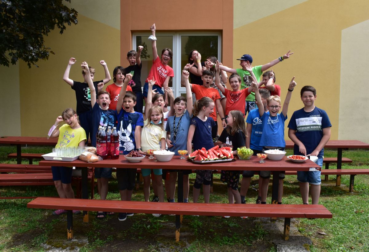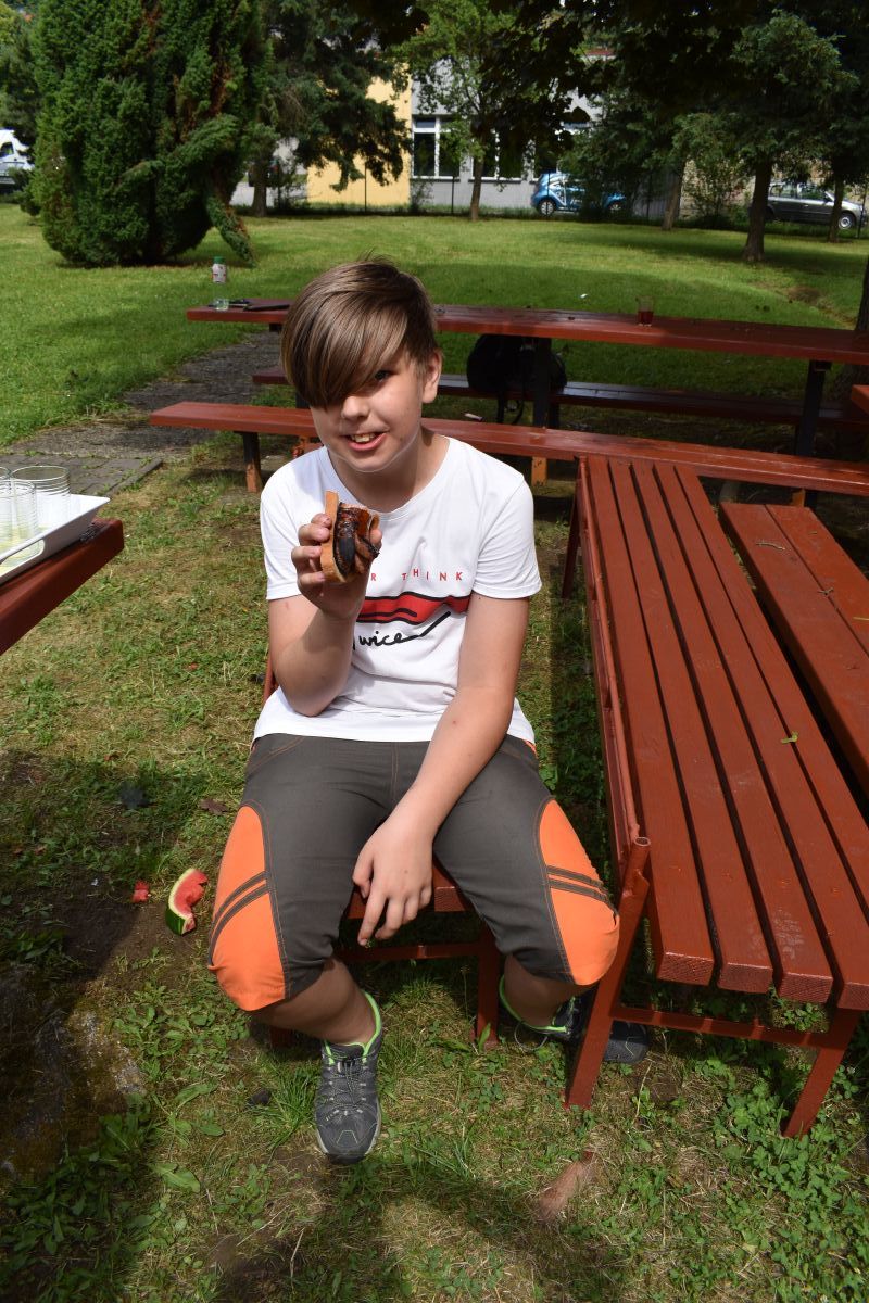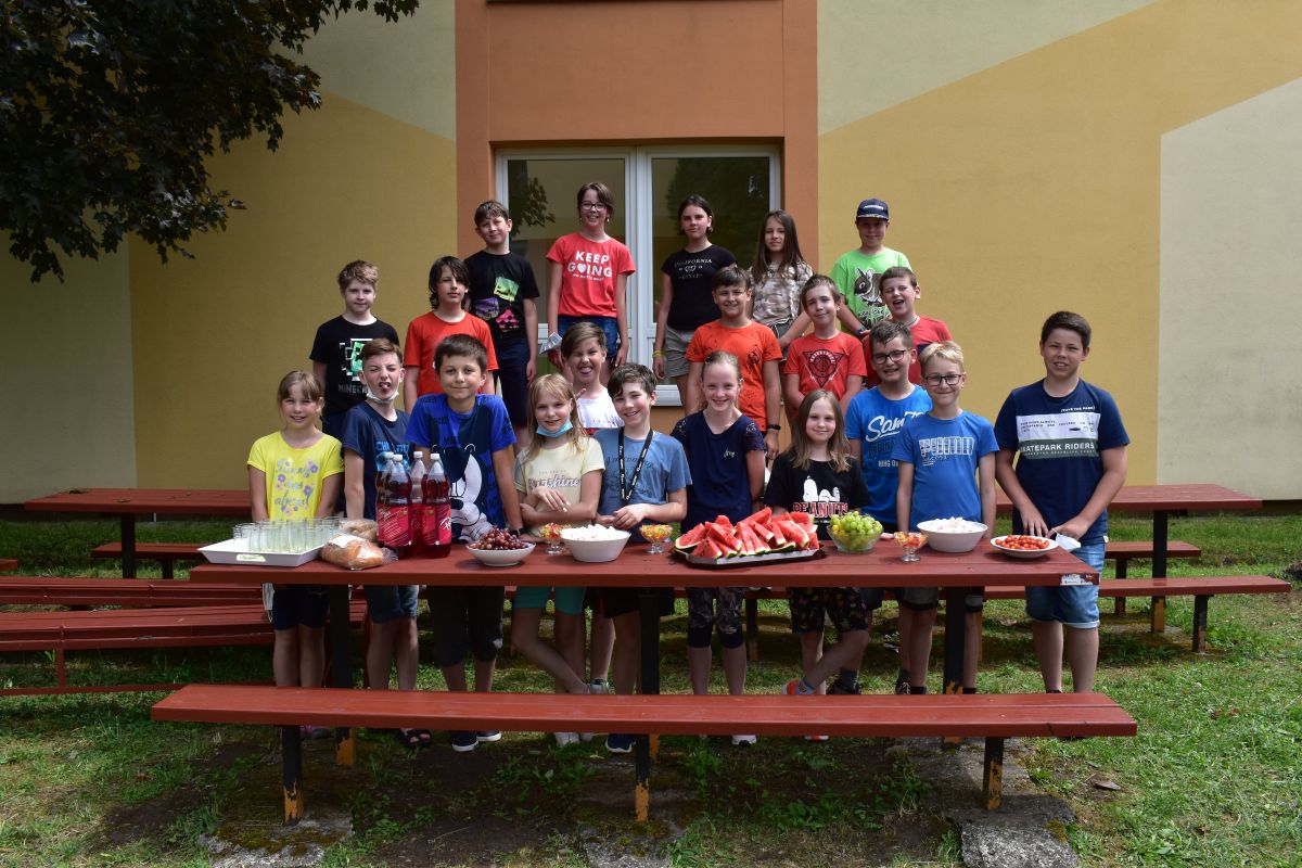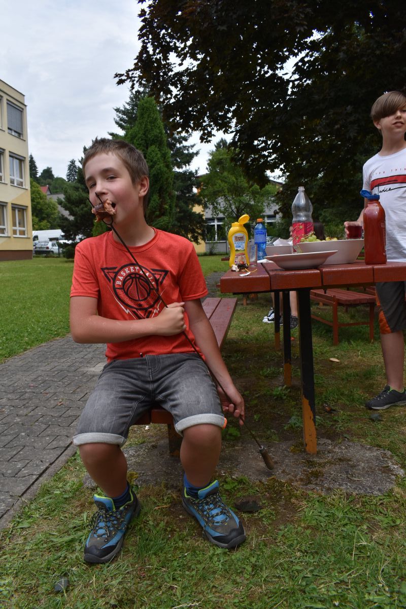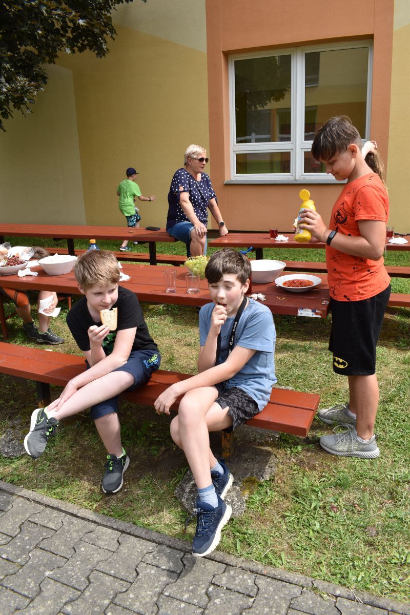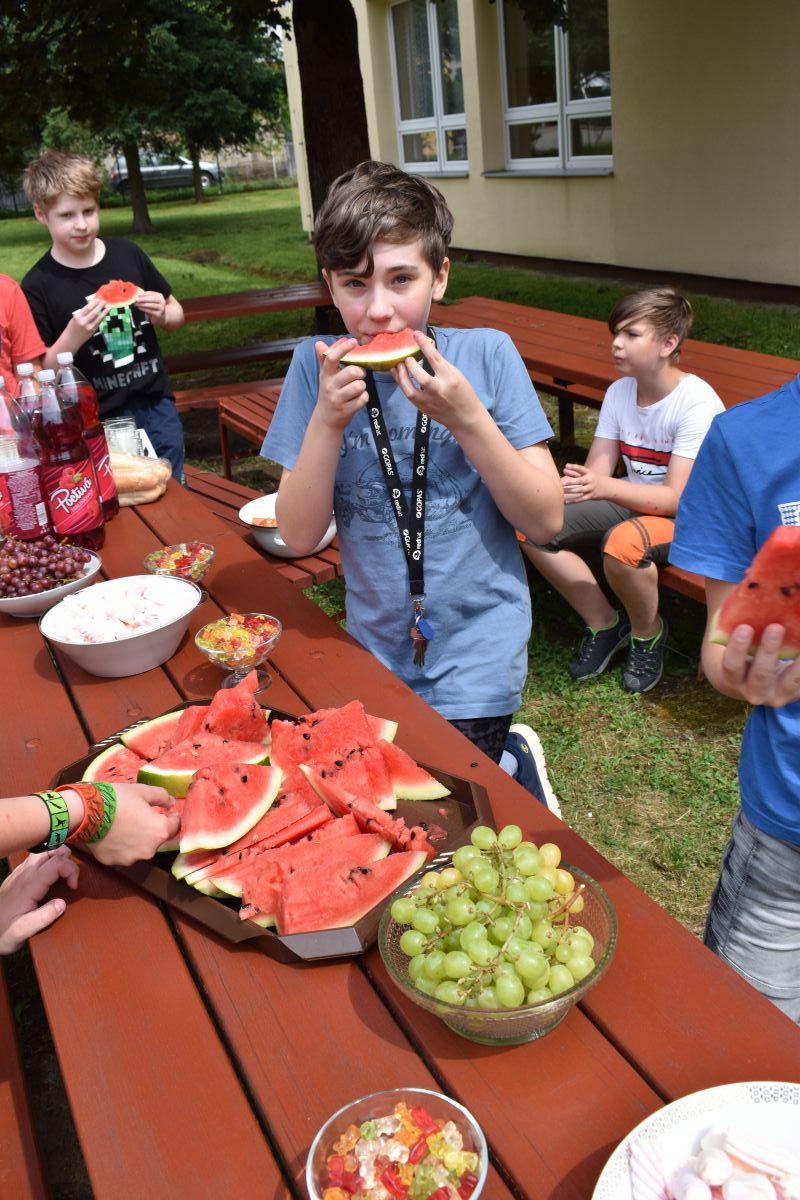 Začali jsme lezeckou stěnou a hráli míčové hry. Následně jsme si na zahradě dali předkrm v podobě melounu, ovoce, sladkostí a završili jsme to špekáčkem.