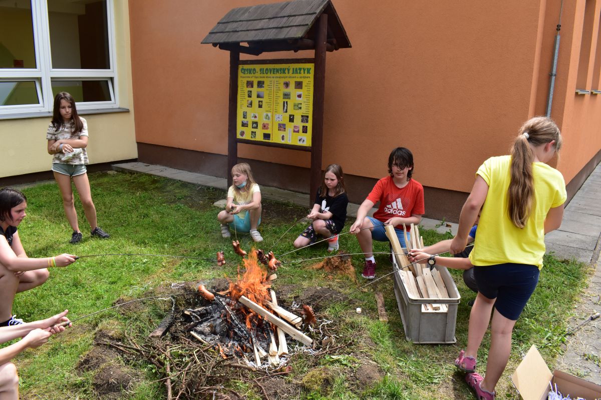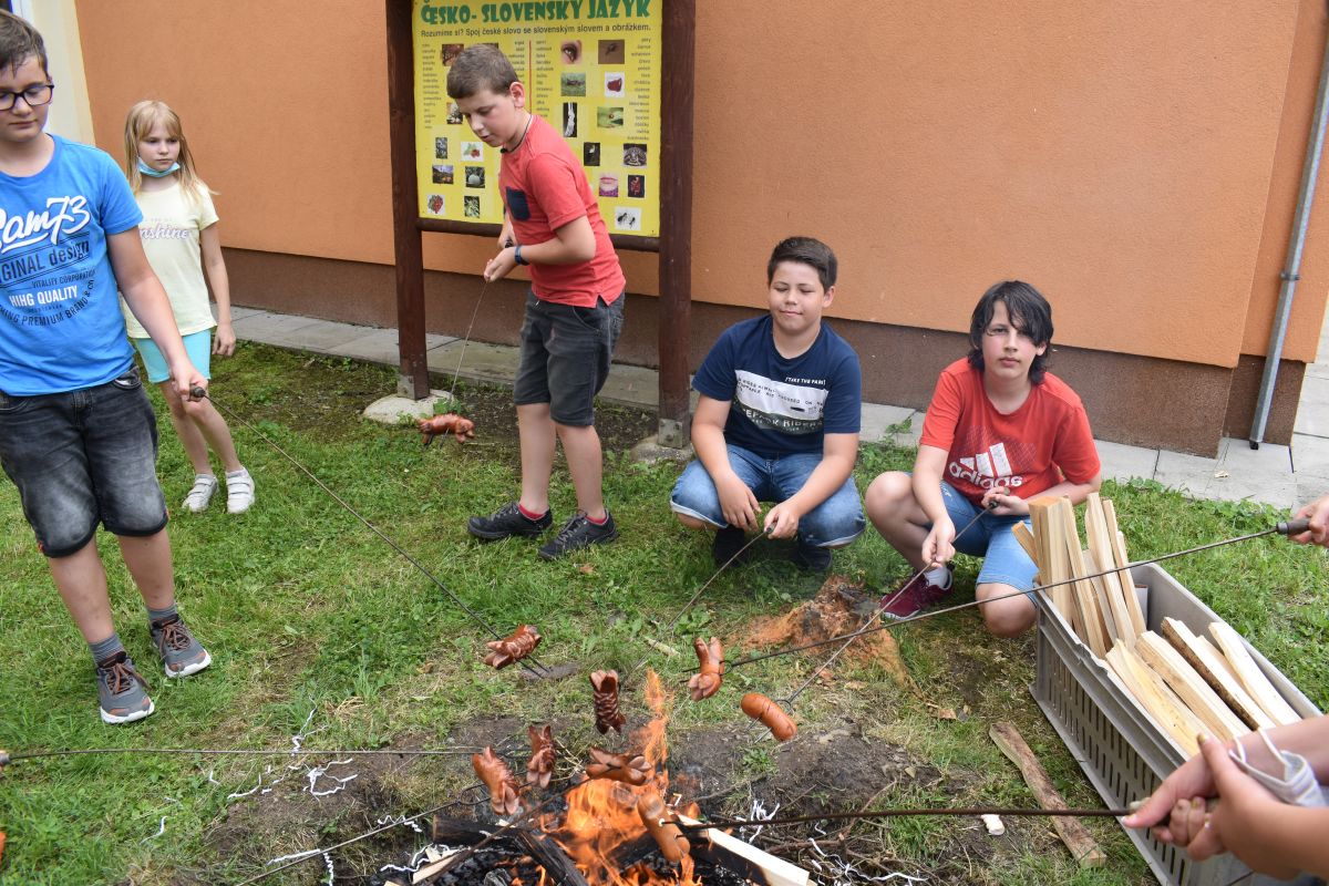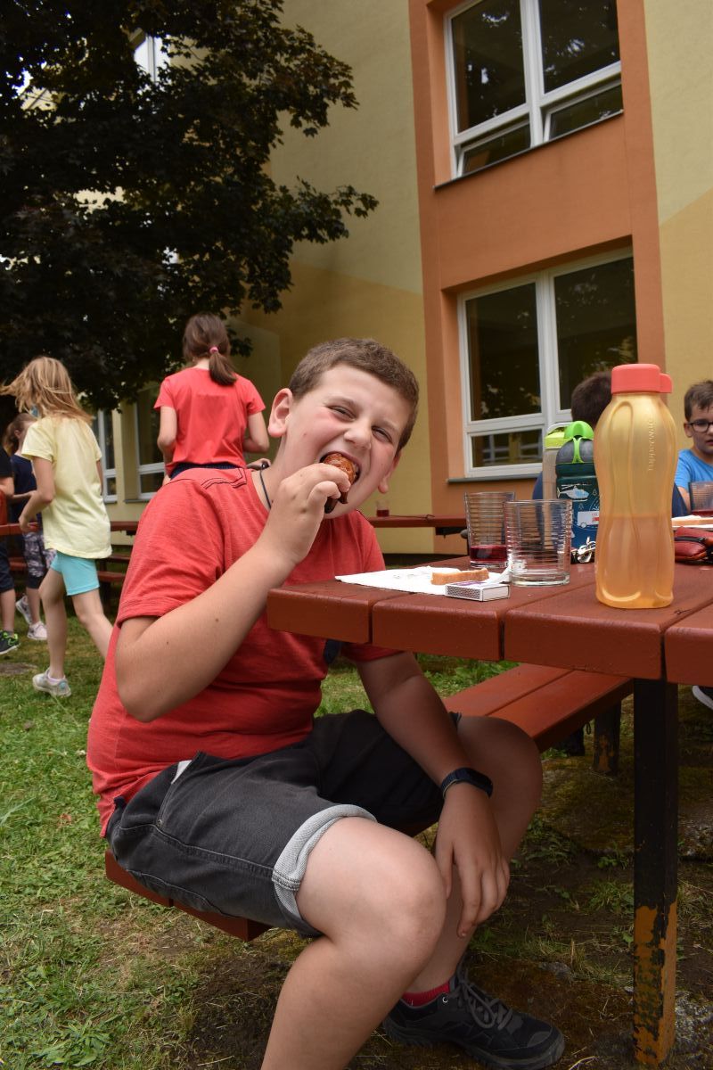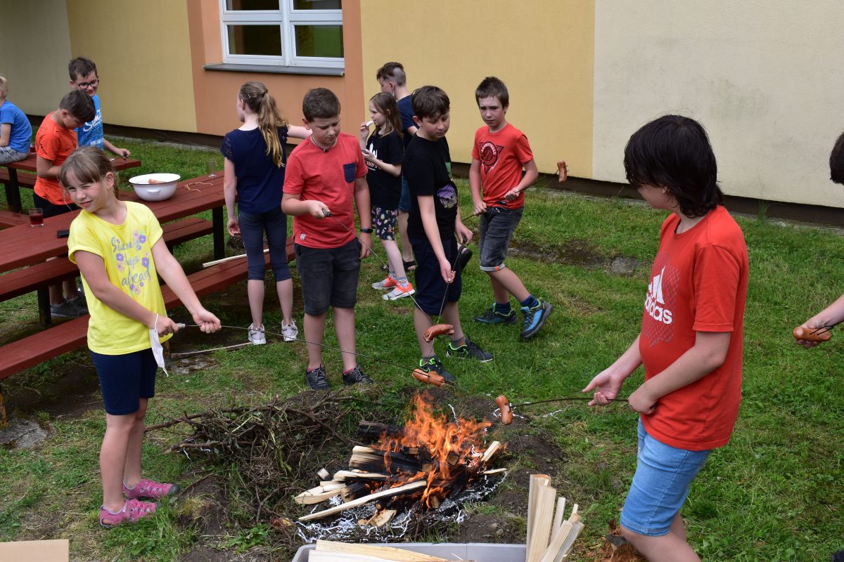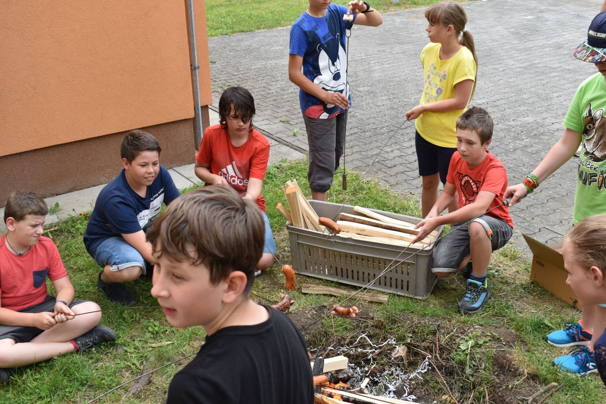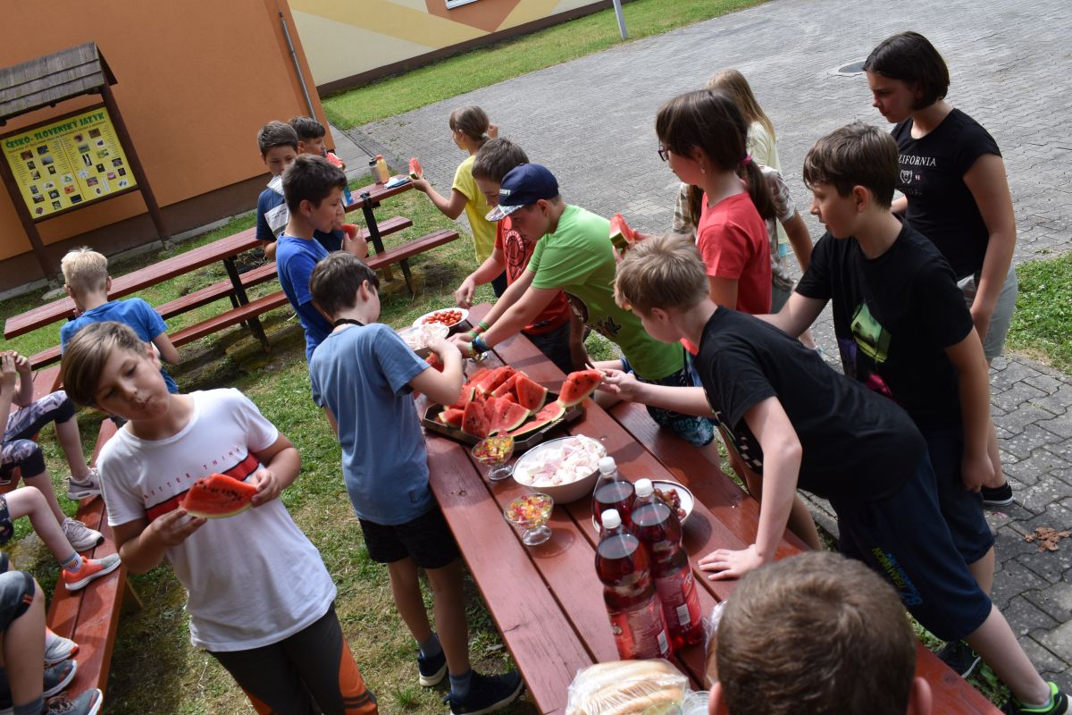 Začali jsme lezeckou stěnou a hráli míčové hry. Následně jsme si na zahradě dali předkrm v podobě melounu, ovoce, sladkostí a završili jsme to špekáčkem.