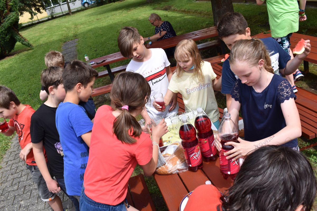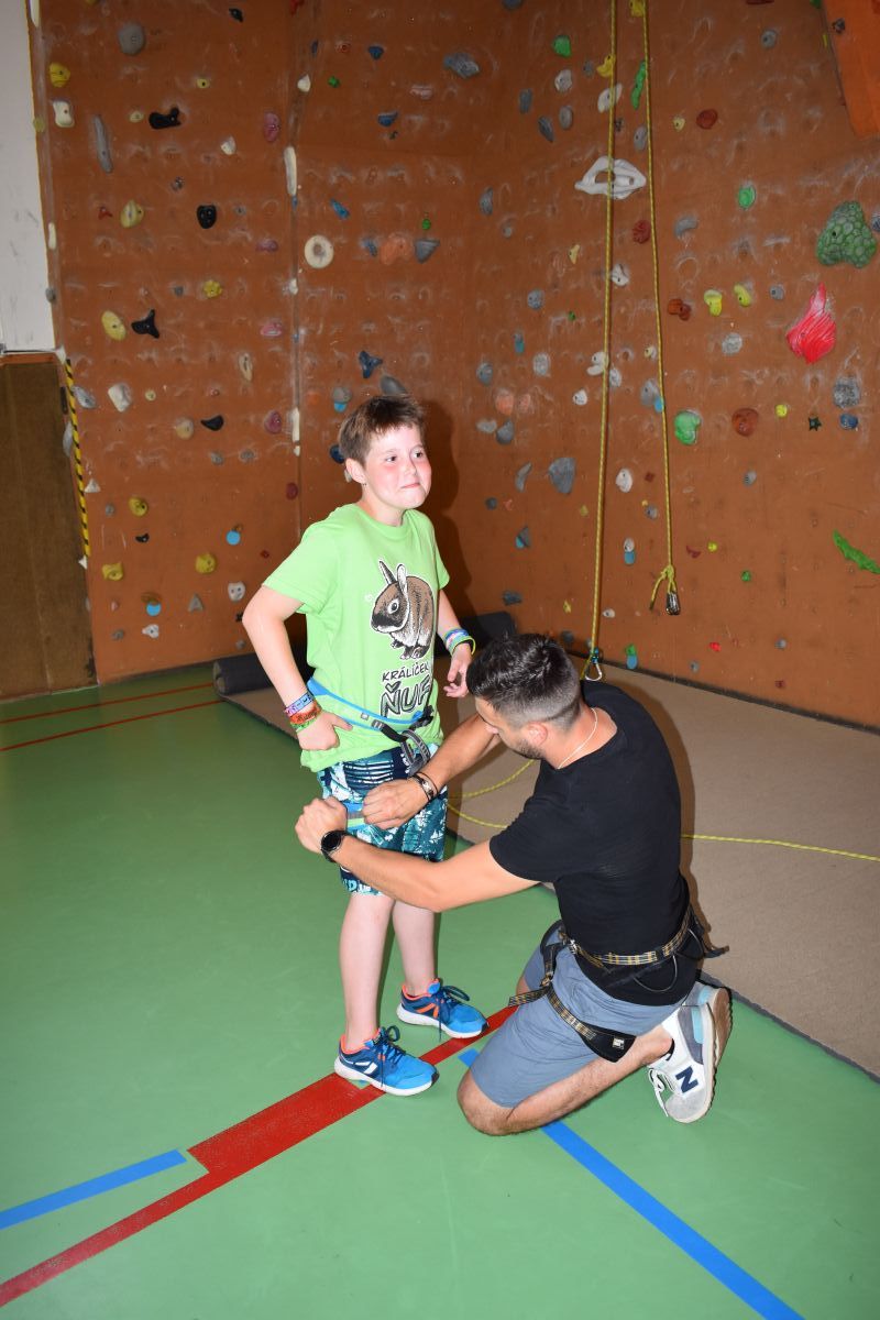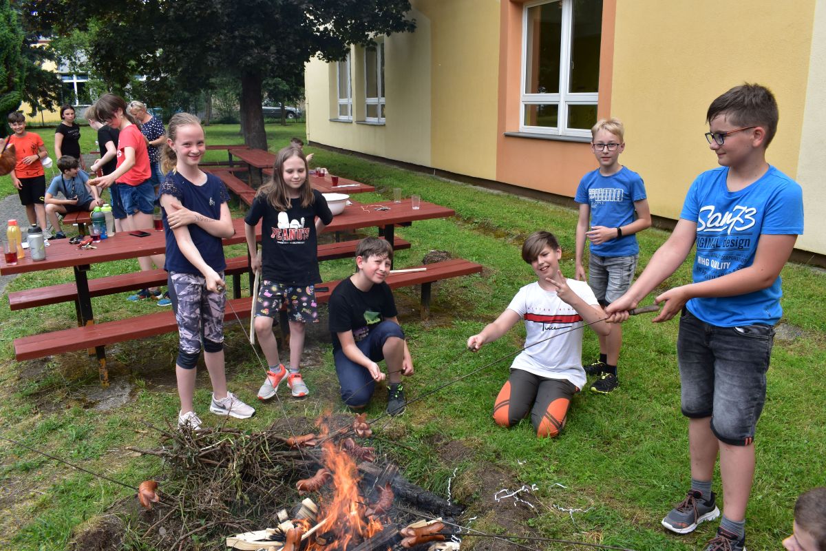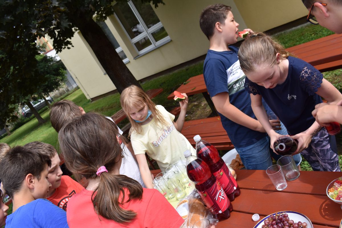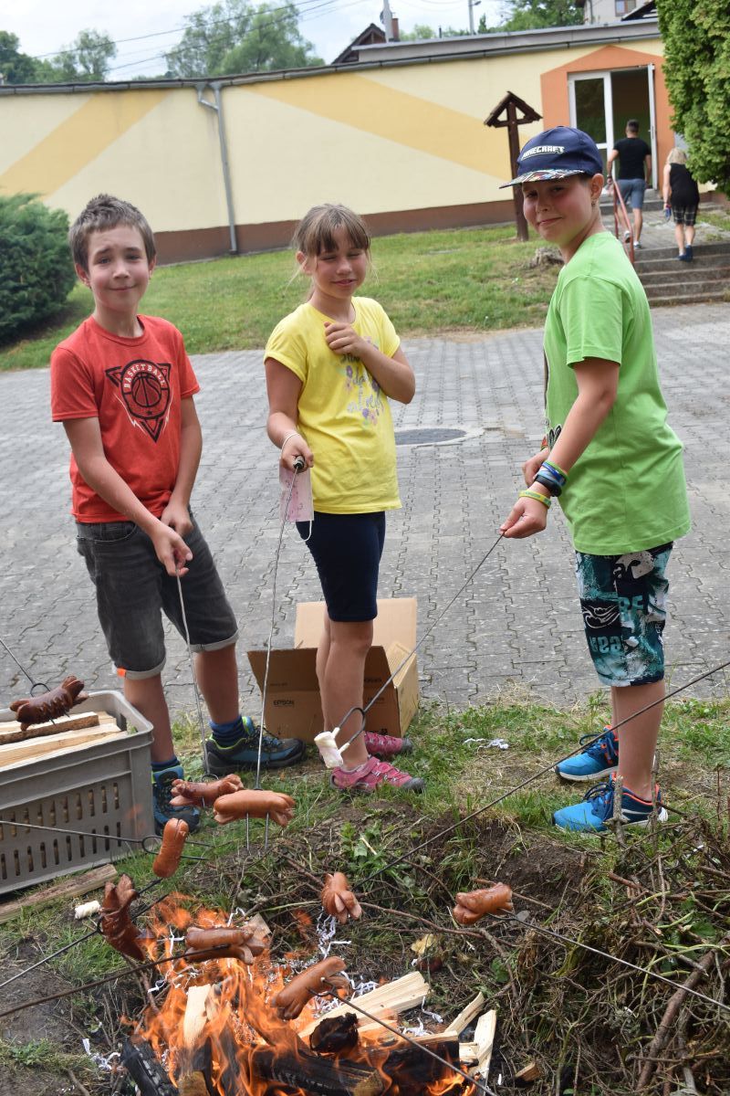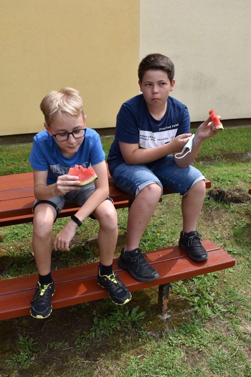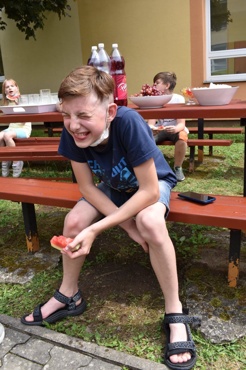 Začali jsme lezeckou stěnou a hráli míčové hry. Následně jsme si na zahradě dali předkrm v podobě melounu, ovoce, sladkostí a završili jsme to špekáčkem.