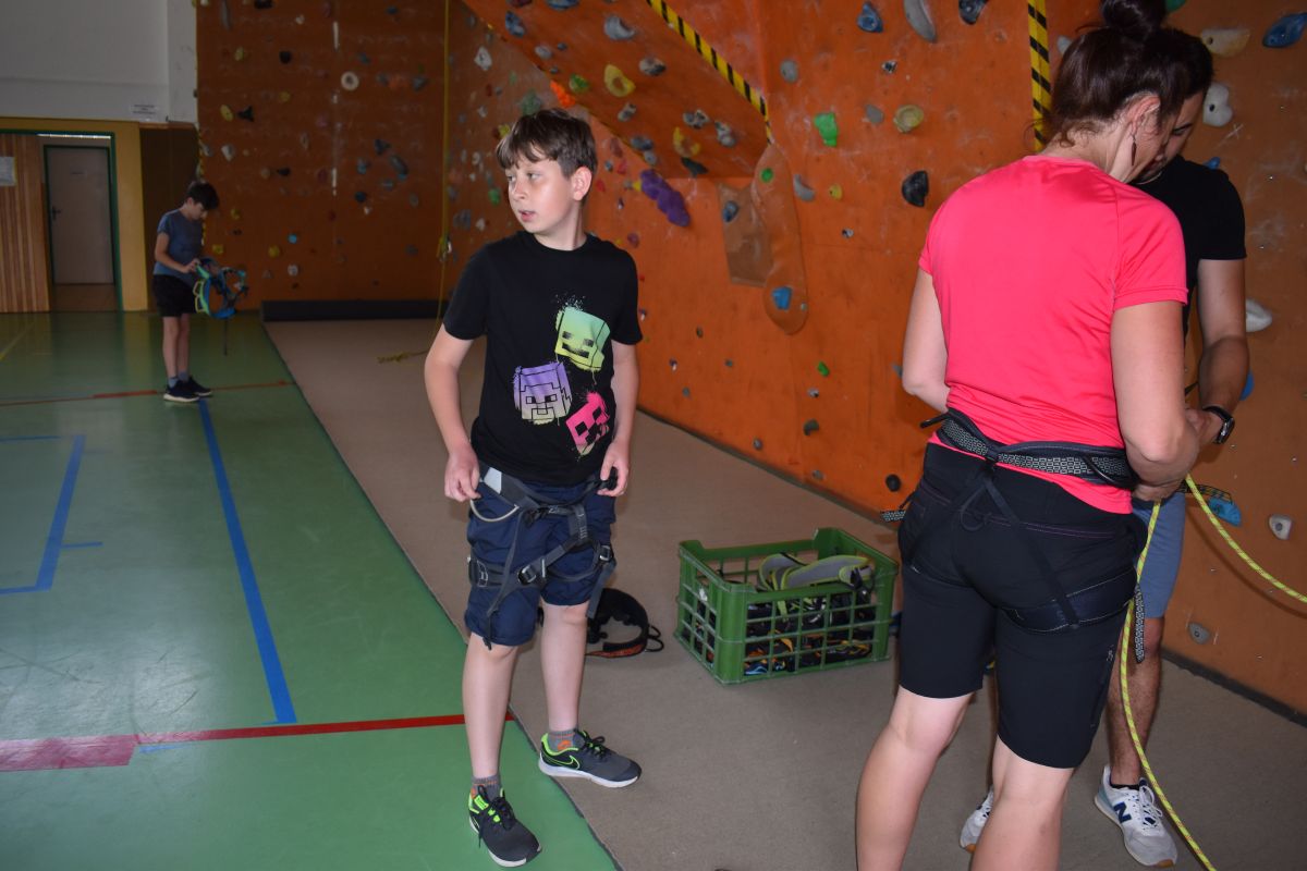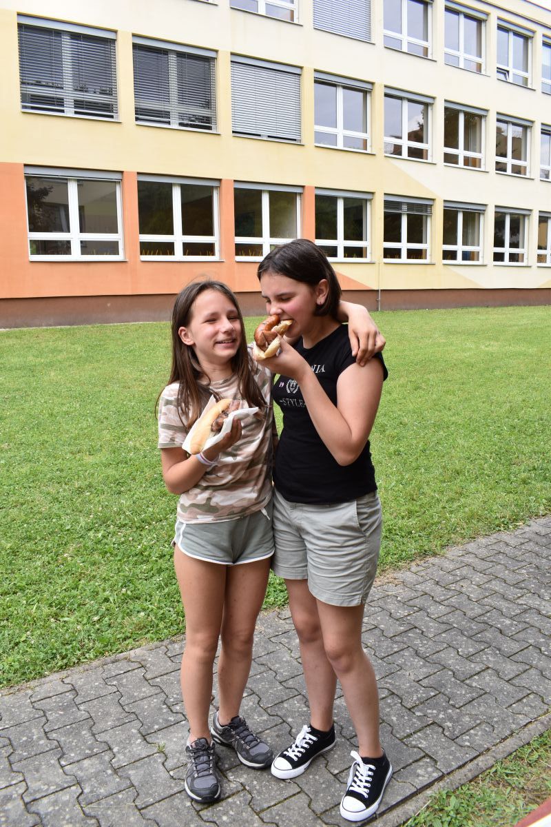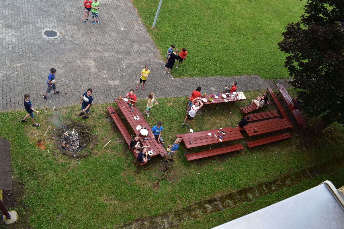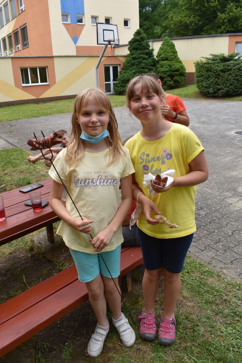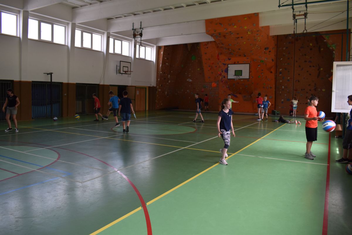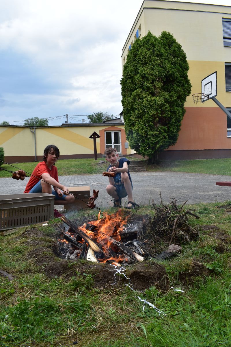 Začali jsme lezeckou stěnou a hráli míčové hry. Následně jsme si na zahradě dali předkrm v podobě melounu, ovoce, sladkostí a završili jsme to špekáčkem.