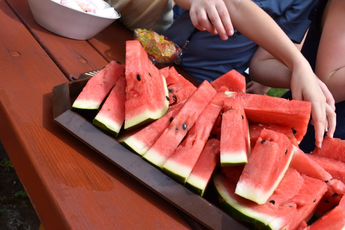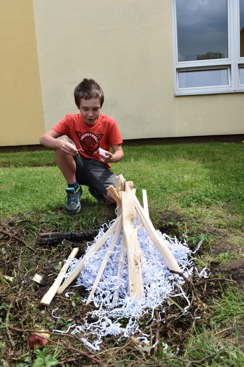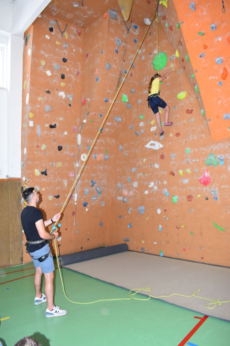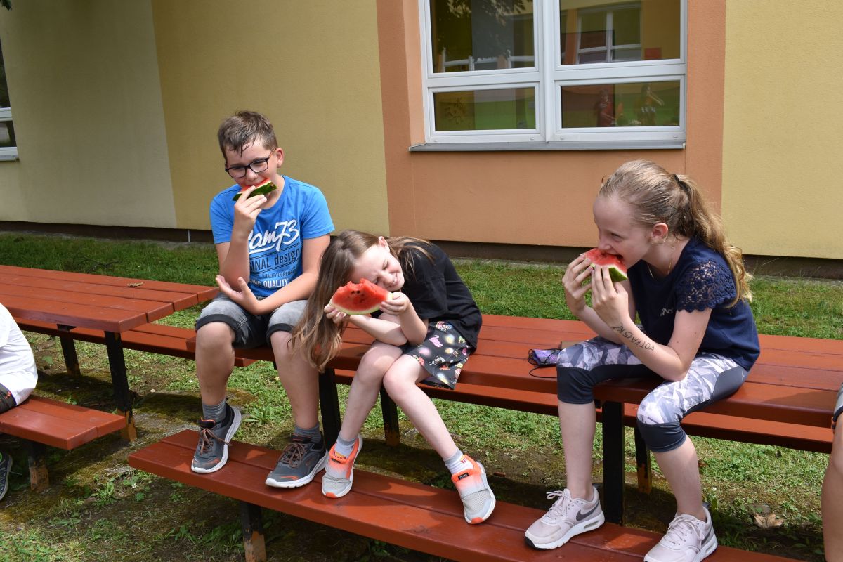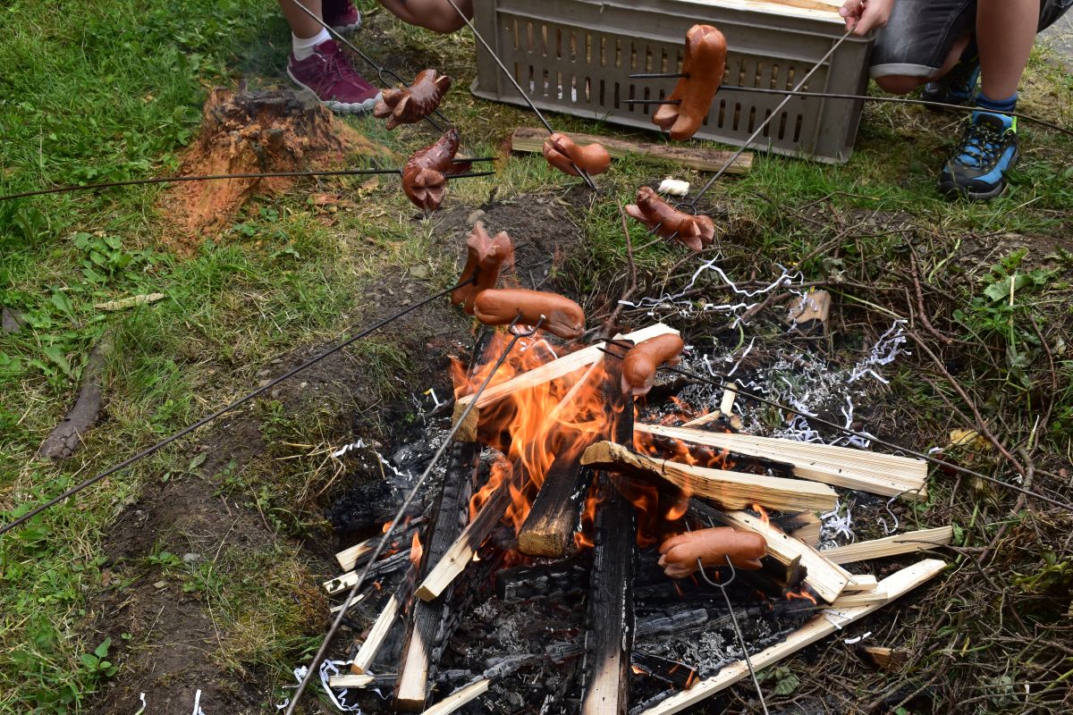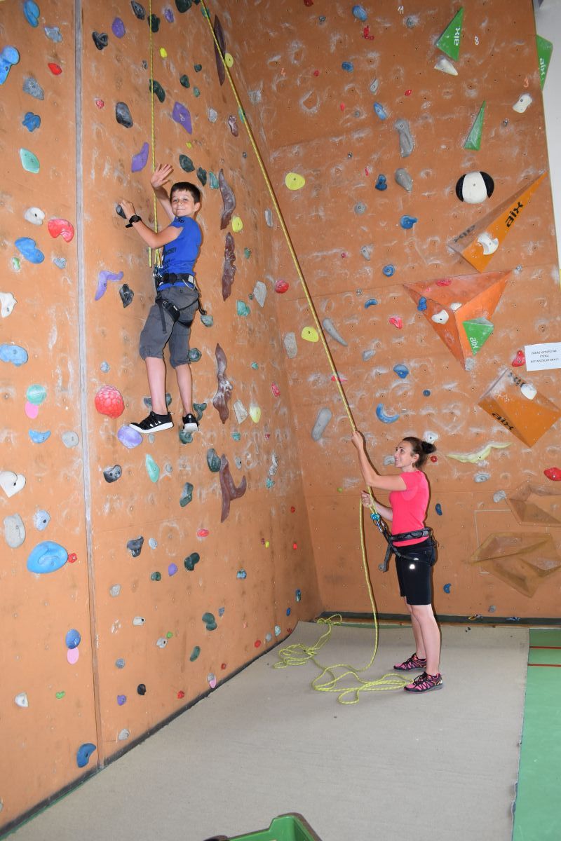Začali jsme lezeckou stěnou a hráli míčové hry. Následně jsme si na zahradě dali předkrm v podobě melounu, ovoce, sladkostí a završili jsme to špekáčkem.