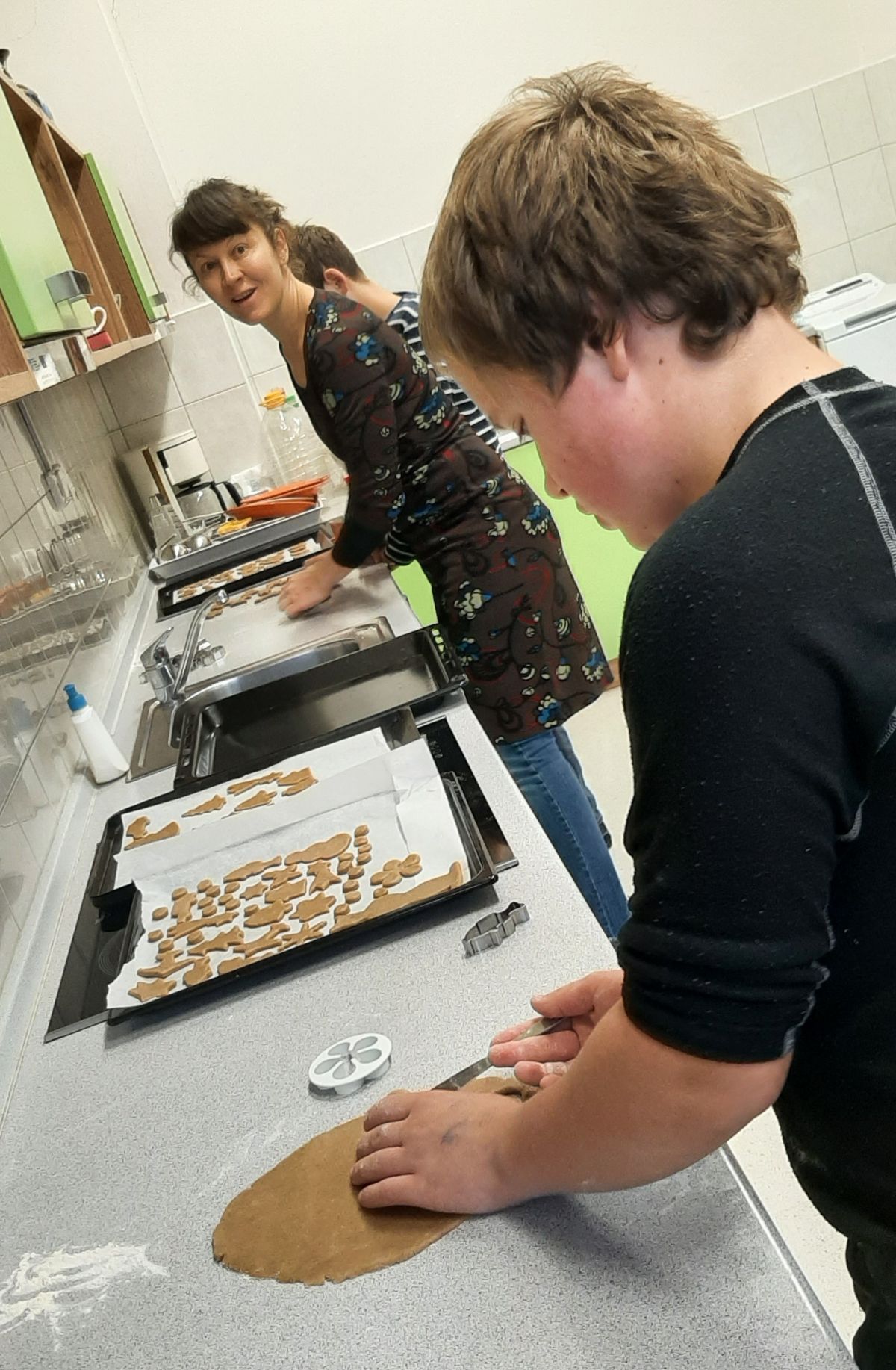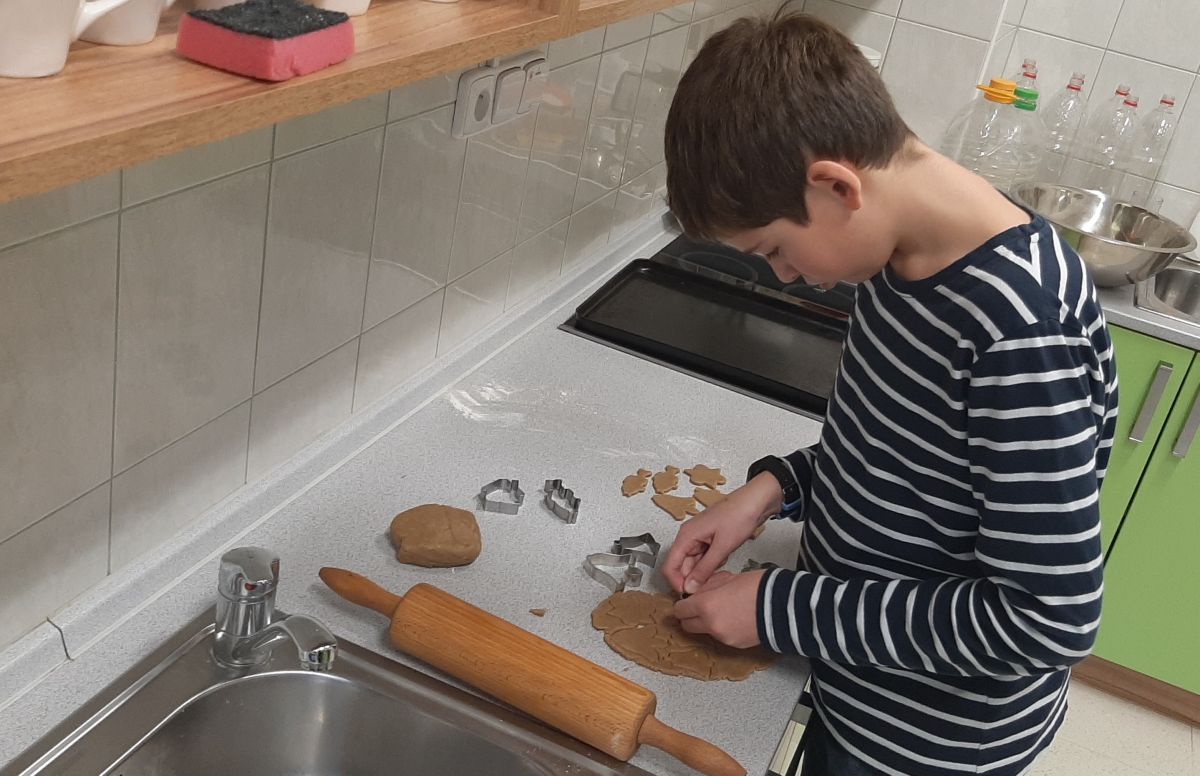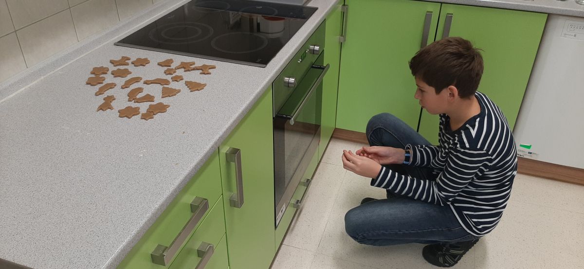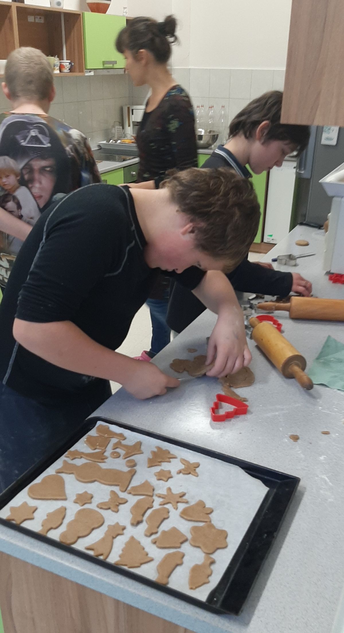 „Po instruktáži od naší paní asistentky jsme se pustili do díla. Rozvážíme těsto, rozválet, ale pozor! V našem těstě je máslo a samé dobroty, takže, kdo je dlouho zahřívá, tak nic nerozválí. Daří se, někdy ne, a zase dokola. Kouzlíme různé tvary-a pak šup do trouby. To, to voní. A to uklízení. Dalo nám to zabrat. Teď to nejhorší-schovat na příští týden část perníčků-proč? No přece budeme zdobit!!!“