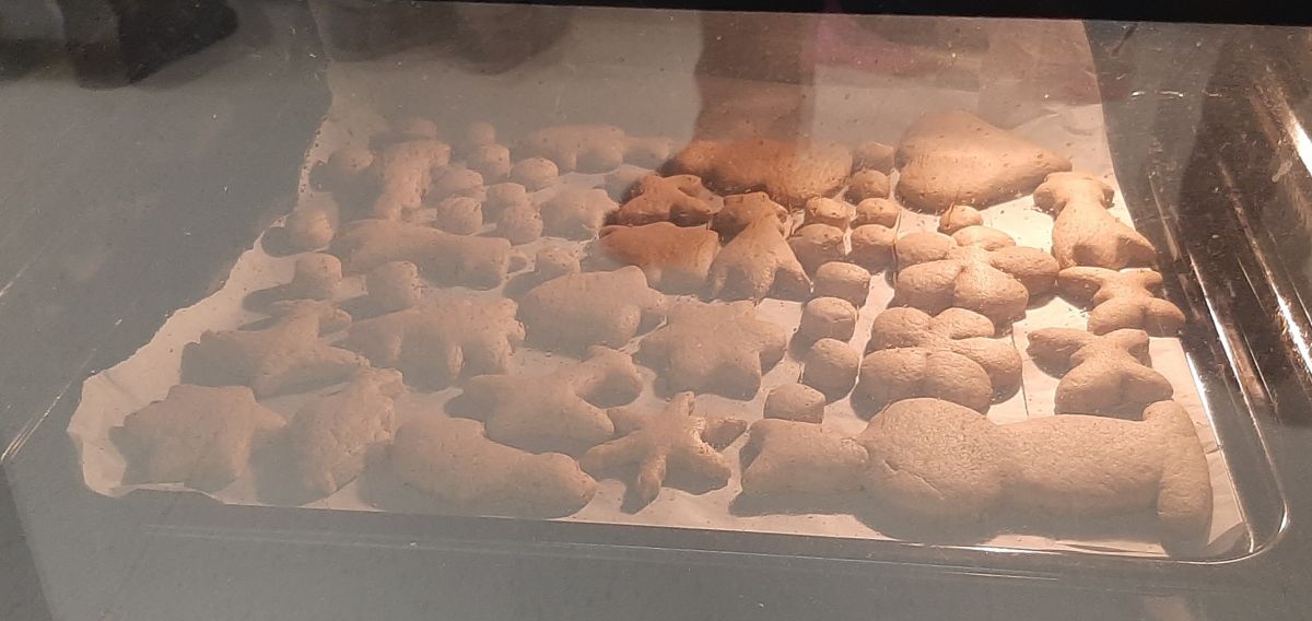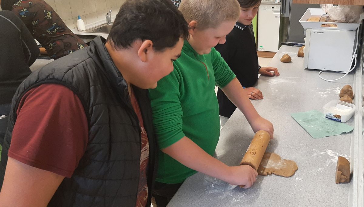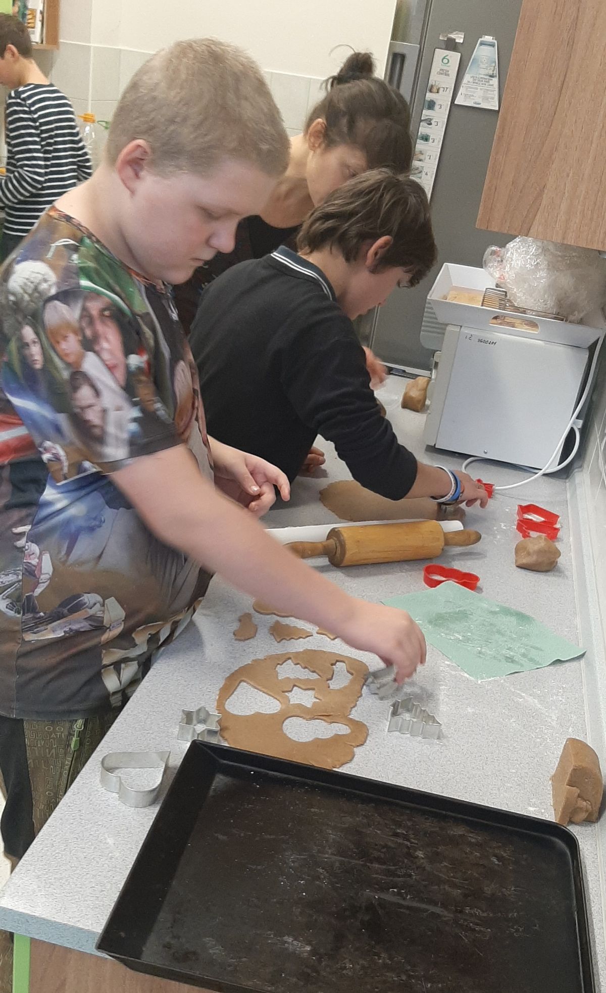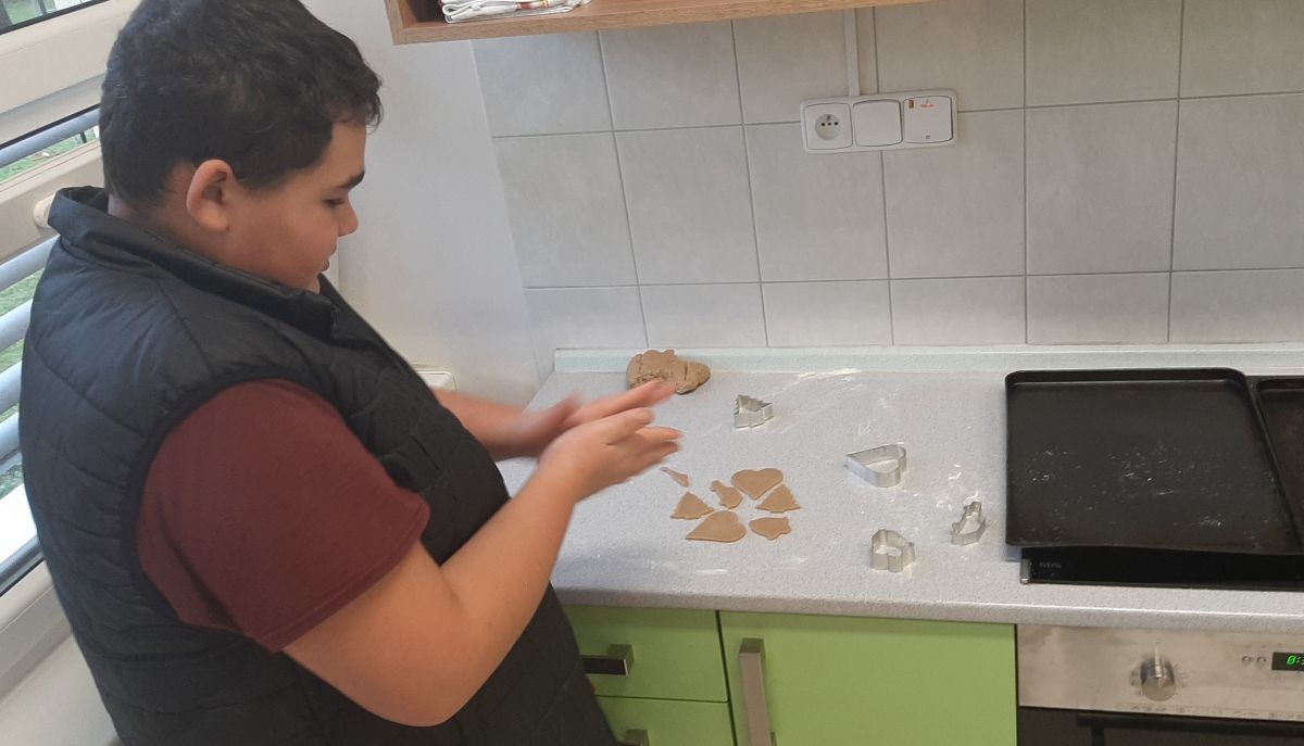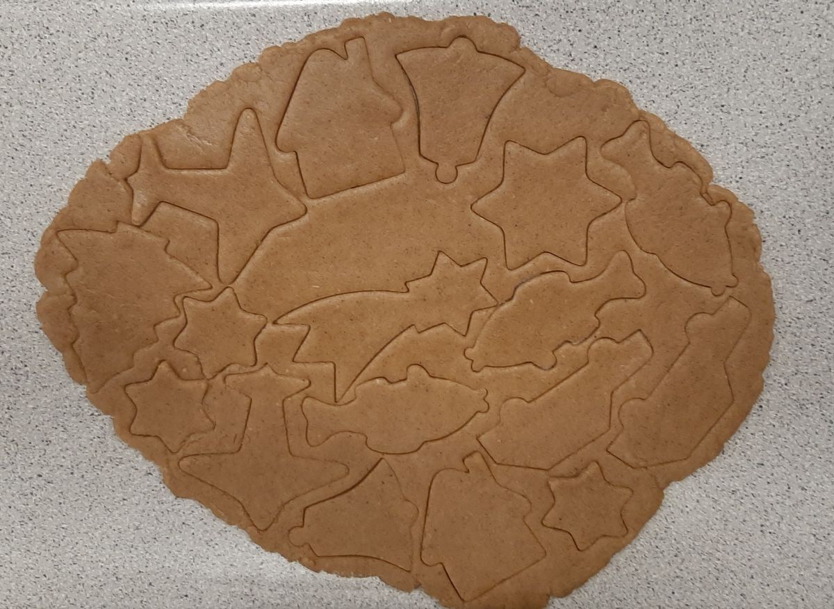 „Po instruktáži od naší paní asistentky jsme se pustili do díla. Rozvážíme těsto, rozválet, ale pozor! V našem těstě je máslo a samé dobroty, takže, kdo je dlouho zahřívá, tak nic nerozválí. Daří se, někdy ne, a zase dokola. Kouzlíme různé tvary-a pak šup do trouby. To, to voní. A to uklízení. Dalo nám to zabrat. Teď to nejhorší-schovat na příští týden část perníčků-proč? No přece budeme zdobit!!!“