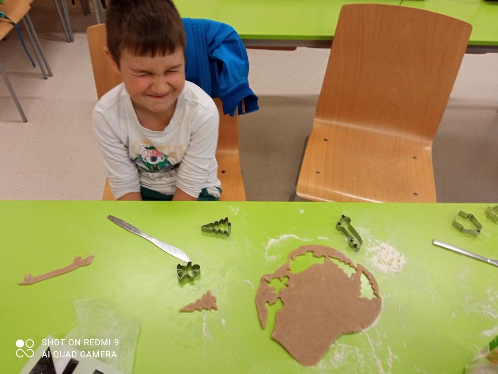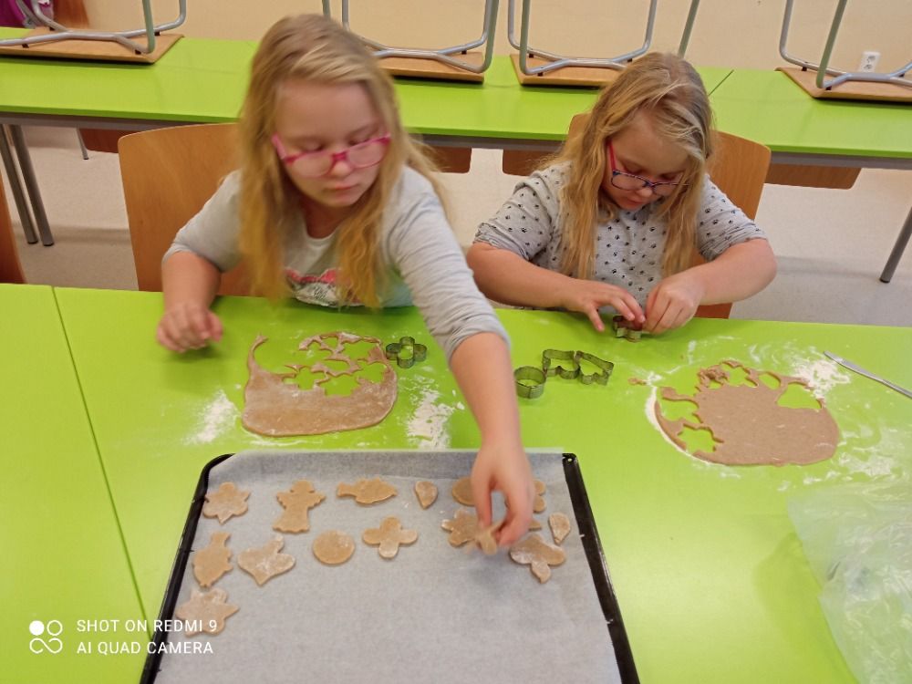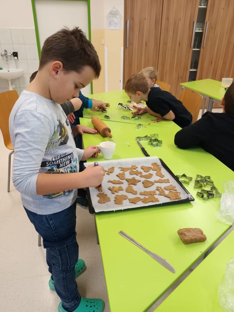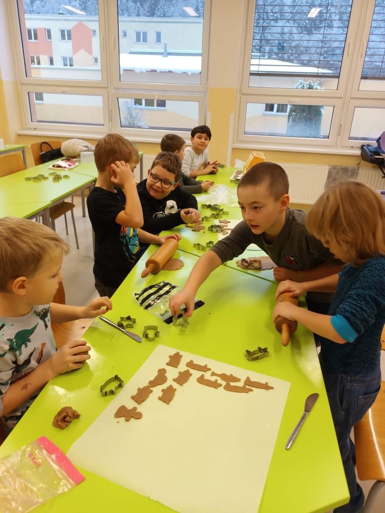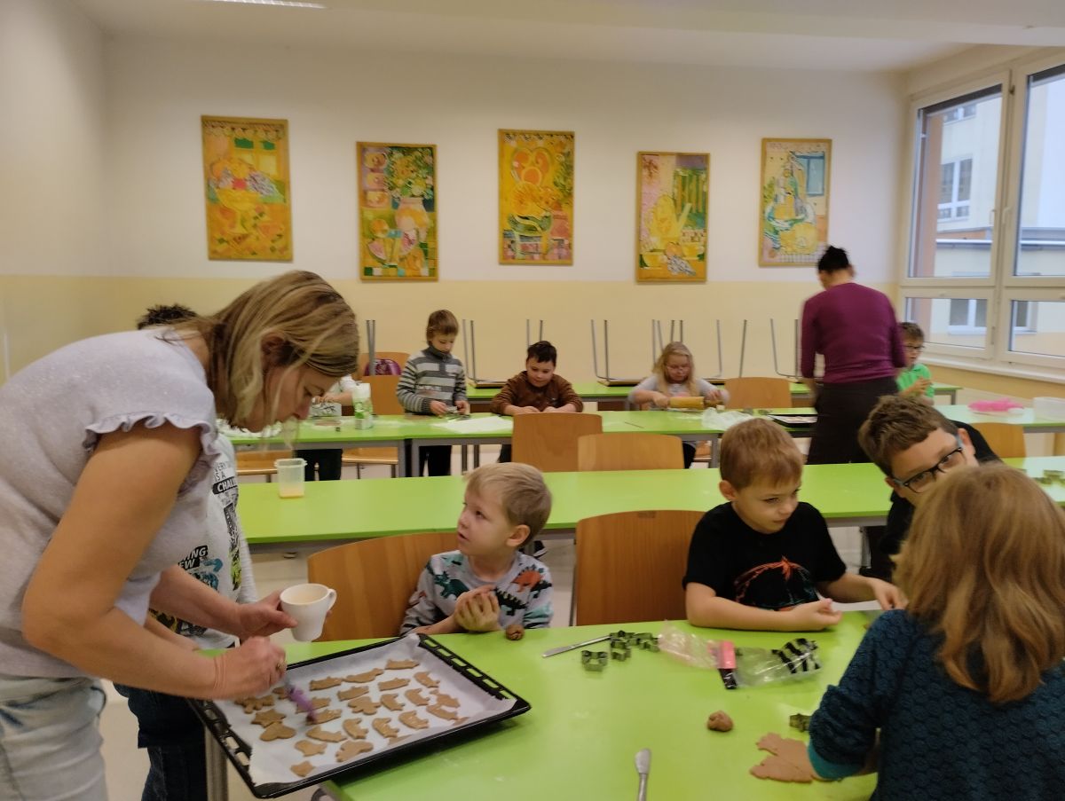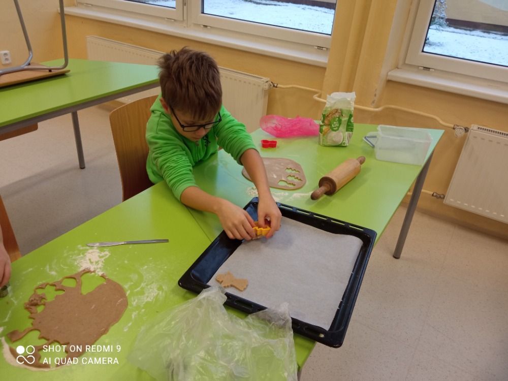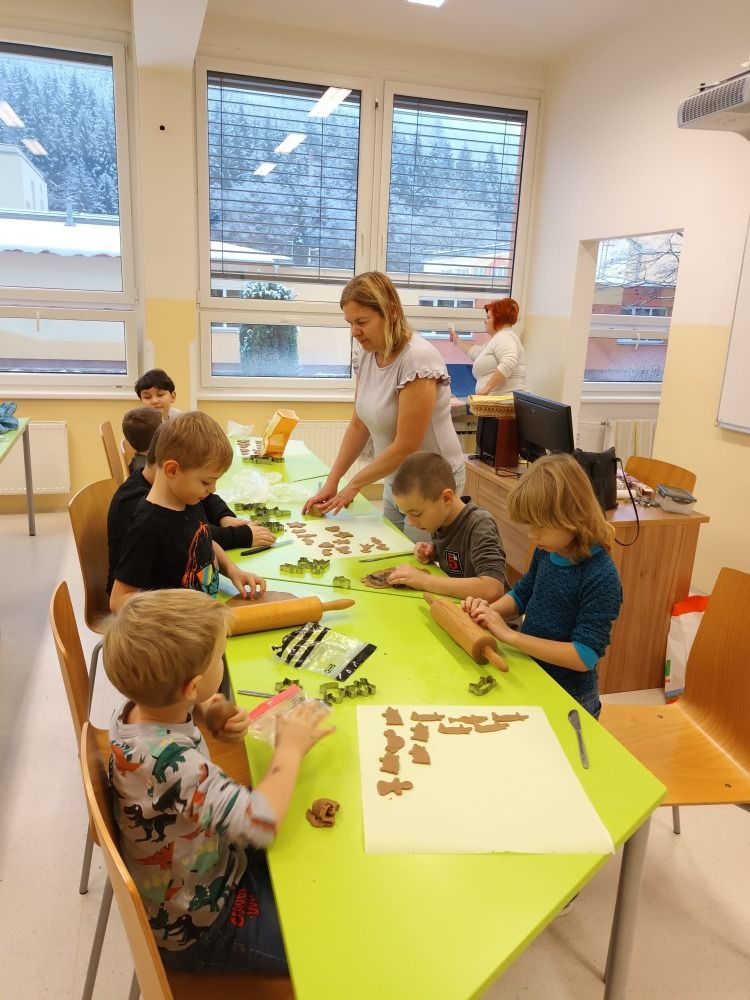 Všichni se pustili s nadšením do výroby perníčků. Paní učitelky nachystaly doma podle osvědčených receptů těsto. Po rozválení válečkem děti samostatně vykrajovaly a ukládaly na pečící papír. Za chvíli se linula kolem medová vůně a kouzlo Vánoc se zase o malý kousek přiblížilo.