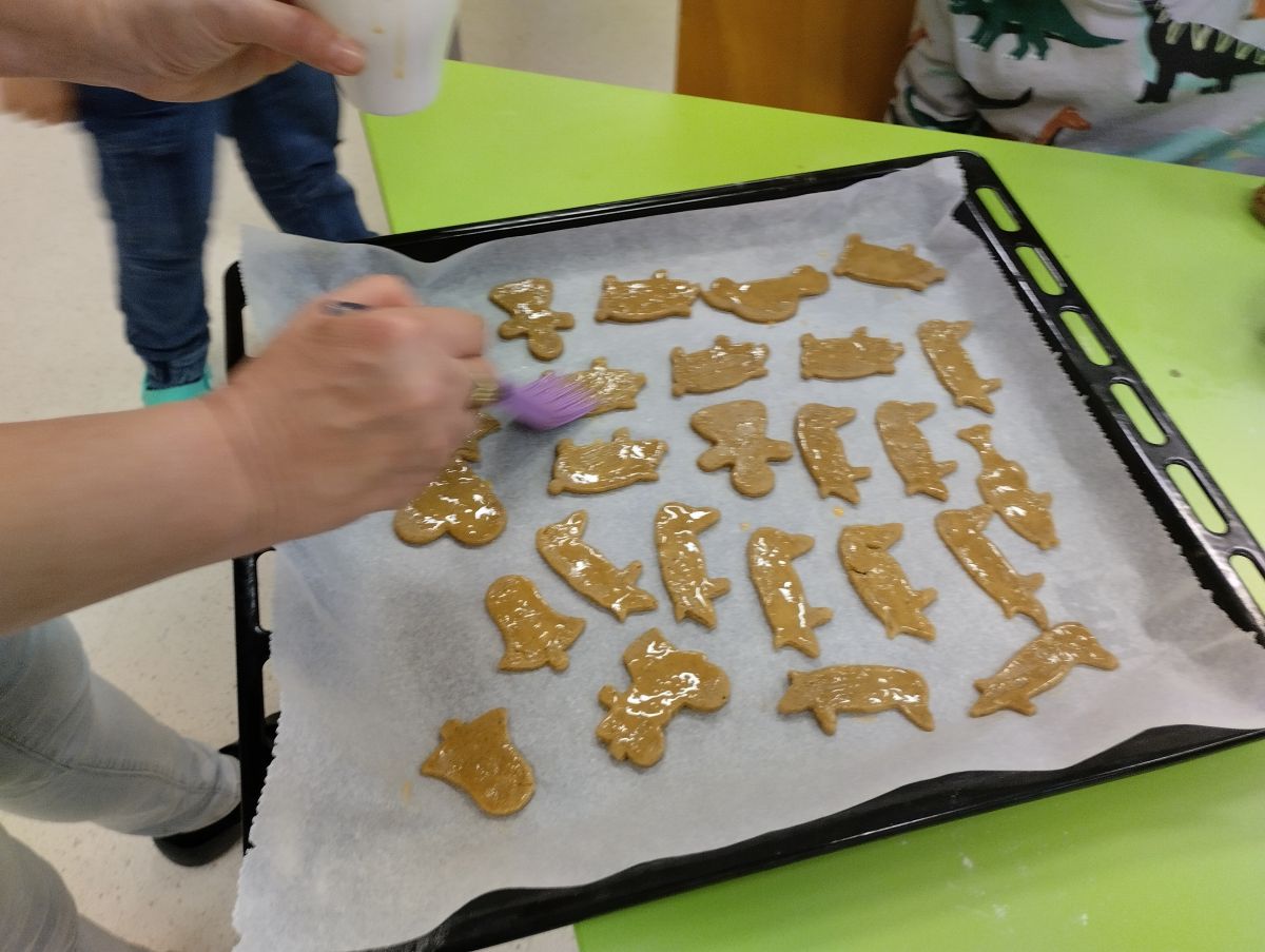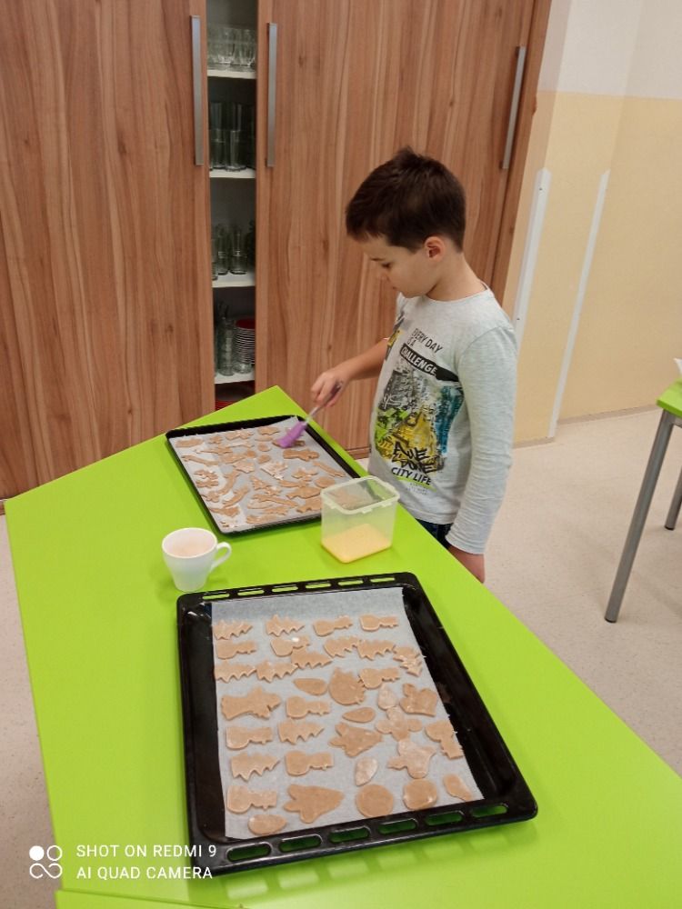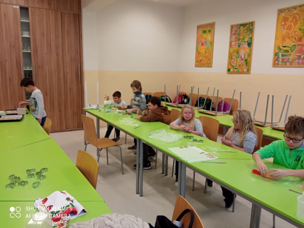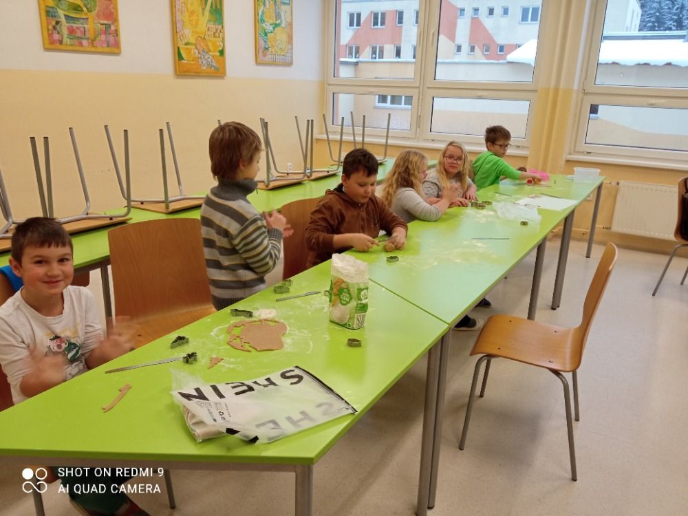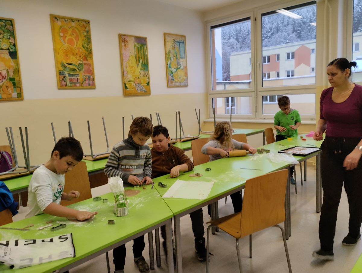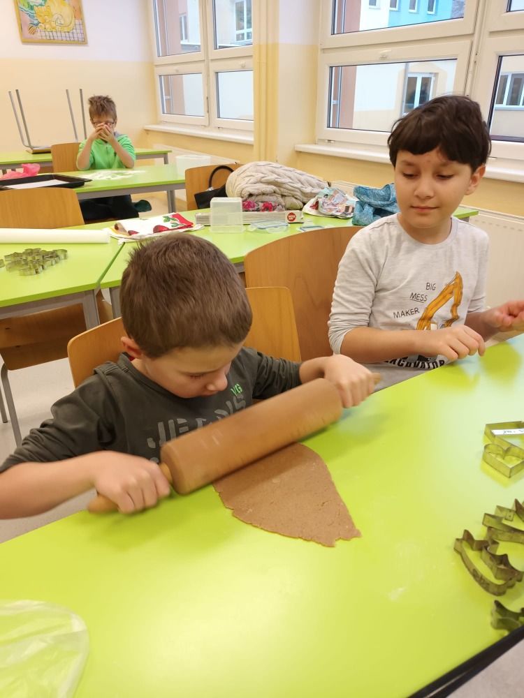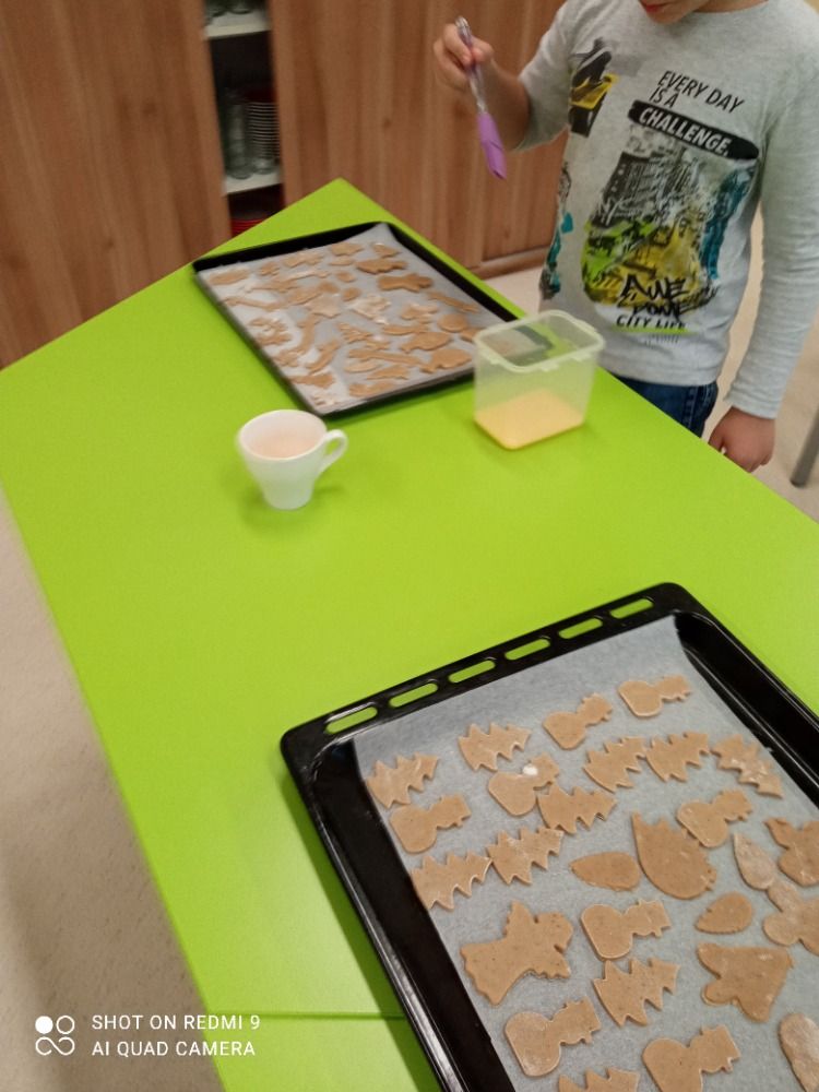 Všichni se pustili s nadšením do výroby perníčků. Paní učitelky nachystaly doma podle osvědčených receptů těsto. Po rozválení válečkem děti samostatně vykrajovaly a ukládaly na pečící papír. Za chvíli se linula kolem medová vůně a kouzlo Vánoc se zase o malý kousek přiblížilo.