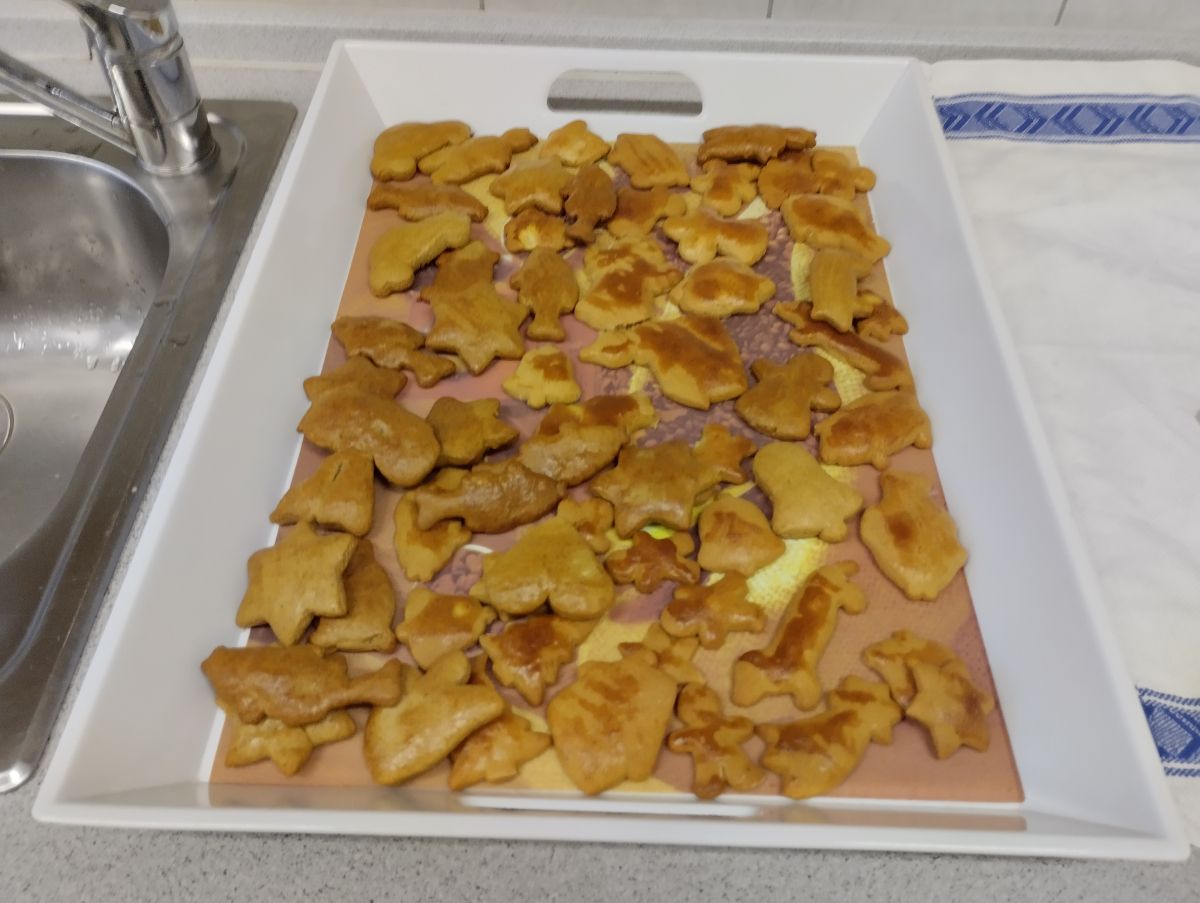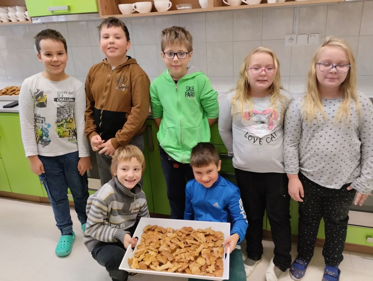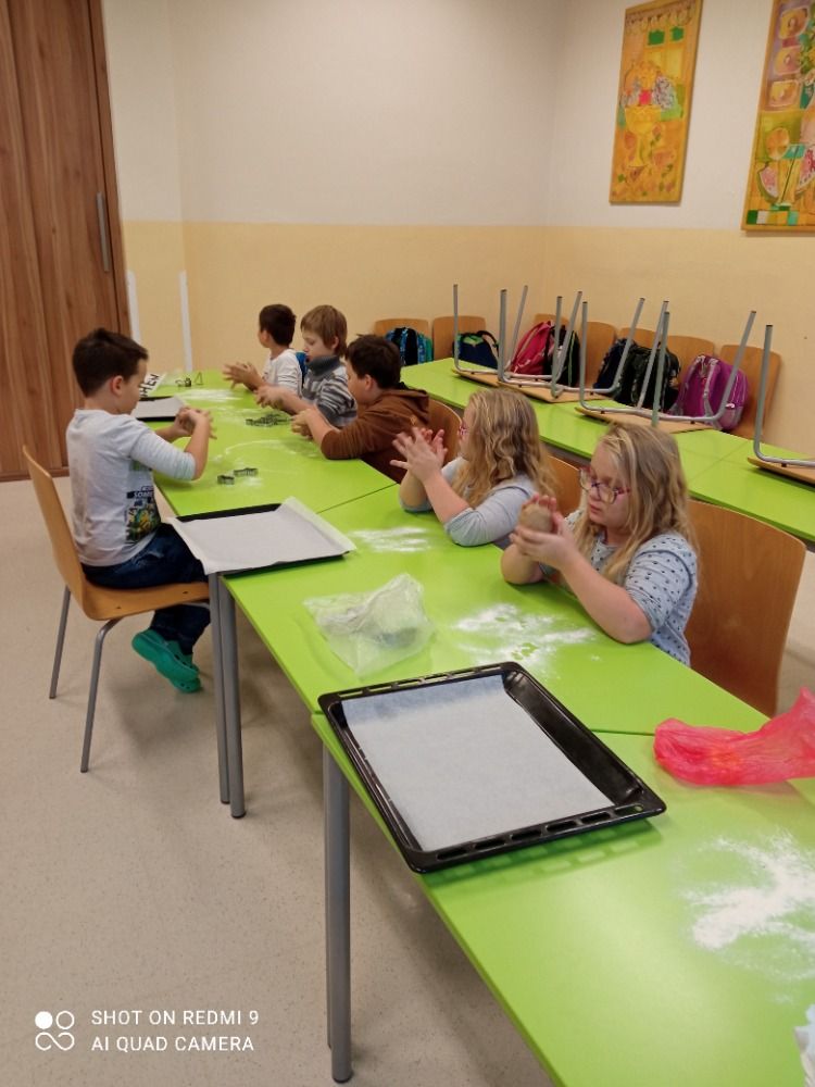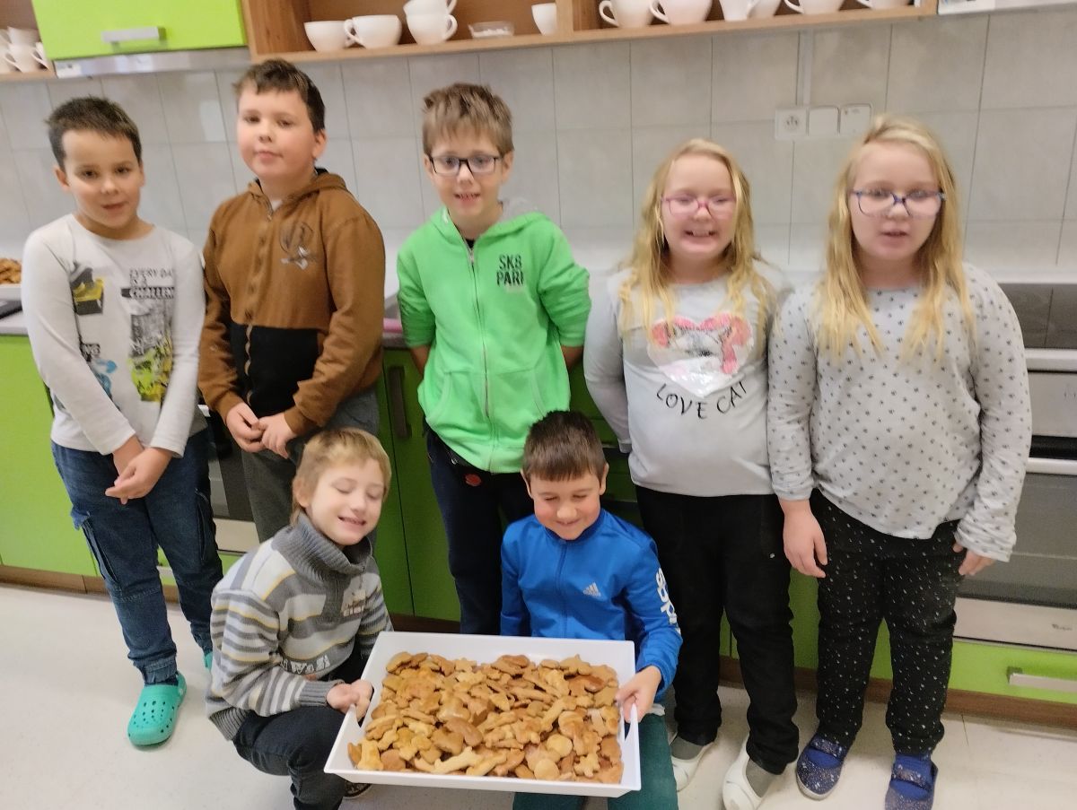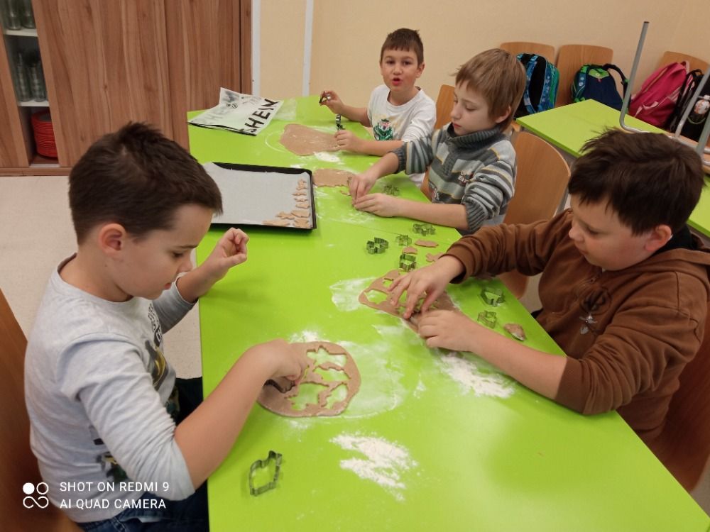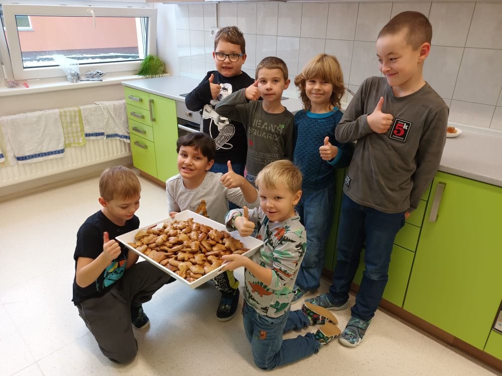 Všichni se pustili s nadšením do výroby perníčků. Paní učitelky nachystaly doma podle osvědčených receptů těsto. Po rozválení válečkem děti samostatně vykrajovaly a ukládaly na pečící papír. Za chvíli se linula kolem medová vůně a kouzlo Vánoc se zase o malý kousek přiblížilo.