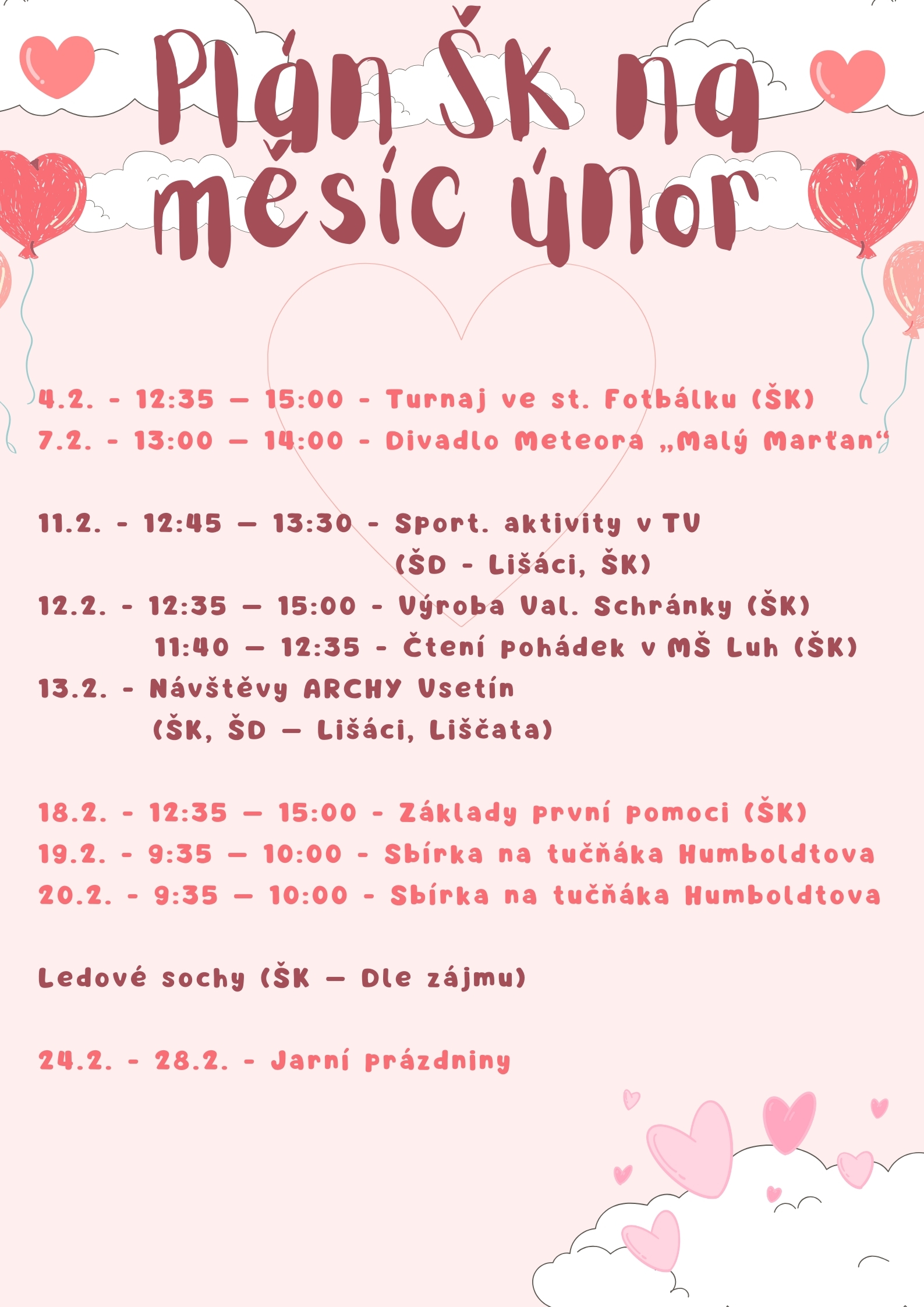 • V době jarních prázdnin (24. - 28. 2. 2025) je činnost ŠK zajištěna v případě zájmu ze strany rodičů, a to při minimálním počtu 10 přihlášených žáků.