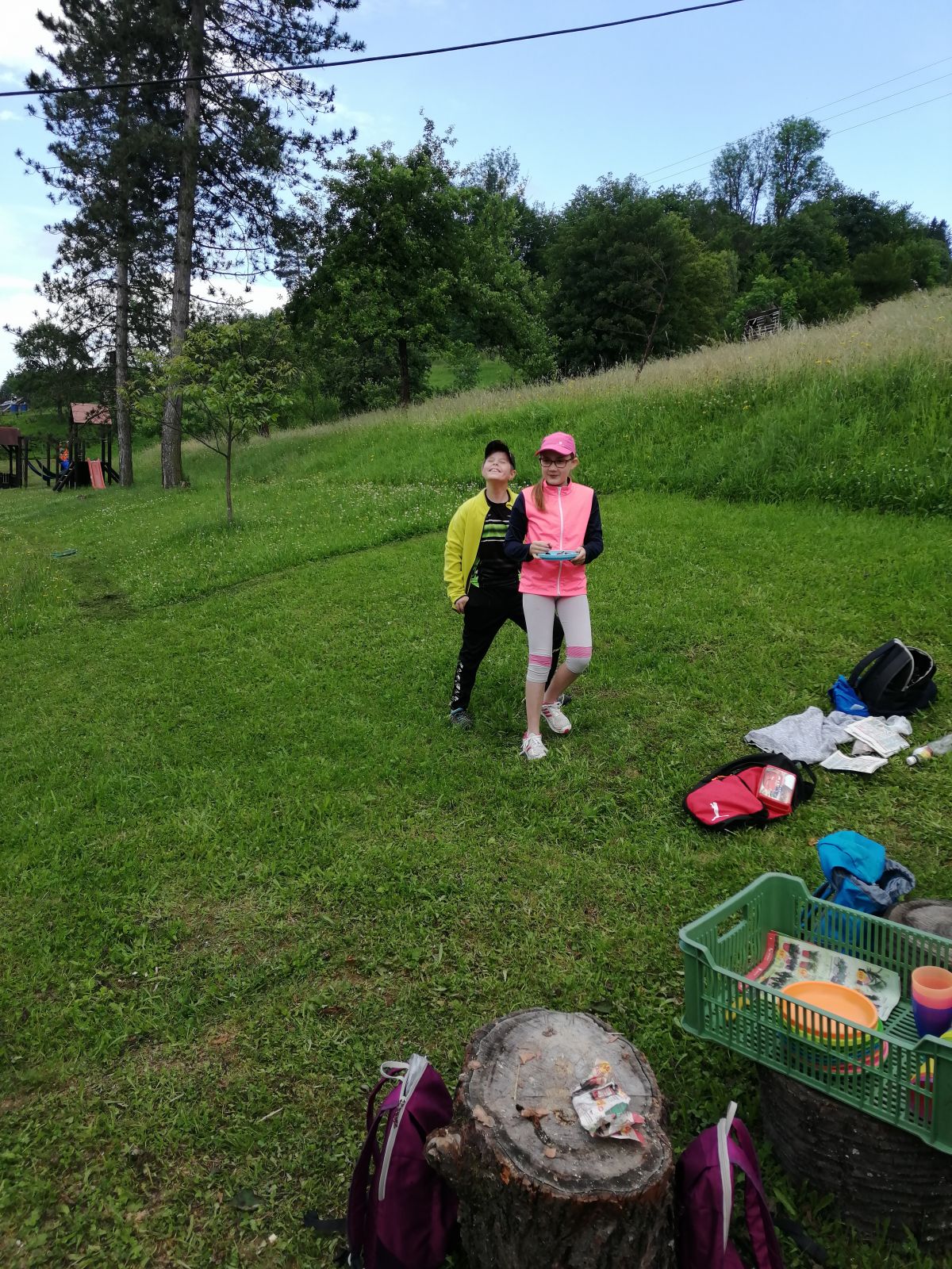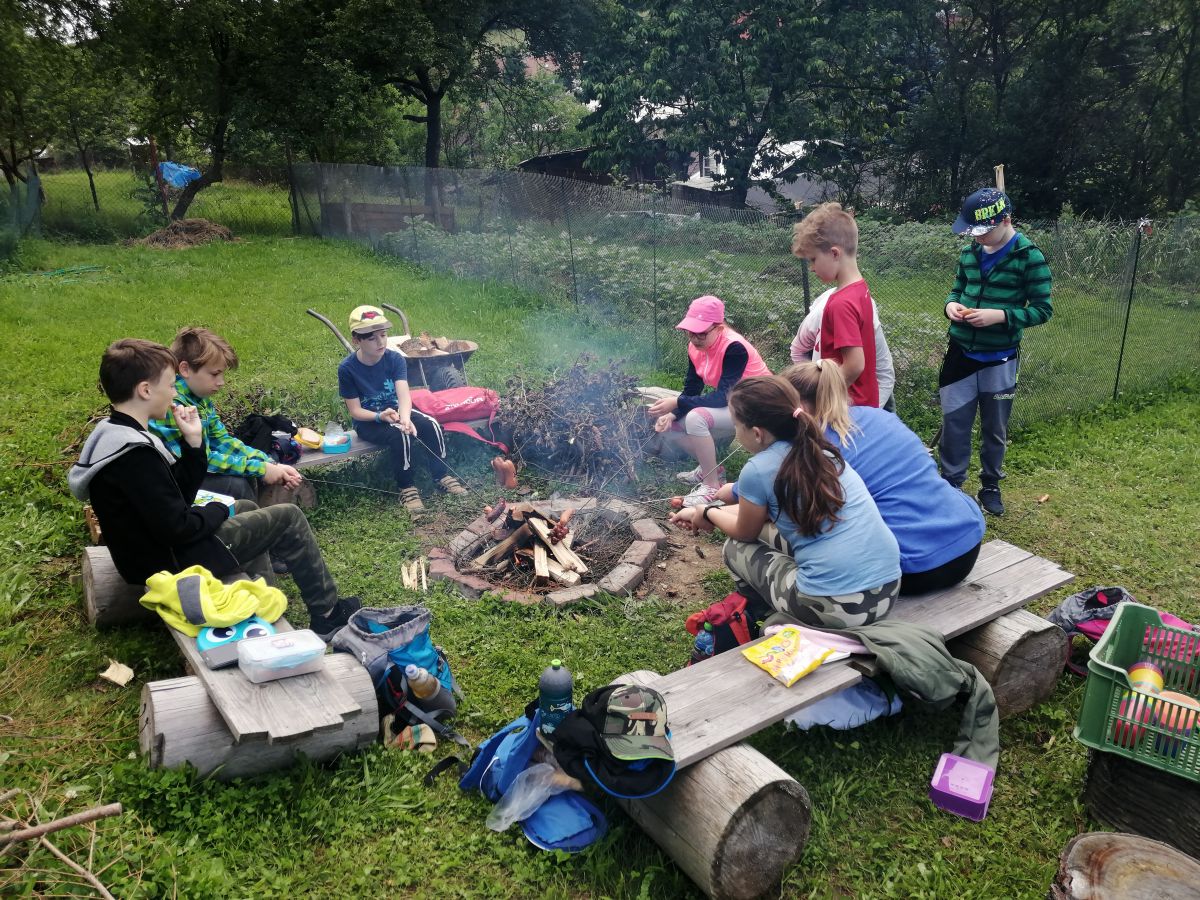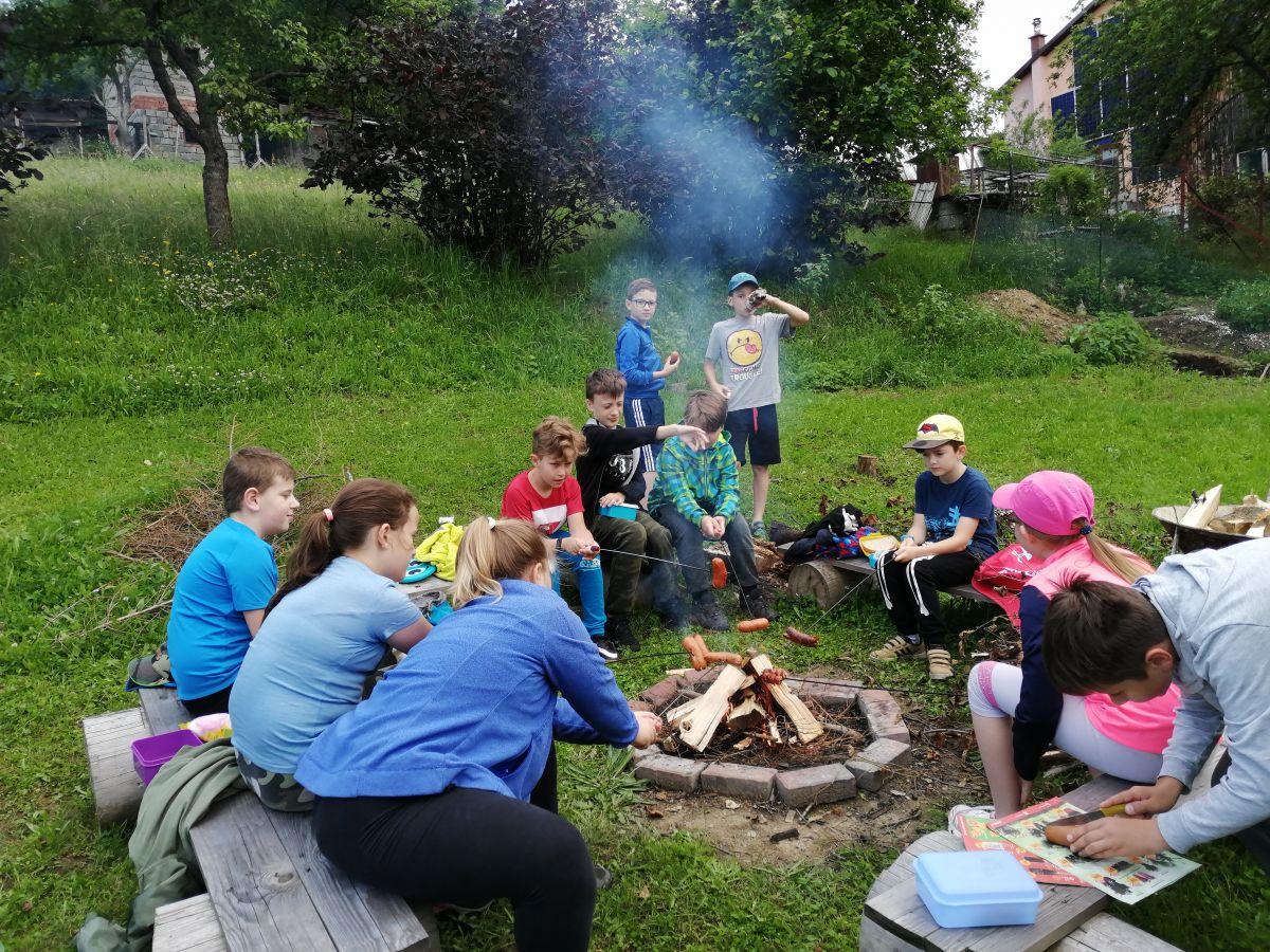 Čekalo na nás připravené tábořiště, kde si děti opekly špekáčky, marshmallow. Po osvěžující svačince se děti vyřádily na obrovské zahradě, kde si zahrály na schovávanou, frisbee,… .
