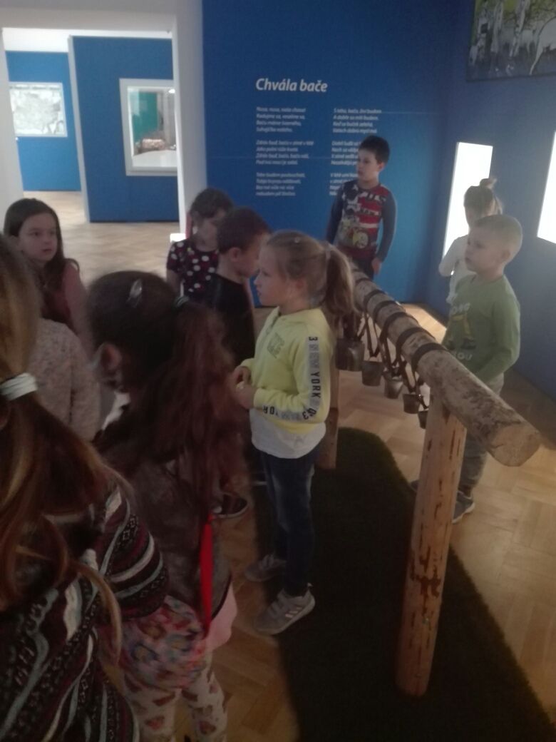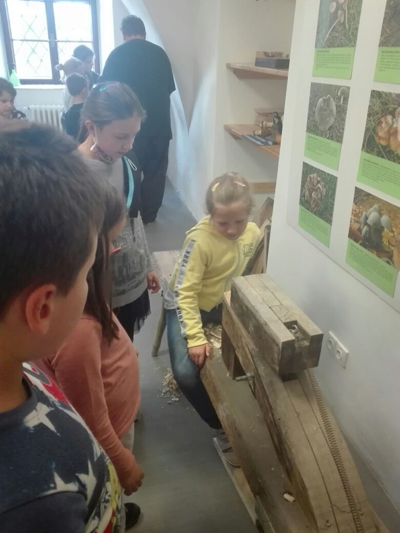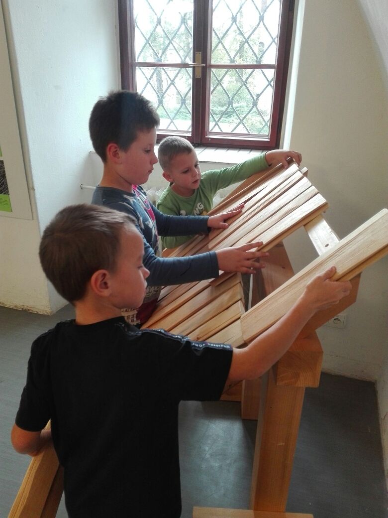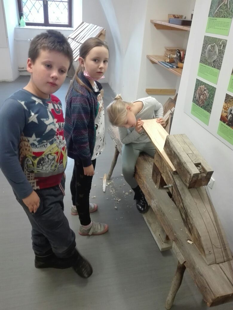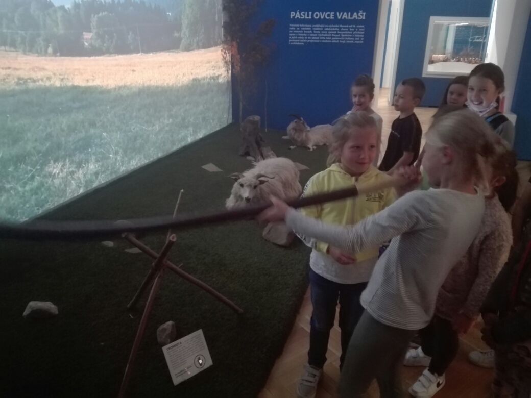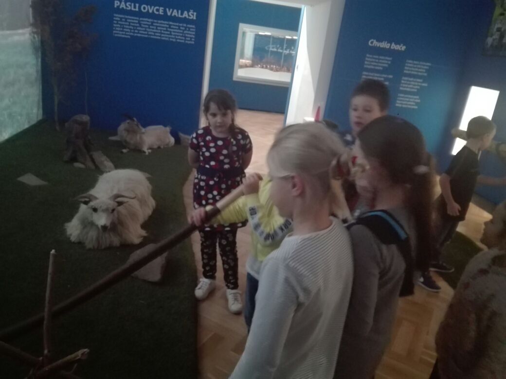 Na závěr týdne jsme se zúčastnili na vsetínském zámku lektorského programu „Pod jménem Valachů“. Zde jsme si mohli osahat staré nástroje, které se používaly při stavbě dřevěnic, vyzkoušeli jsme si poskládat střechu ze šindelů, zatroubit si na valašskou trúbu nebo zazvonit na ovčí zvonce. Děvčata zaujal kolovrátek a práce s vlnou.