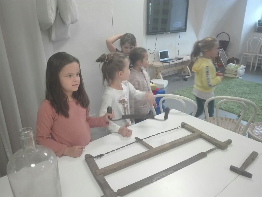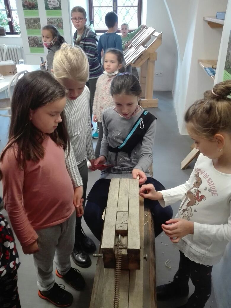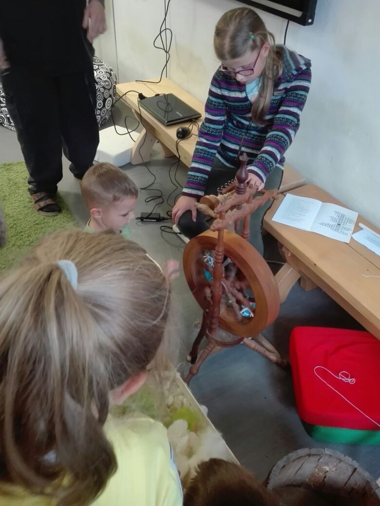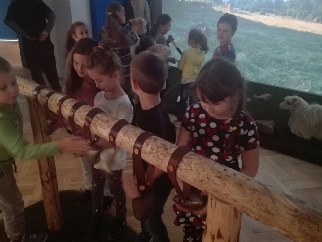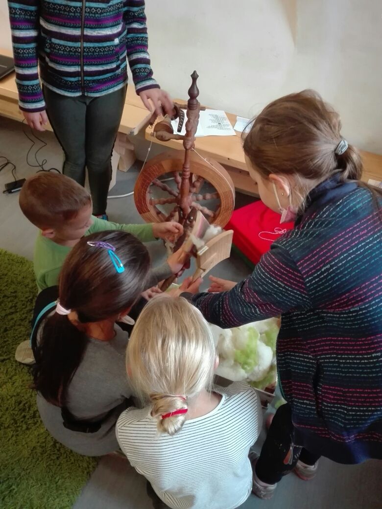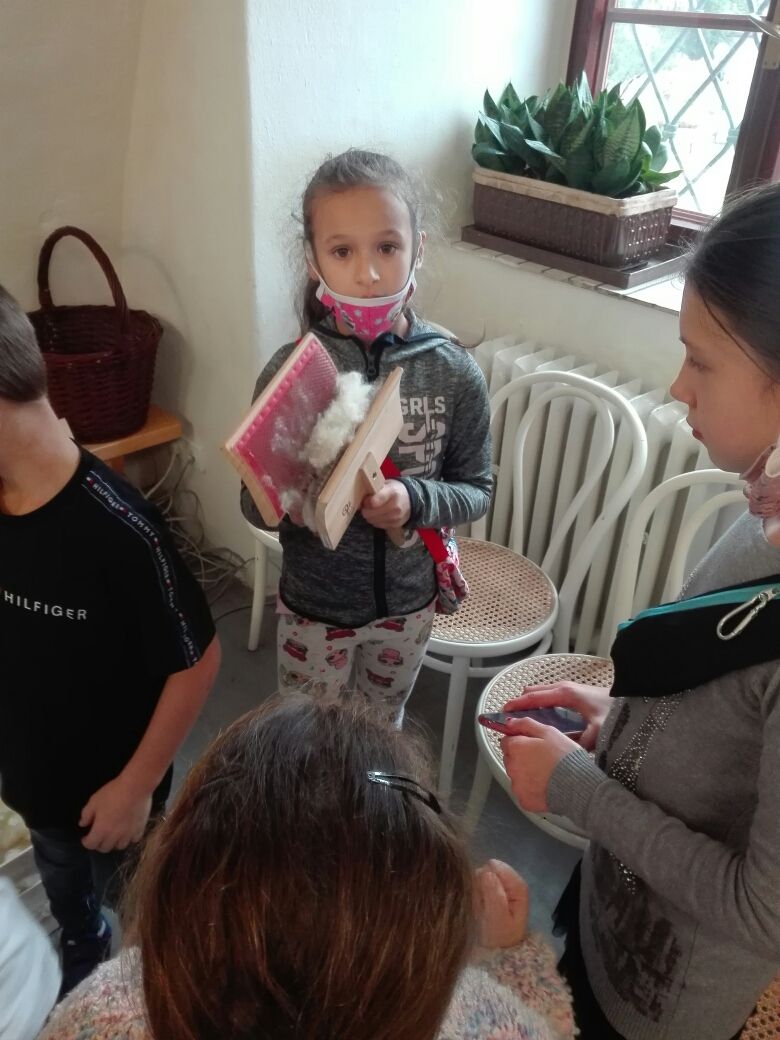 Na závěr týdne jsme se zúčastnili na vsetínském zámku lektorského programu „Pod jménem Valachů“. Zde jsme si mohli osahat staré nástroje, které se používaly při stavbě dřevěnic, vyzkoušeli jsme si poskládat střechu ze šindelů, zatroubit si na valašskou trúbu nebo zazvonit na ovčí zvonce. Děvčata zaujal kolovrátek a práce s vlnou.