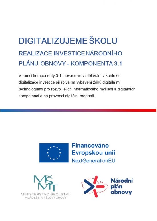 Účelem dotace je pořízení digitálních učebních pomůcek – pokročilých digitálních technologií využitelných pro rozvoj informatického myšlení žáků a jejich digitálních kompetencí za podmínek uvedených ve Věstníku MŠMT 01/2022, Národní plán obnovy – základní školy a gymnázia - učební pomůcky pro rozvoj informatického myšlení a digitální kompetence: Stanovení dalších finančních prostředků pro základní školy na rok 2022, č.j. MSMT-33976/2021-3.