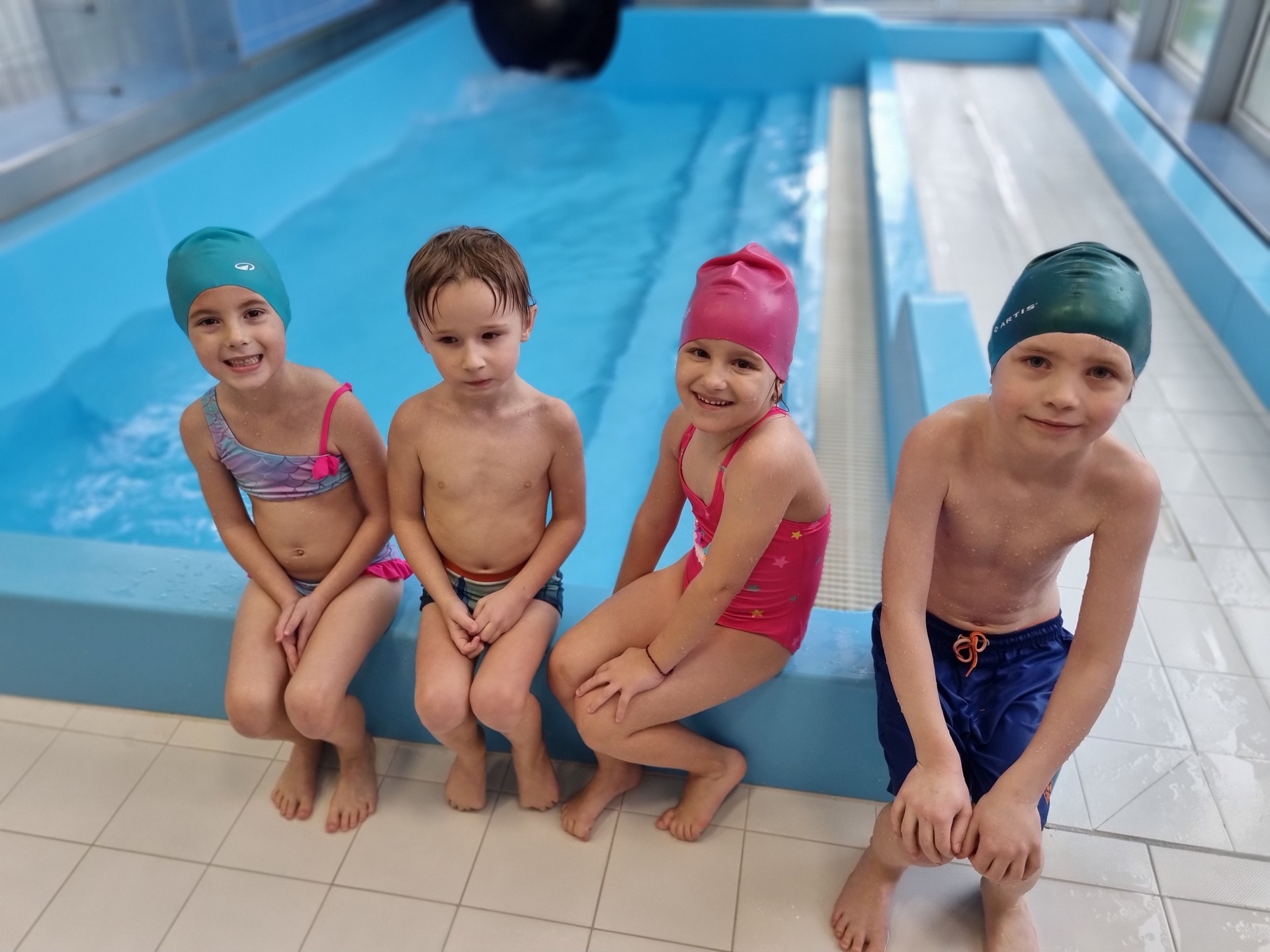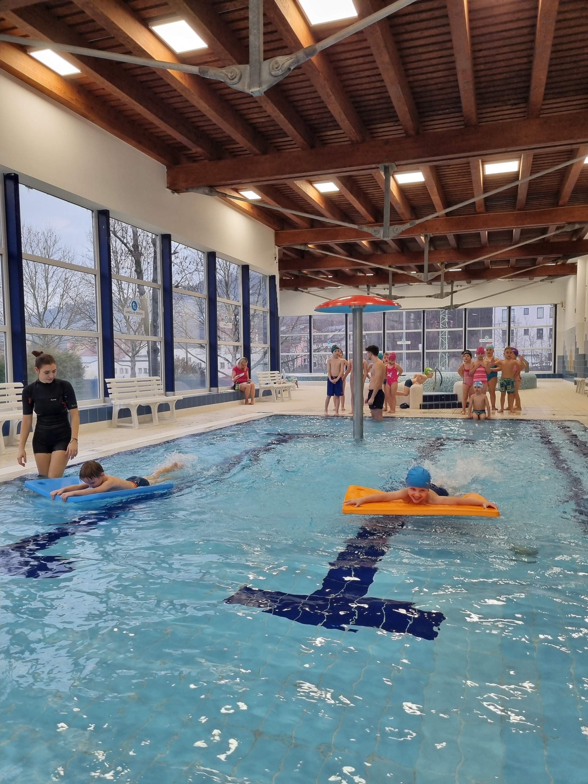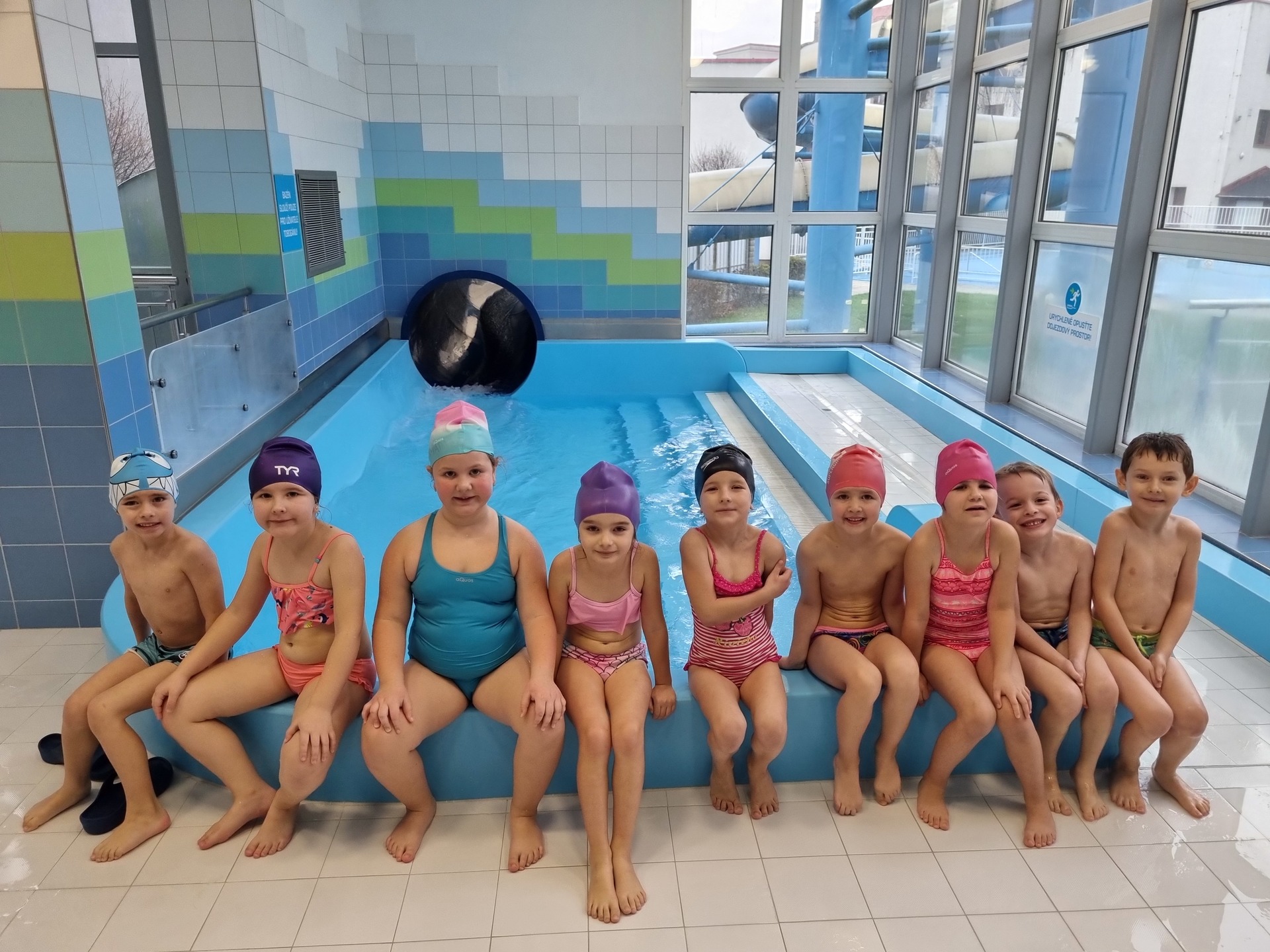 Tak nám to uteklo jako voda. V pátek jsme byli naposledy plavat a děti si to náramně užily. Plavecký kurz zakončily napínavé závody v plavání na podložce, při nichž děti poměřily své síly. Po vydařených závodech následovala tolik očekávaná jízda na tobogánu, a i když zpočátku měly některé děti strach, nakonec jej překonaly a jízdu si užily i několikrát za sebou. Za úspěšné absolvování kurzu si všichni odnesli „mokré vysvědčení“.