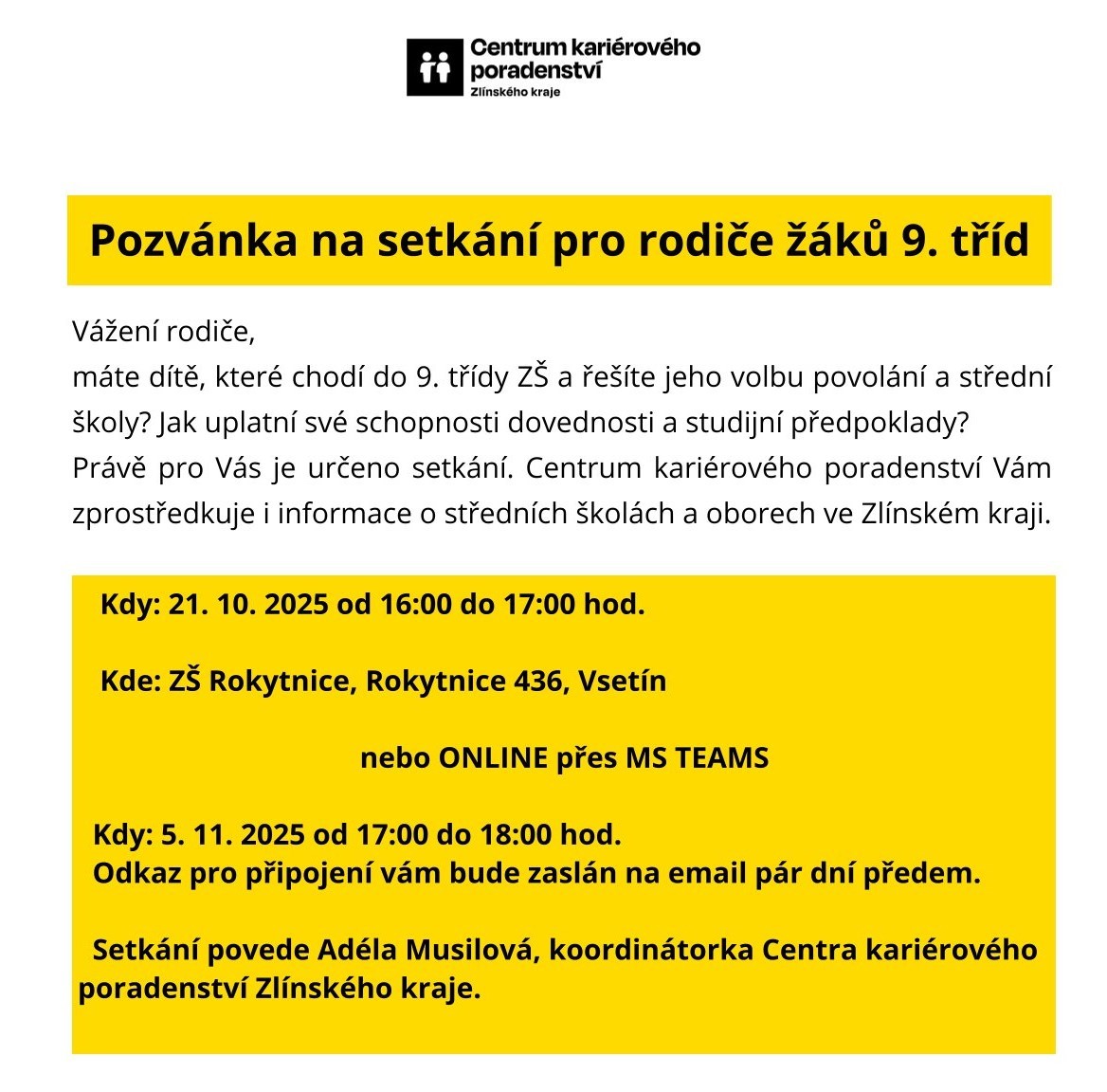 Pro Vás rodiče jsme připravili setkání dne 21. 10. 2025 v prostorách ZŠ Rokytnice Vsetín, kde se budeme věnovat:
