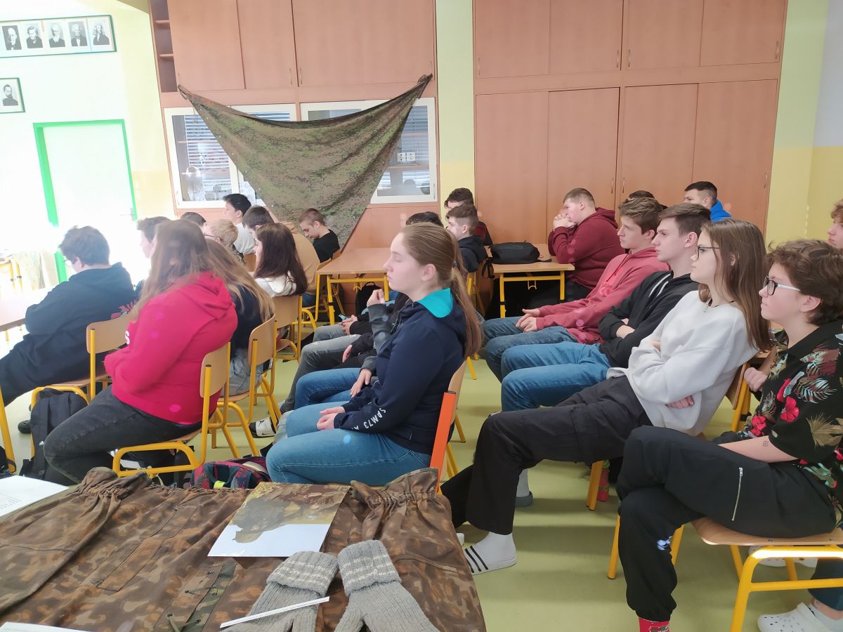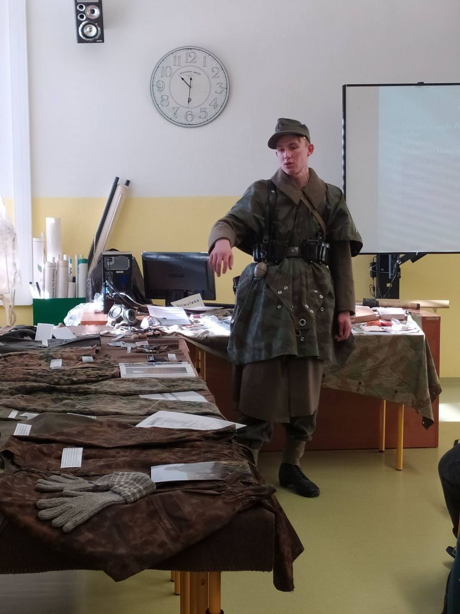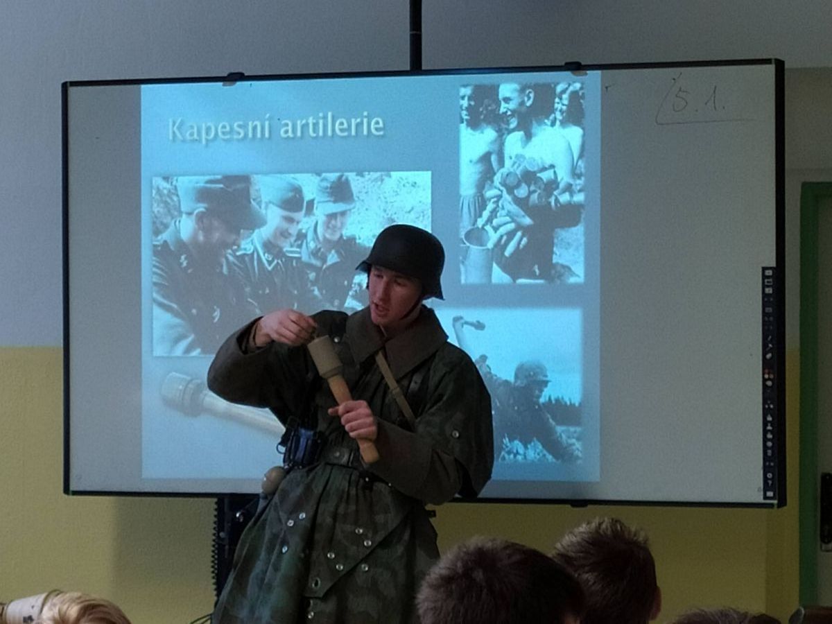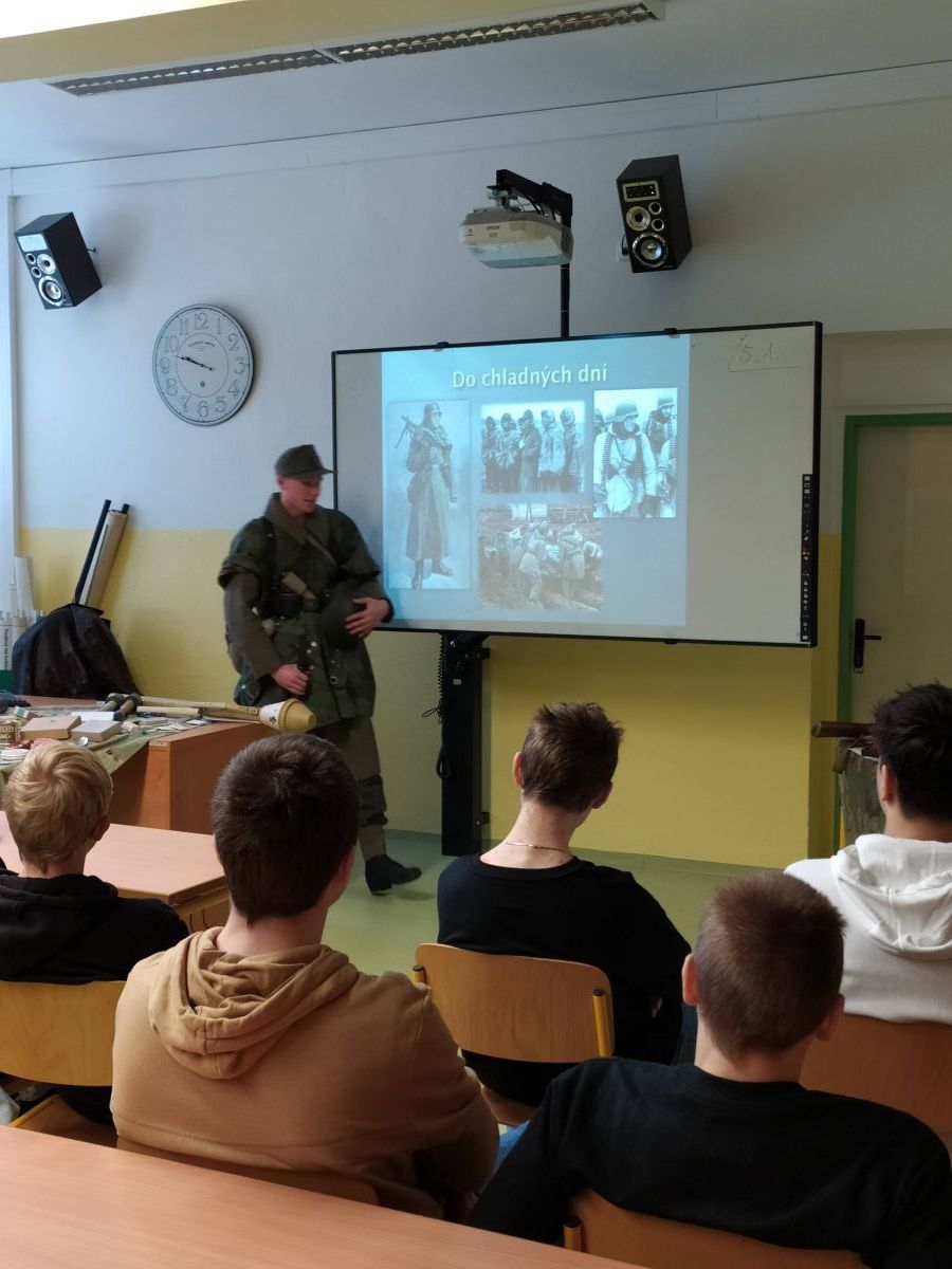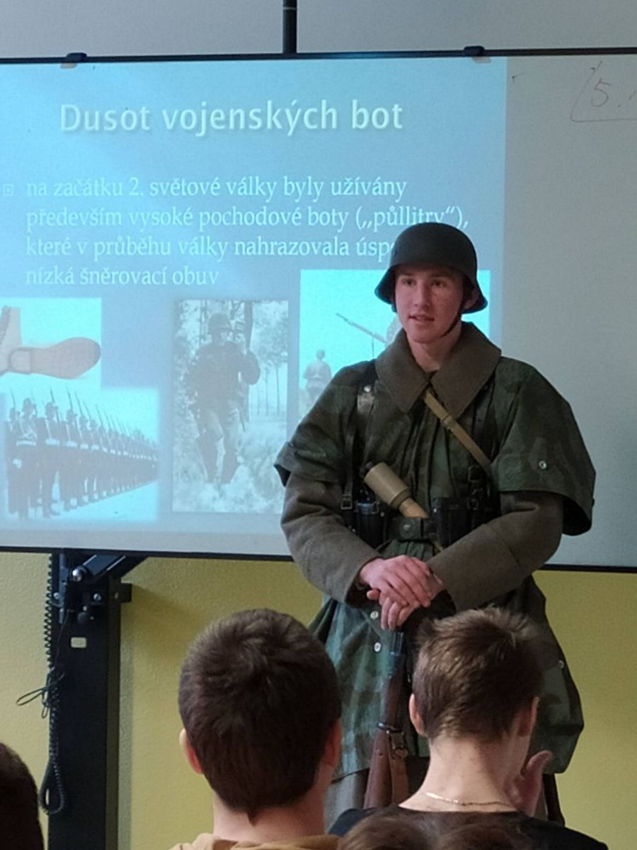Vyprávění s ukázkami dobové výzbroje a výstroje bylo velmi poutavé. Na závěr přednášky měli žáci možnost zeptat se, co je zajímá a dozvěděli jsme se, že Josef Pavlín si zahrál v nedávno uvedeném filmu do kin o našem rodákovi " Sousedík ".