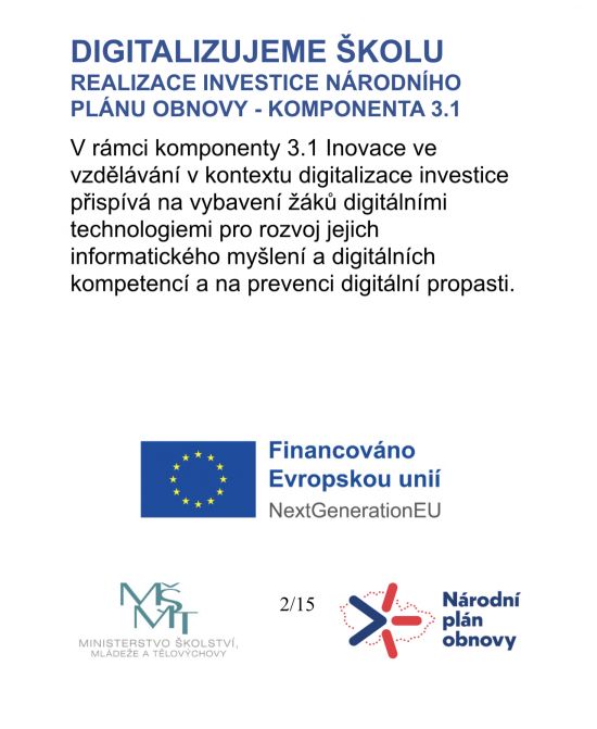 Účelem dotace je implementace Komponenty 3.1. Inovace ve vzdělávání v kontextu digitalizace a přispět k prevenci digitální propasti snížením nerovností mezi žáky v přístupu ke kvalitnímu vzdělání, které by byly způsobeny nedostatečným technickým vybavením mobilními digitálními technologiemi.