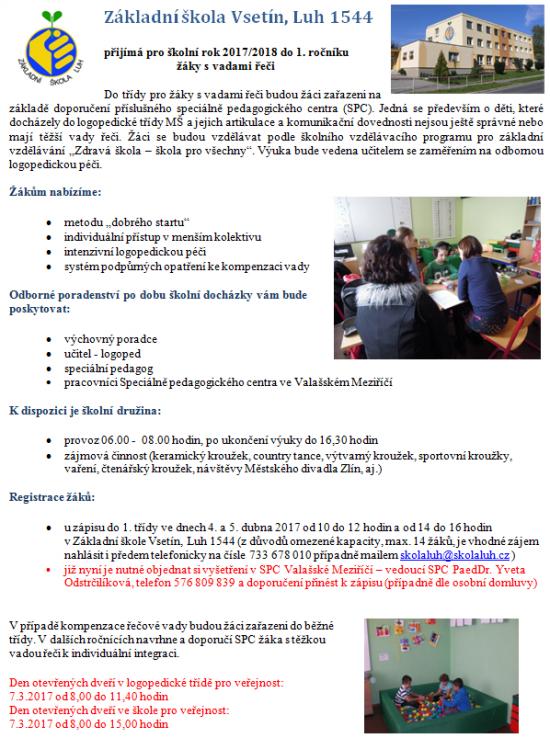 Přijímáme pro školní rok 2017/2018 do 1. ročníku žáky s vadami řeči