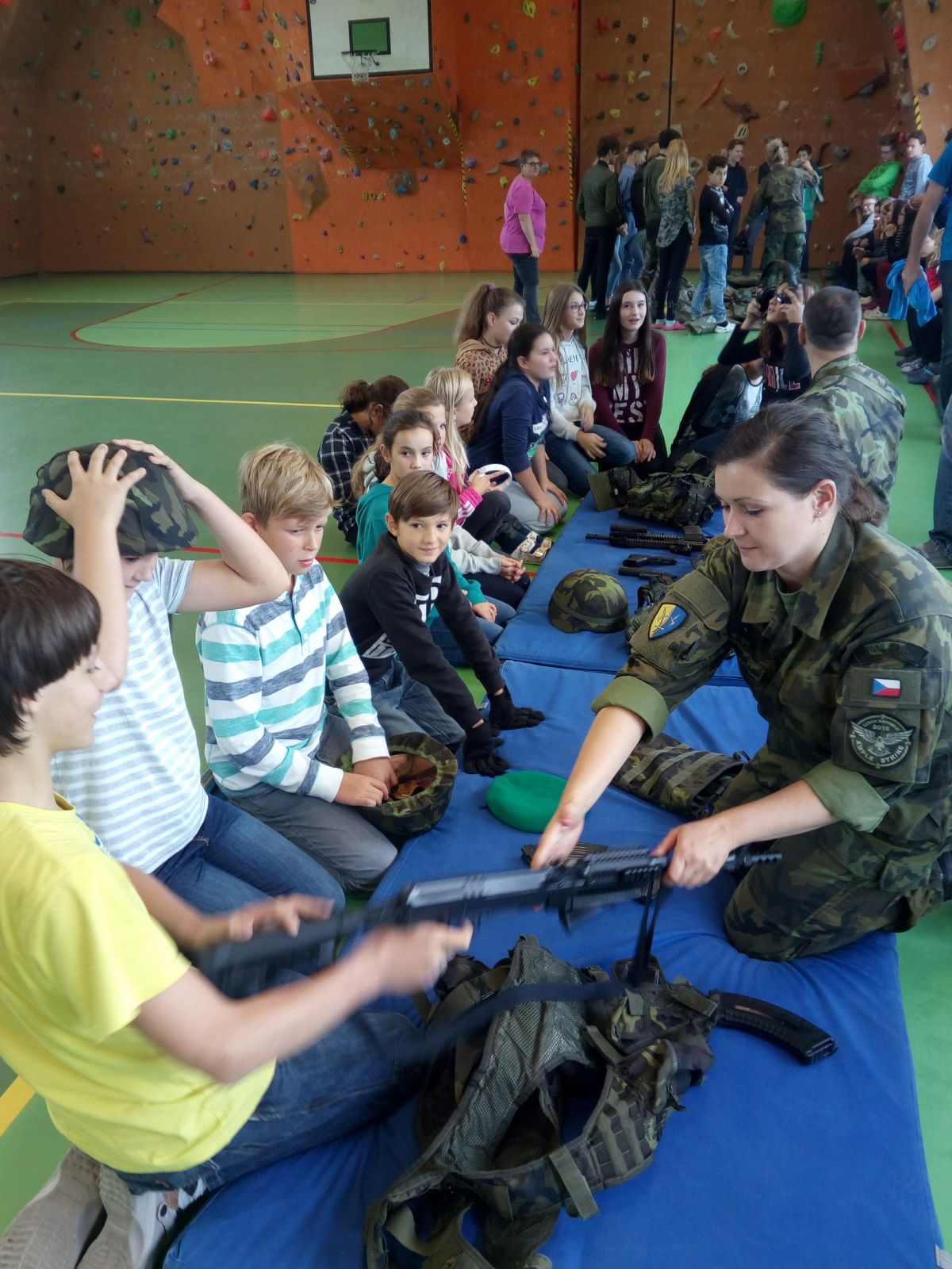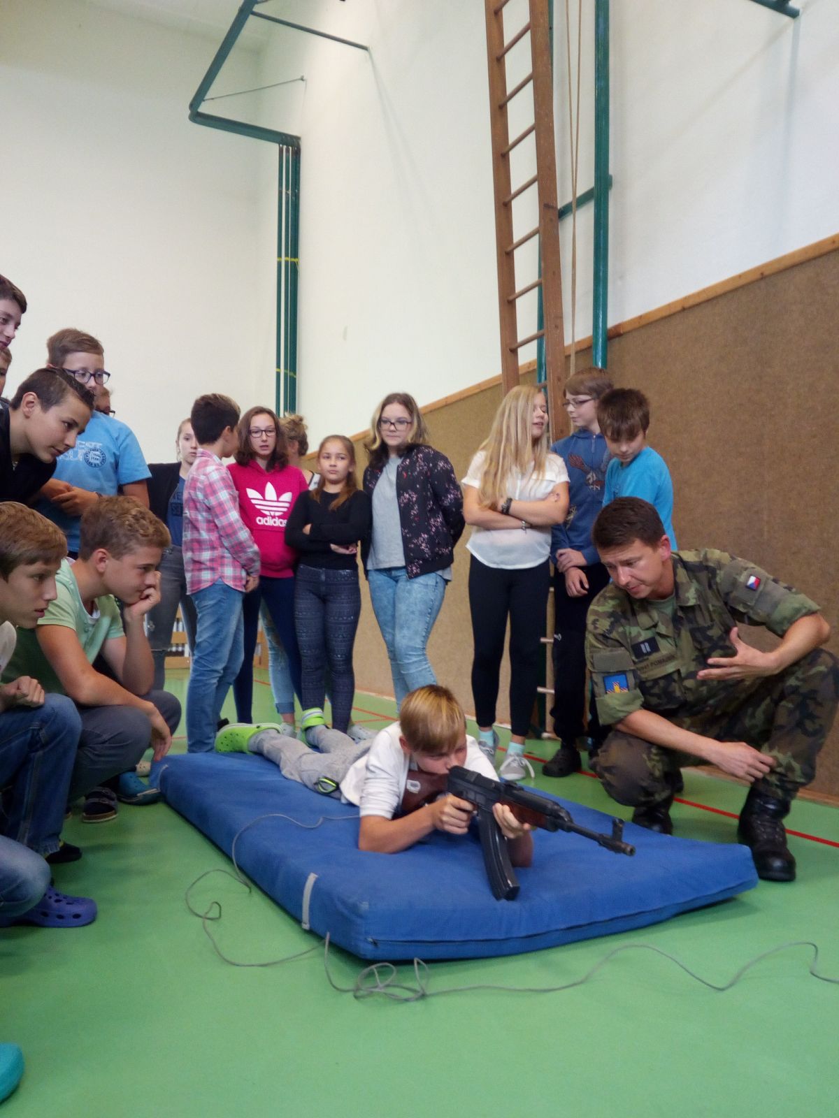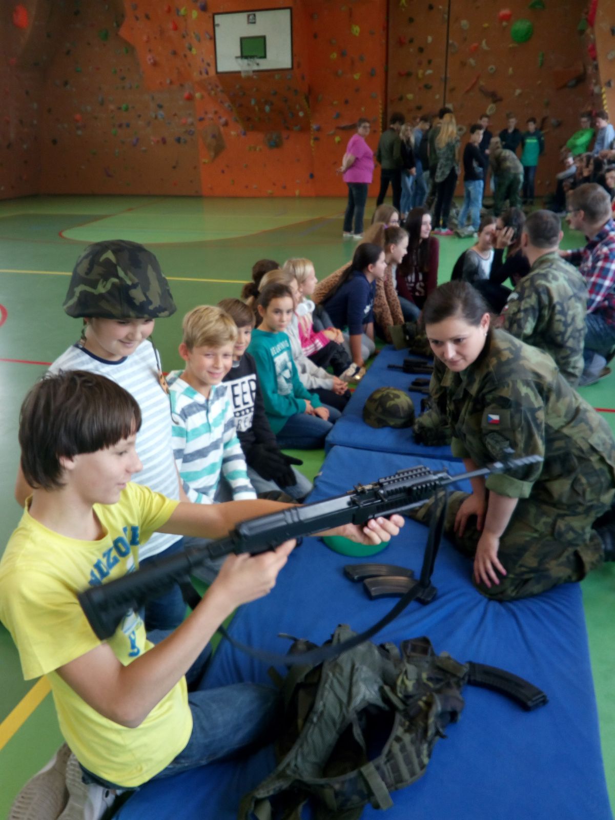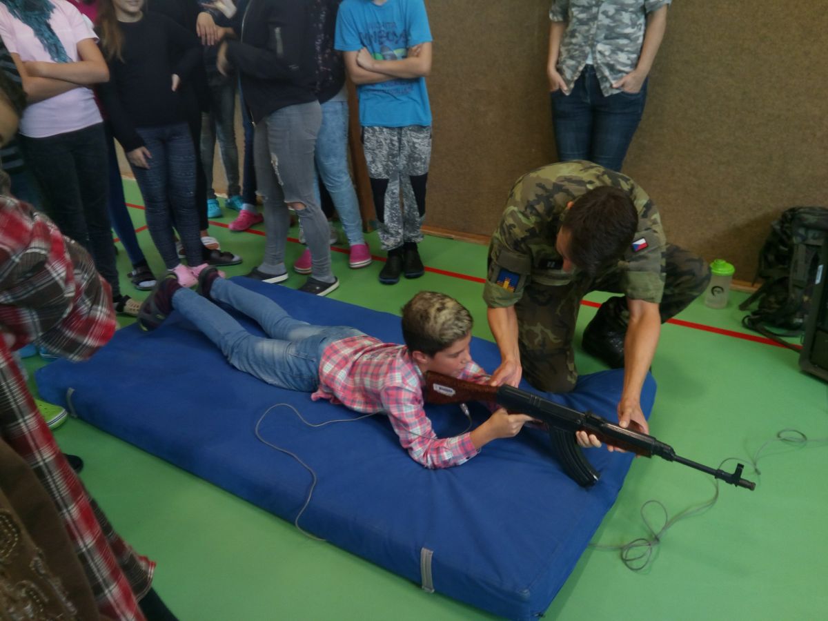 V praktické části žáci zkoušeli, jak se oblékají protichemické obleky a ochranné masky, stříleli na střeleckém trenažeru a prohlédli si současnou výstroj a výzbroj příslušníků armády. Zájemci si také mohli složit a rozložit vystavené zbraně, popřípadě se s nimi i vyfotit. Celá akce byla zajímavá a půlden s armádou žáky bavil.