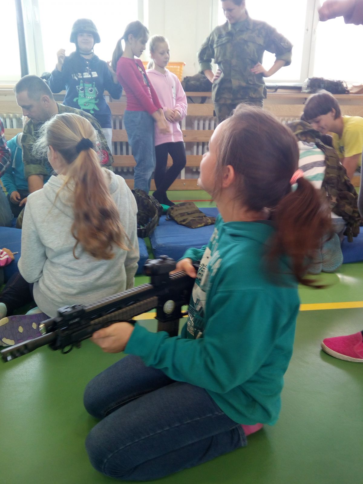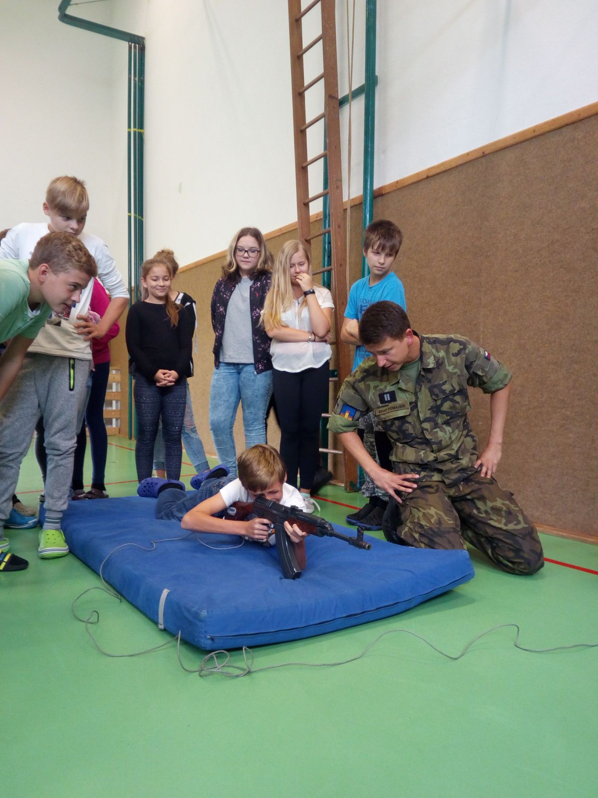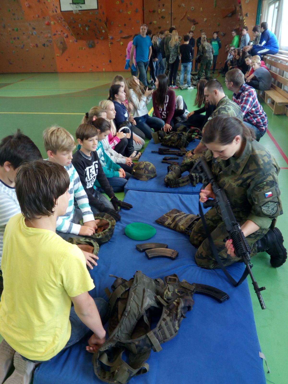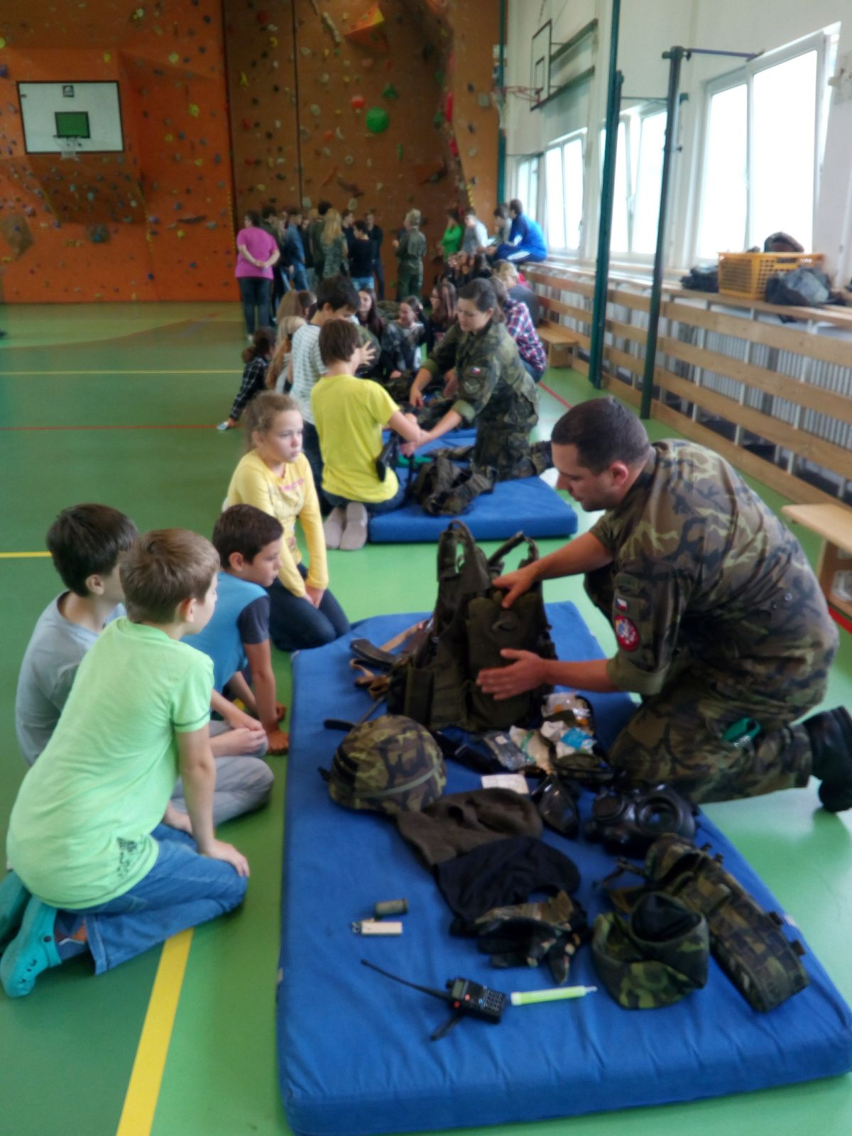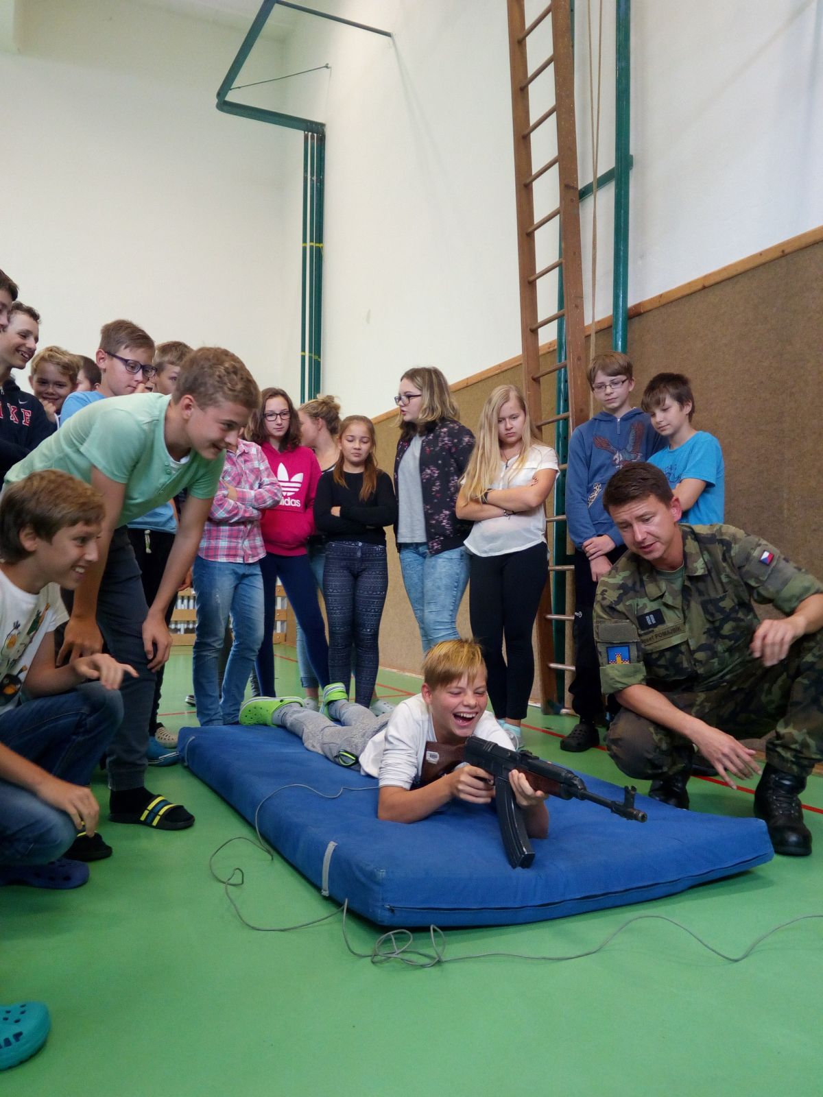 V praktické části žáci zkoušeli, jak se oblékají protichemické obleky a ochranné masky, stříleli na střeleckém trenažeru a prohlédli si současnou výstroj a výzbroj příslušníků armády. Zájemci si také mohli složit a rozložit vystavené zbraně, popřípadě se s nimi i vyfotit. Celá akce byla zajímavá a půlden s armádou žáky bavil.