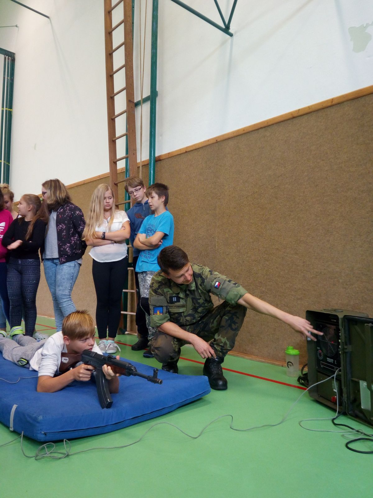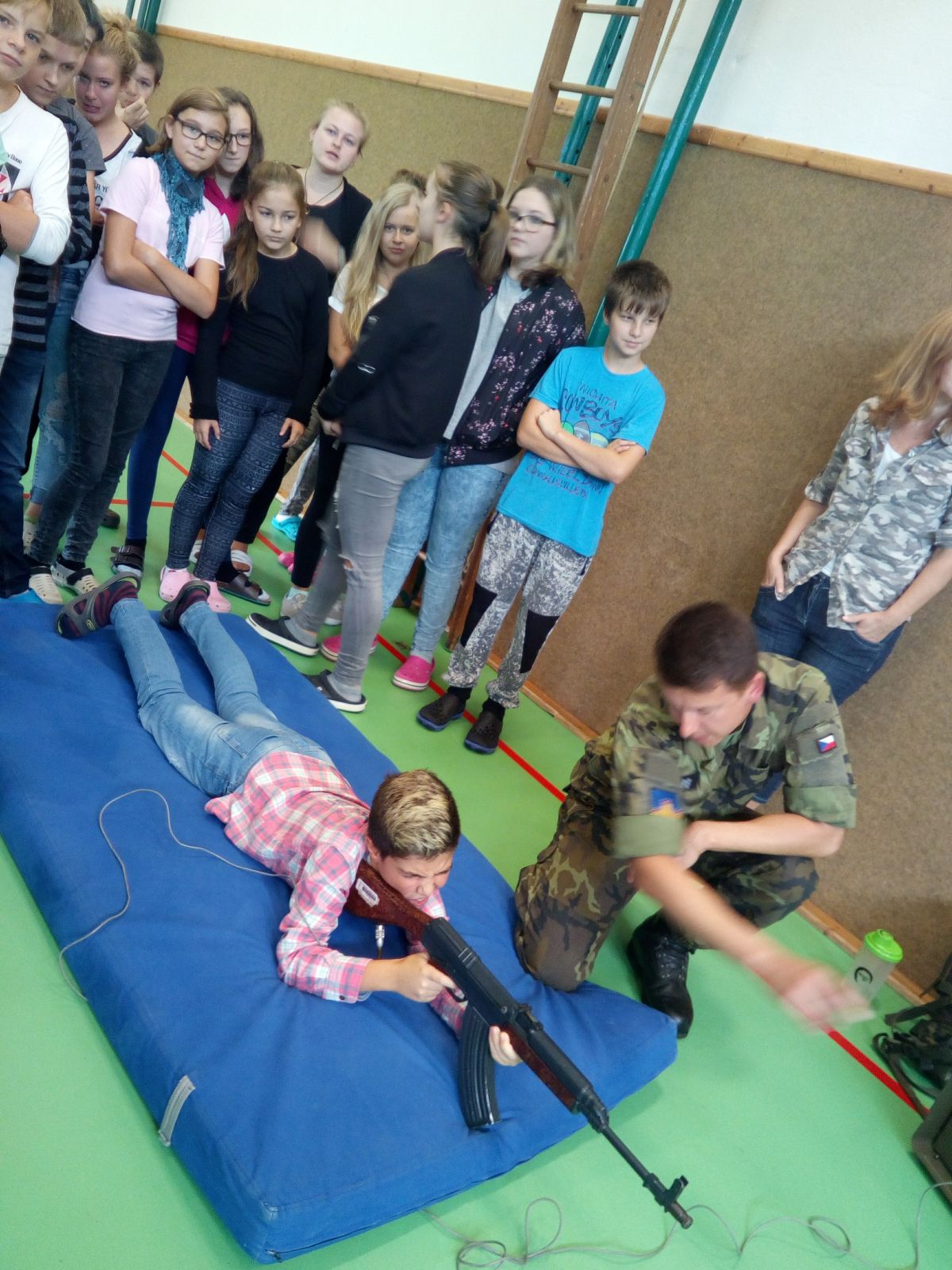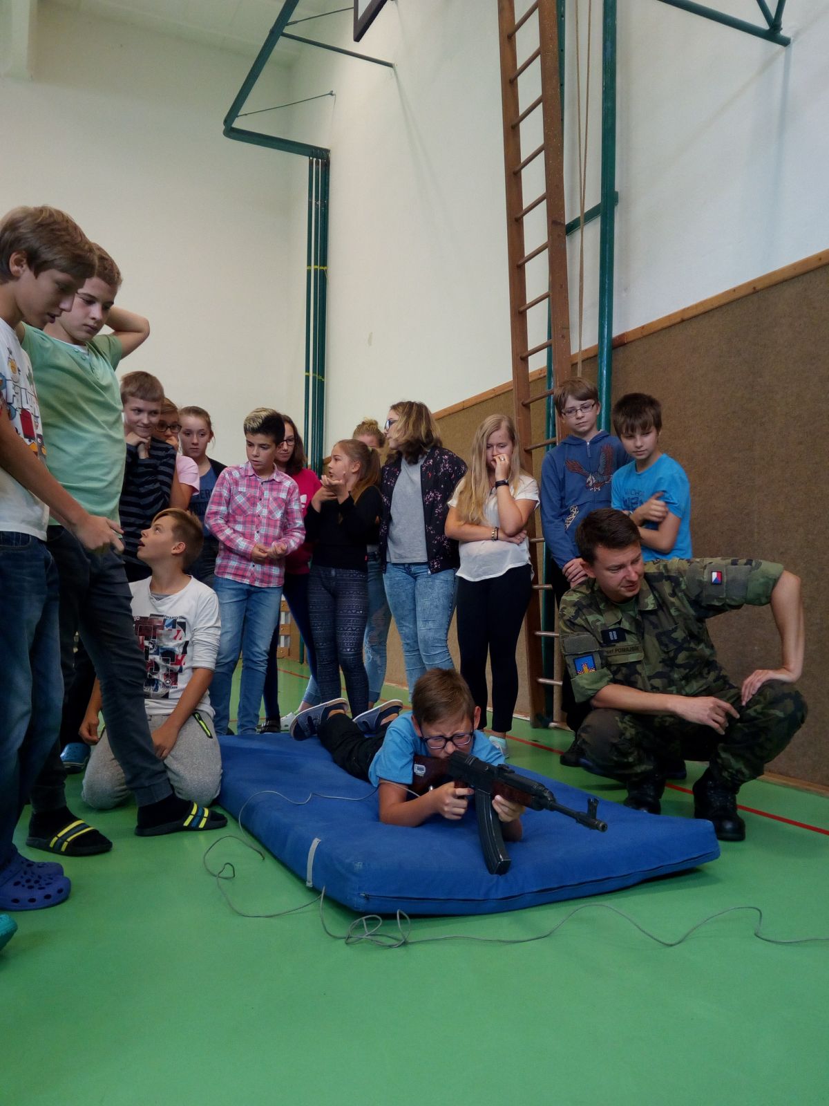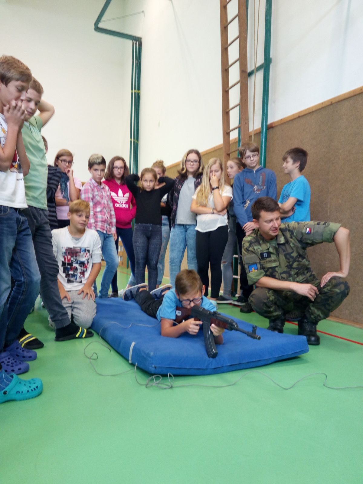 V praktické části žáci zkoušeli, jak se oblékají protichemické obleky a ochranné masky, stříleli na střeleckém trenažeru a prohlédli si současnou výstroj a výzbroj příslušníků armády. Zájemci si také mohli složit a rozložit vystavené zbraně, popřípadě se s nimi i vyfotit. Celá akce byla zajímavá a půlden s armádou žáky bavil.