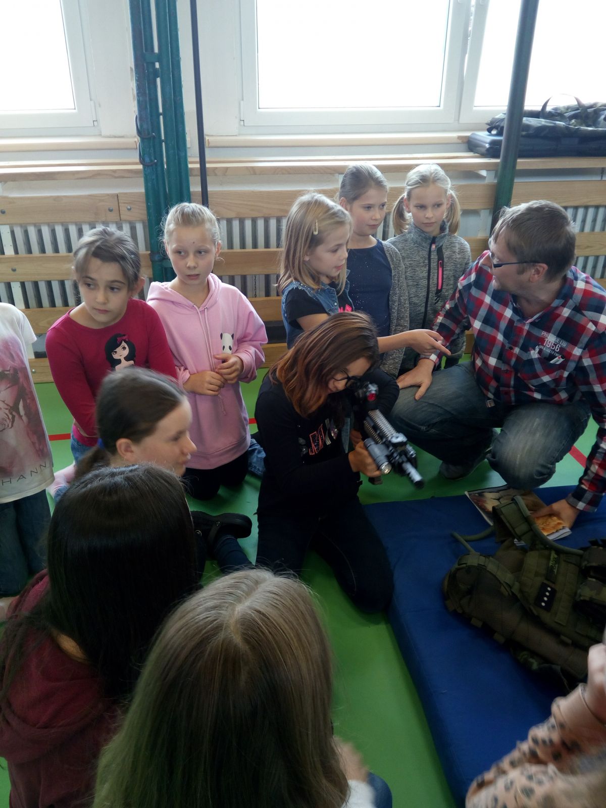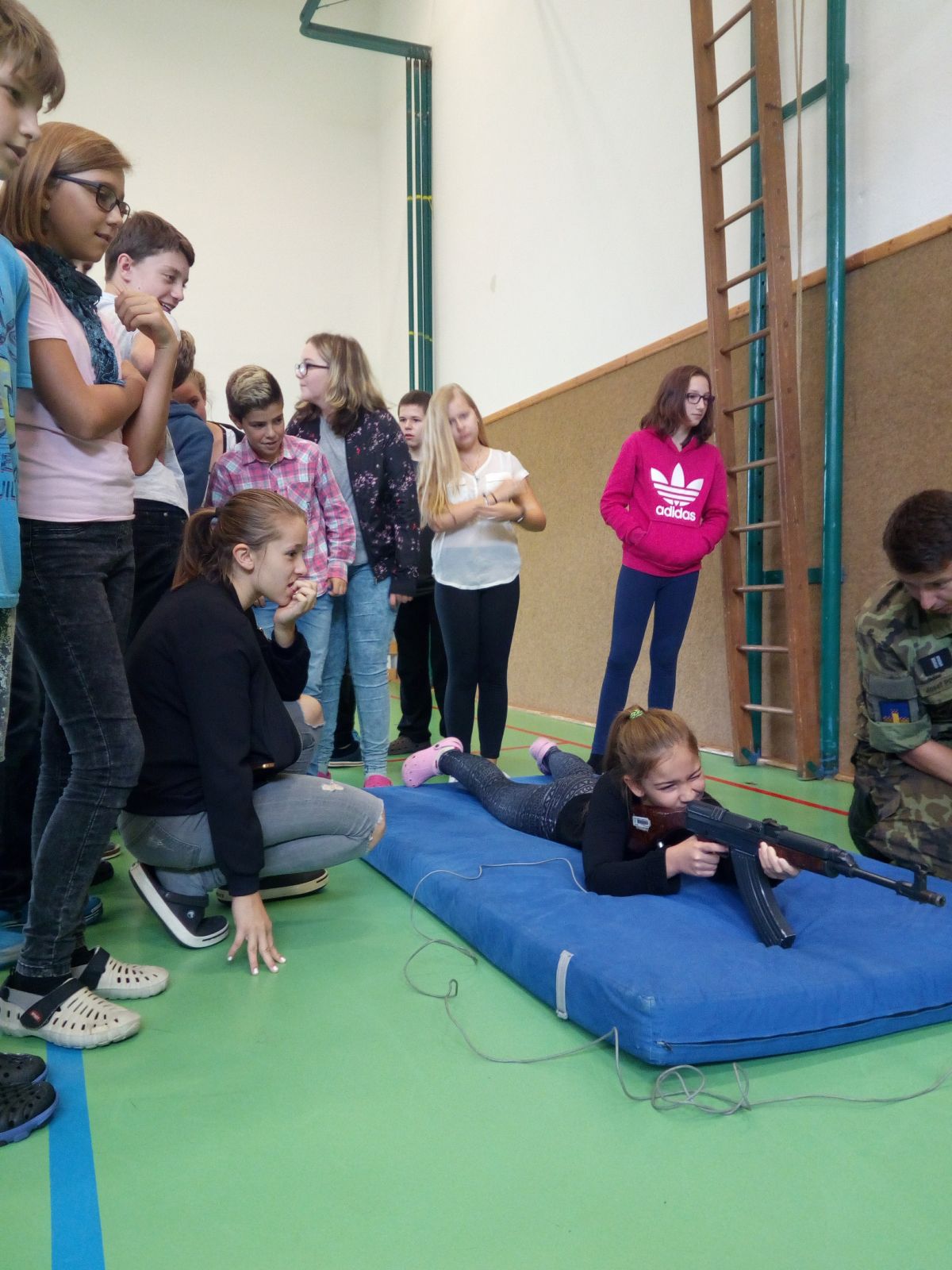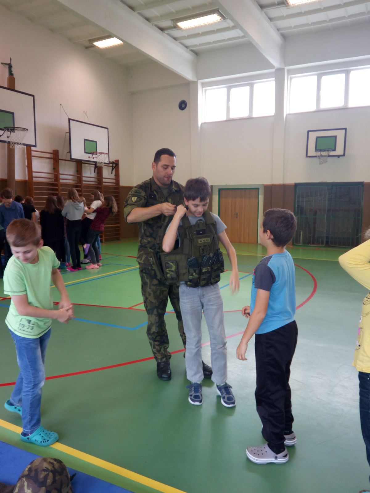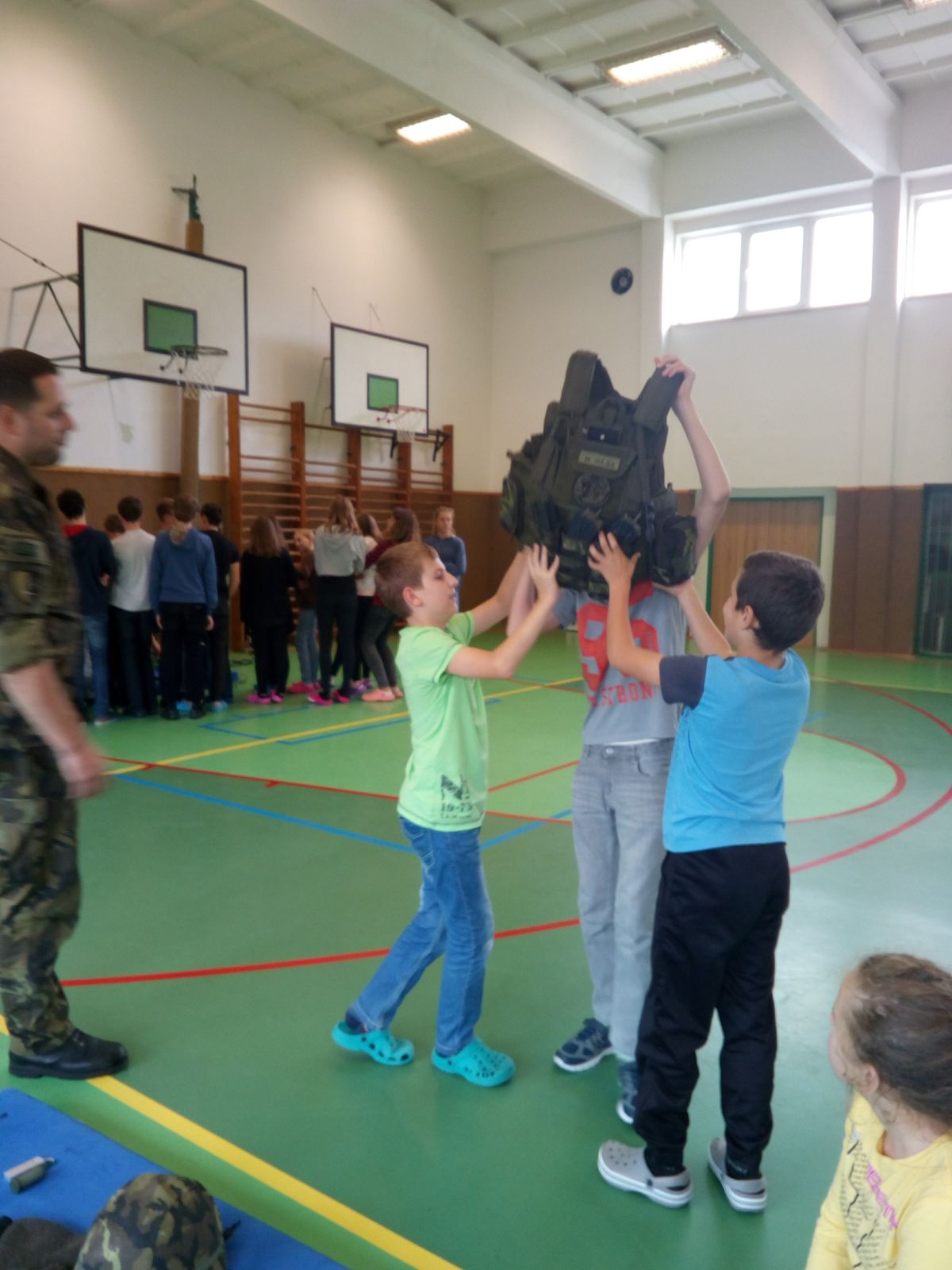 V praktické části žáci zkoušeli, jak se oblékají protichemické obleky a ochranné masky, stříleli na střeleckém trenažeru a prohlédli si současnou výstroj a výzbroj příslušníků armády. Zájemci si také mohli složit a rozložit vystavené zbraně, popřípadě se s nimi i vyfotit. Celá akce byla zajímavá a půlden s armádou žáky bavil.