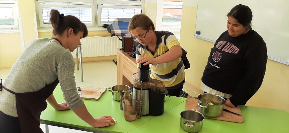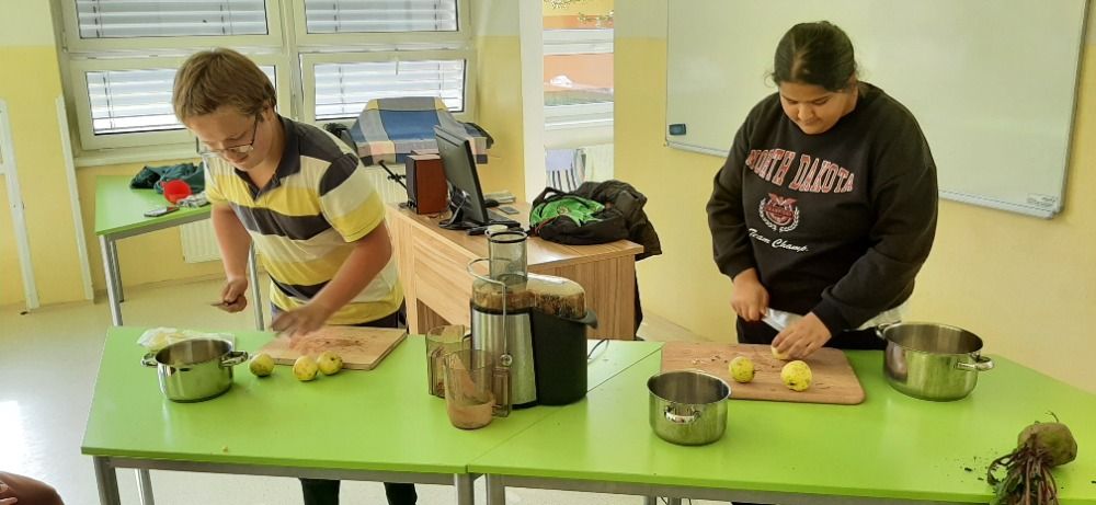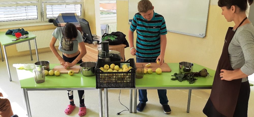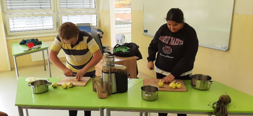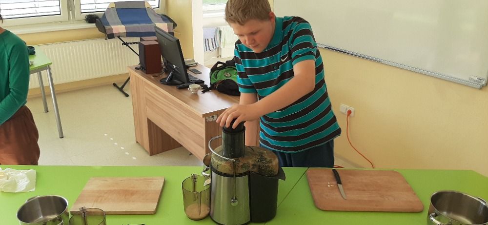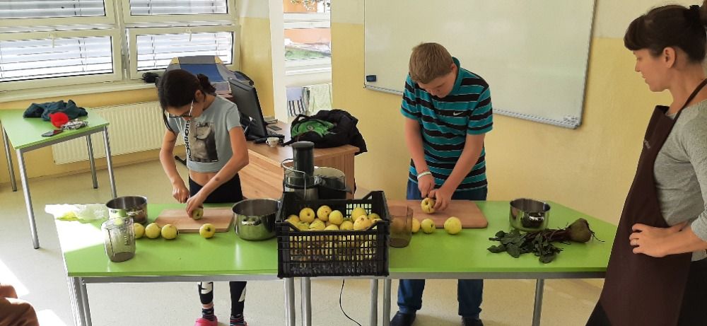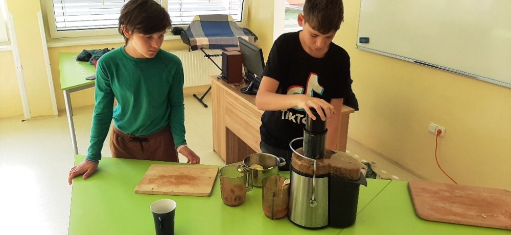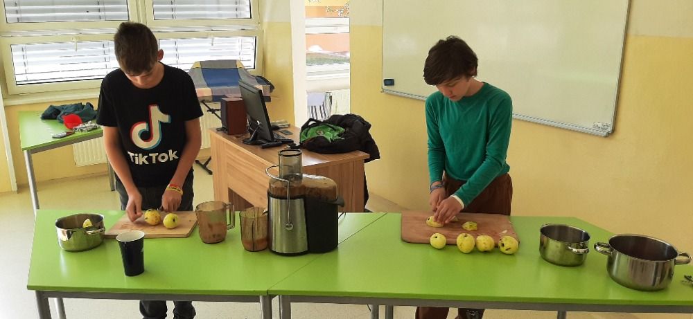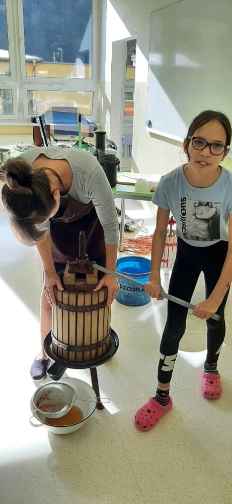 Seznámili se s různými způsoby získávání jablečné šťávy. Naučili se sestavovat a obsluhovat velký ruční lis i běžný, domácí odšťavňovač.