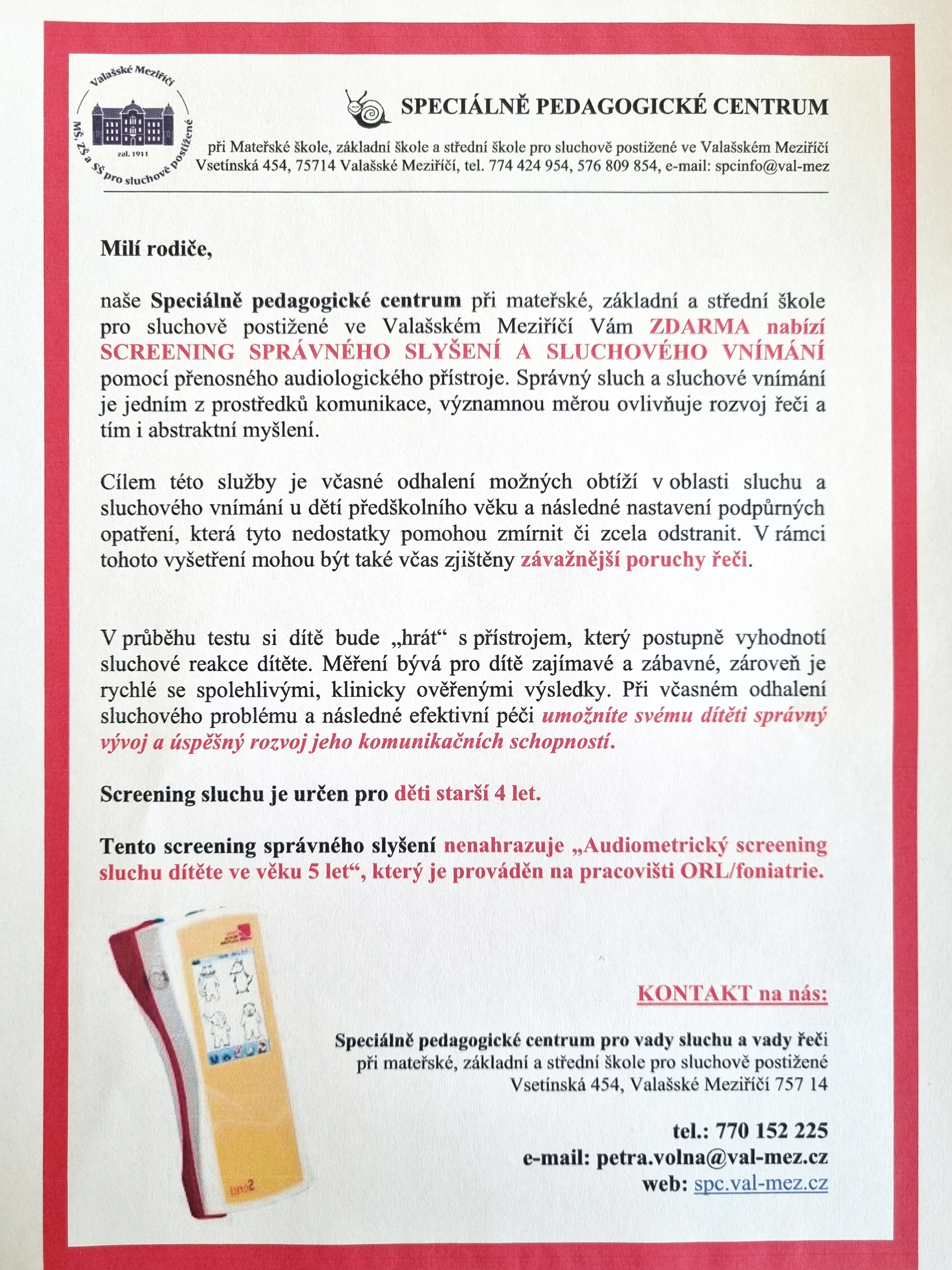 V pondělí 16.3.2026 proběhne v mateřské škole ve spolupráci se Speciálně pedagogickým centrem z Valašského Meziříčí bezplatné vyšetření sluchu u dětí. Vyšetření je pouze pro přihlášené děti!