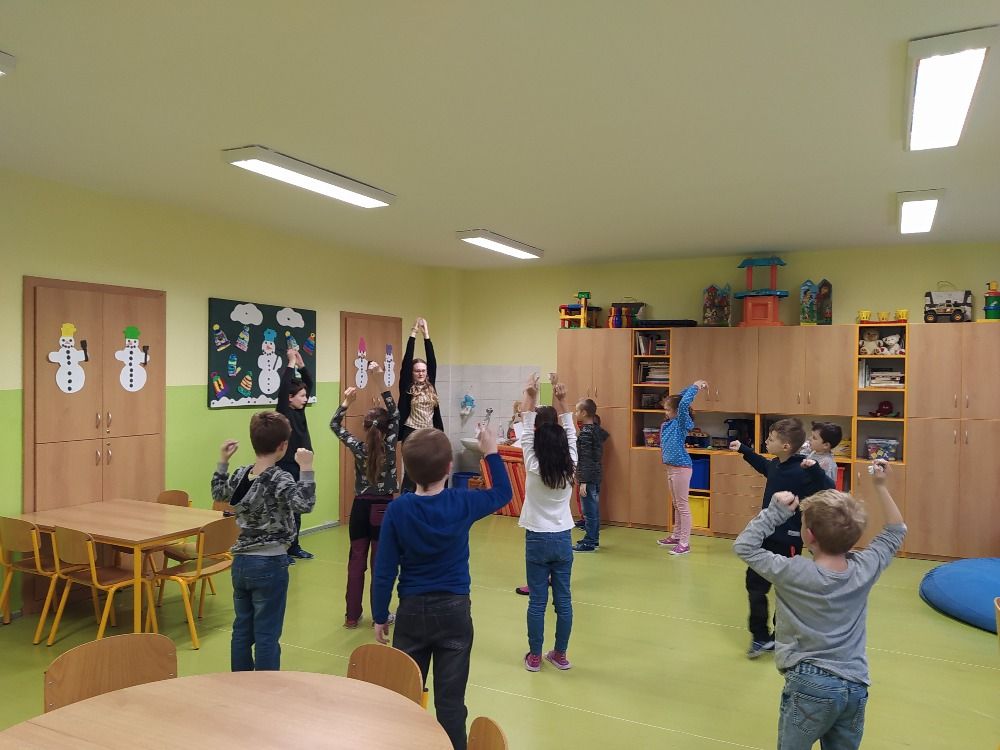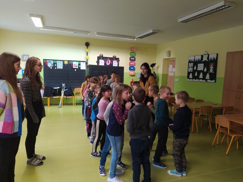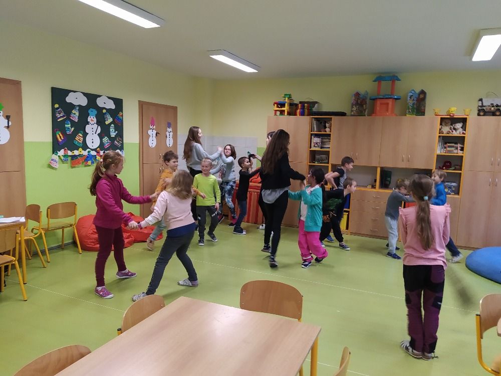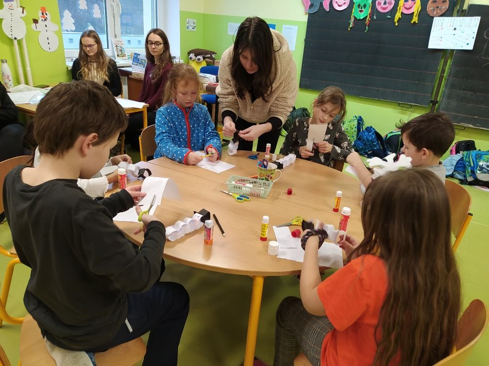 Od října pravidelně jednou v týdnu docházejí Dominika, Zuzana, Kristýna, Tereza a Terka do naší družinky a vytvářejí přínosný program pro žáky v oddělení Motýlků. Děti se na děvčata těší a s nadšením a zájmem spolupracují.