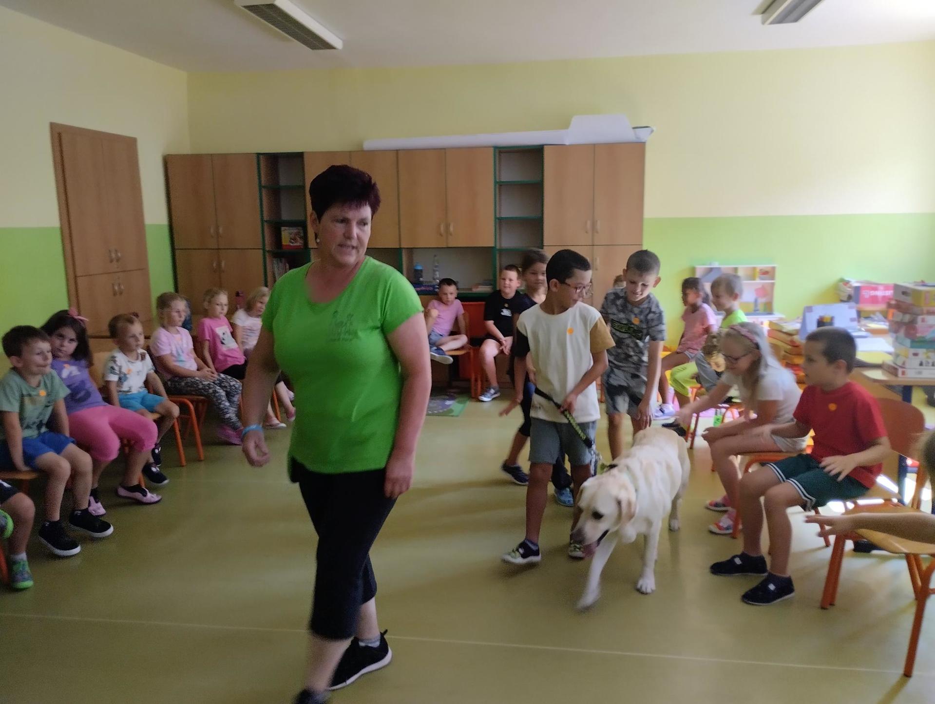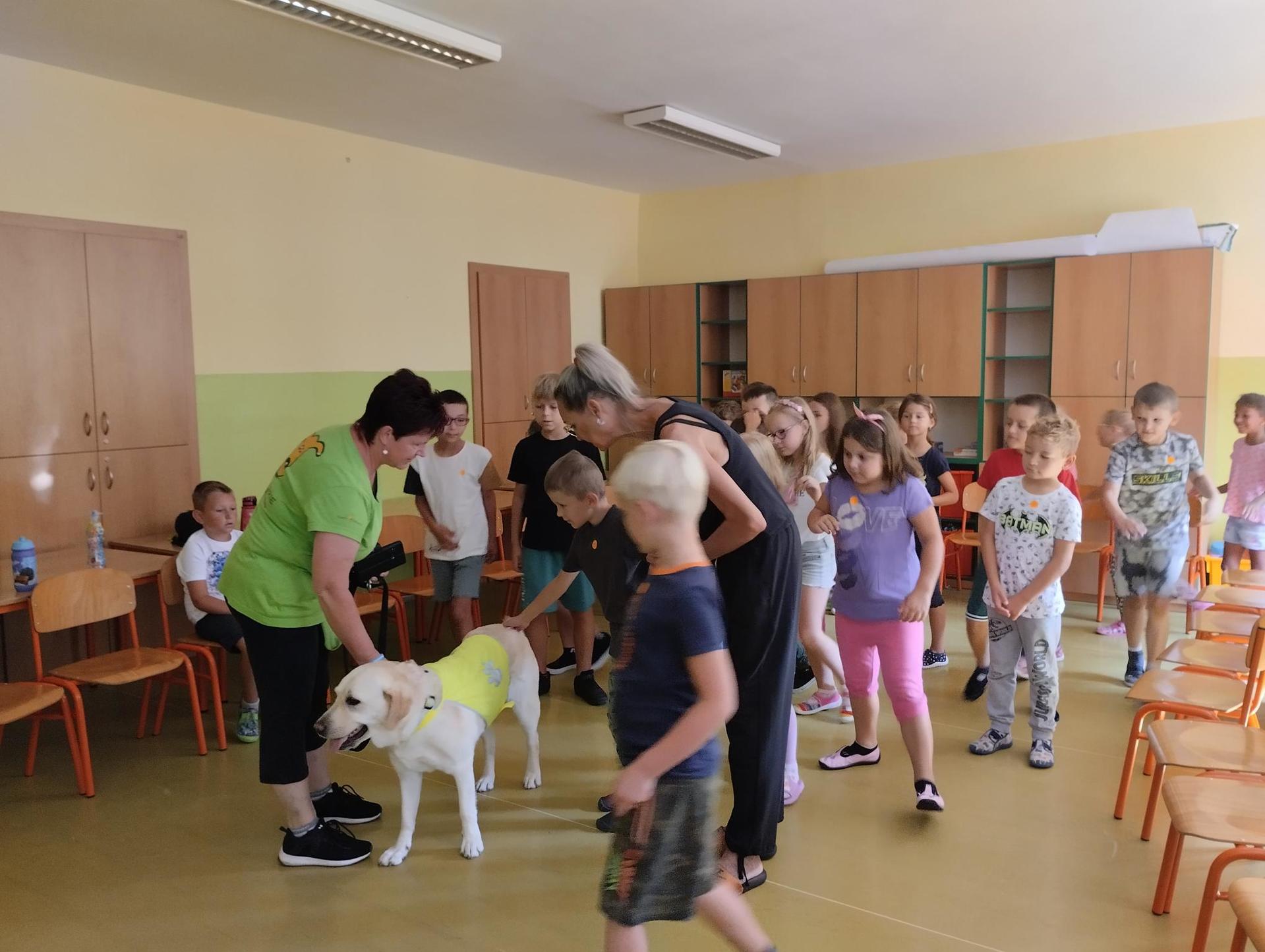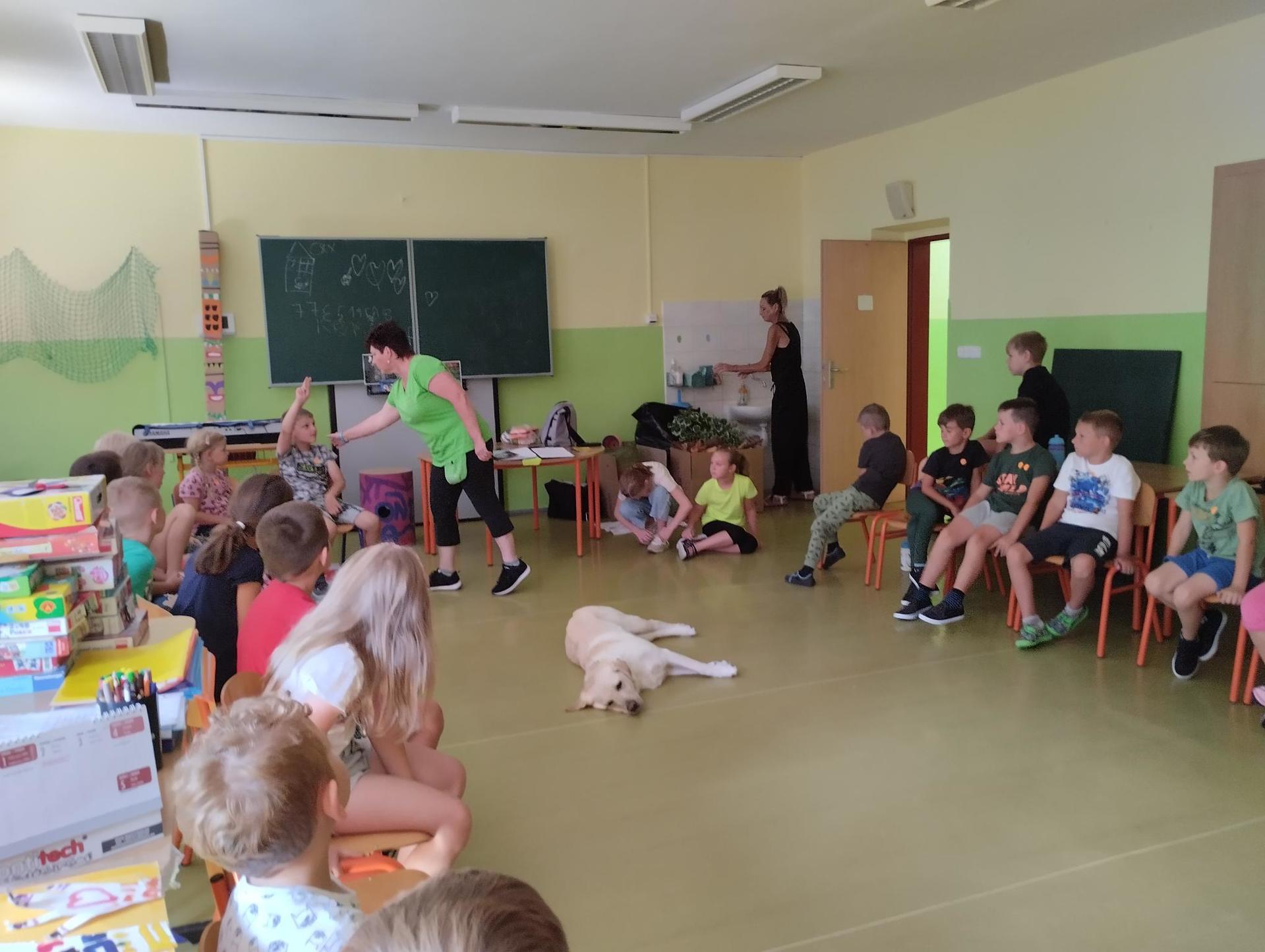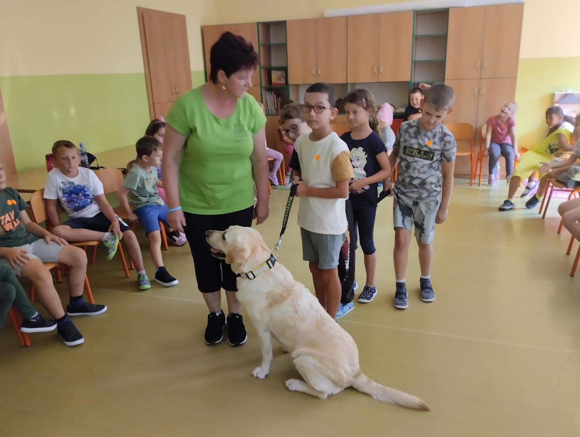 Děti si během dopoledne mohly zkusit zábavnou formou " výuku" ve škole, která byla obohacena o výtvarnou výchovu, anglický jazyk, atletické disciplíny na hřišti, florbal. Druhý den děti přišla navštívit fenka Elza, labradorský retrívr, profesionálně cvičený pejsek pí. Pavlínou Dujkovou. V canisterapii Elza předvedla dětem co všechno dokáže, nosit léky nemocnému, reagovat na povely a navodit krásnou, zklidňující atmosféru. Na závěr tábora si děti našly 'poklad', batůžek plný překvapení i pár sladkostí. Setkání se nám zadařilo, děti odcházely s úsměvem na tváři a my dospělí doufáme, že ten školní začátek budou mít děti opravdu radostný.