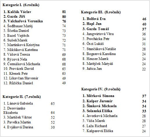 Školní kolo se konalo ve čtyřech kategoriích.