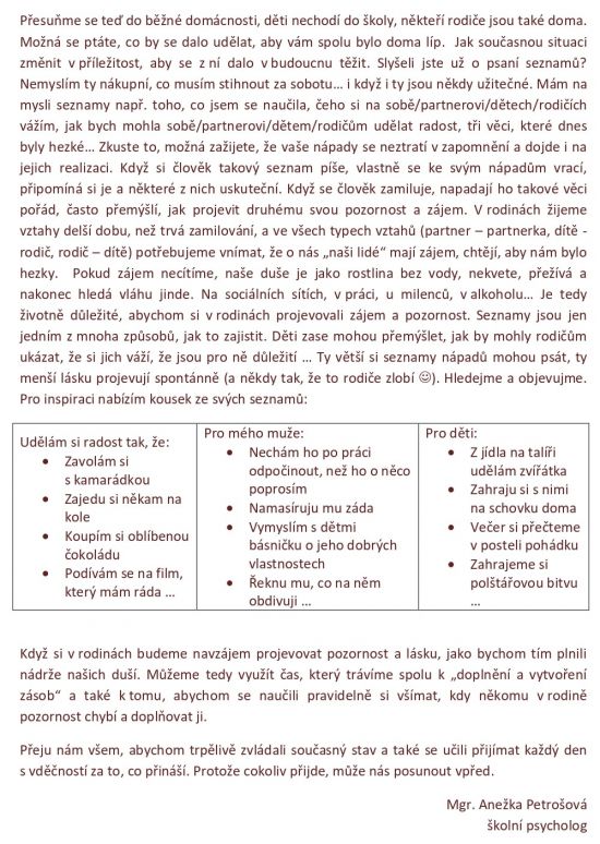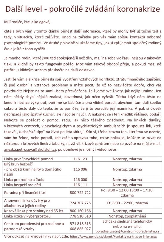 Milí rodiče, žáci a kolegové, chtěla bych vám v tomto článku přinést další informace, které by mohly být užitečné teď a tady, v situacích, které zažíváte. Hned na začátku pro vás mám sbírku kontaktů odborné psychologické pomoci. Ve druhé polovině si ukážeme tipy, jak si zpříjemnit společný rodinný čas a ještě z toho vytěžit.