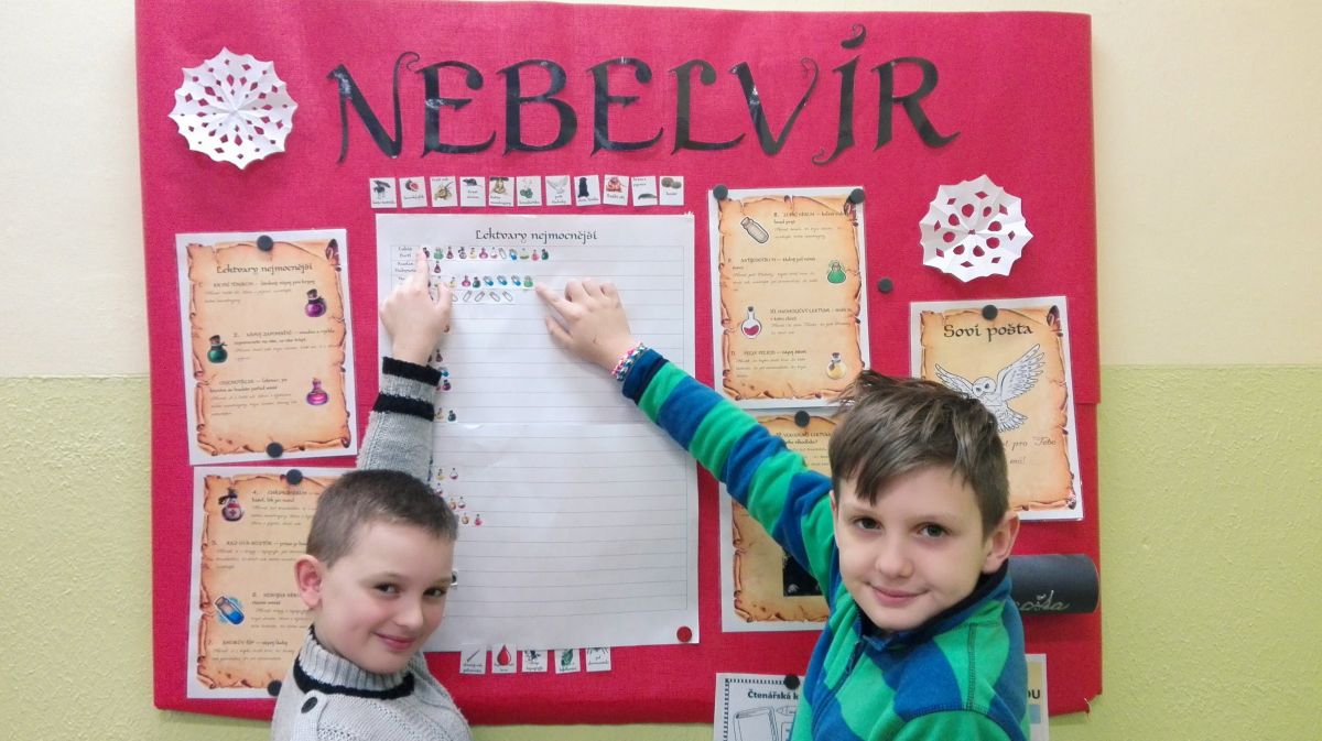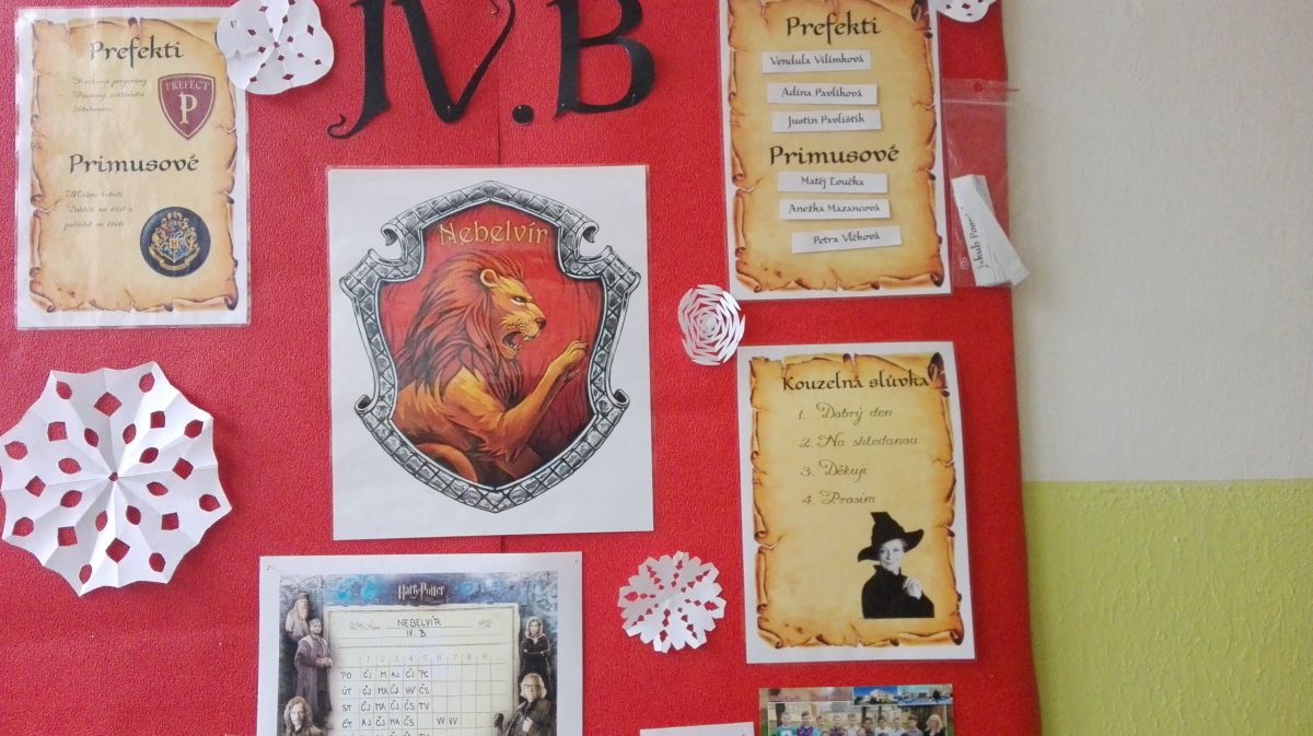 Na začátku školního roku nás čekalo překvapení, protože naše třída nebyla stejná. Nejprve jsme prošli nástupištěm 9 ? a ocitli se ve společenské místnosti Harryho Pottera, v Nebelvíru. Každý týden netrpělivě očekáváme Soví poštu, v hodinách se hlásíme a hezky pracujeme, protože můžeme získat přísady do lektvarů, a doma děláme domácí úkoly, protože chceme získat řád Hermiony Grangerové. Ani služba nezůstala stejná… Už nemáme šatnáře, službu na tabuli či sešity, ale ve třídě pomáhají prefekti a primusové.