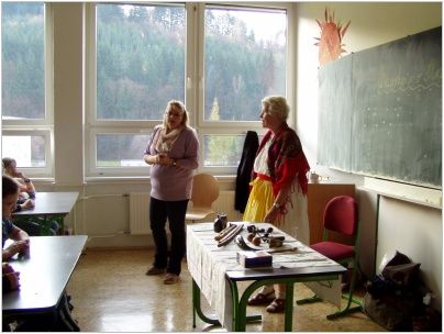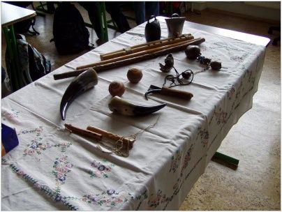 Vyprávění bylo prokládáno zpěvem slovanských písní a také ukázkou hudebních nástrojů. Měli jsme možnost slyšet hru na koncovku (píšťala z bezového dřeva), dvojačku (dvojitá píšťala), kostěnou píšťalku, zaujala nás i hra na kravský a kamzičí roh.