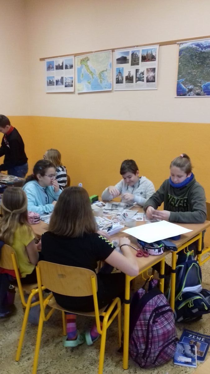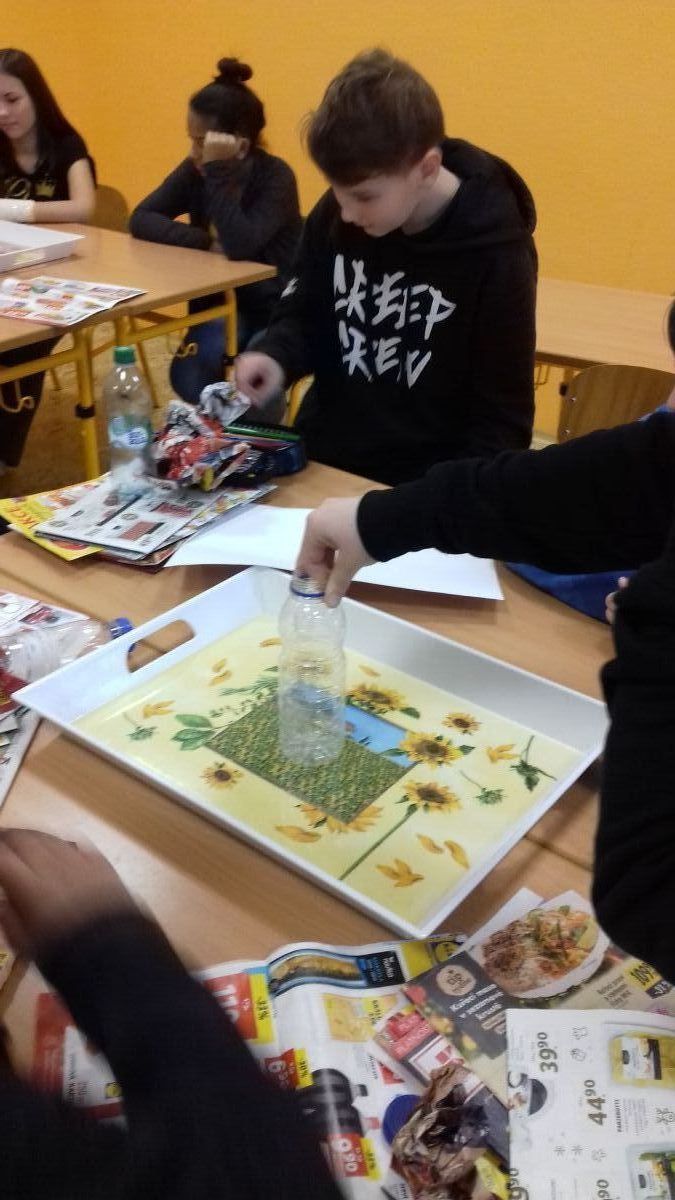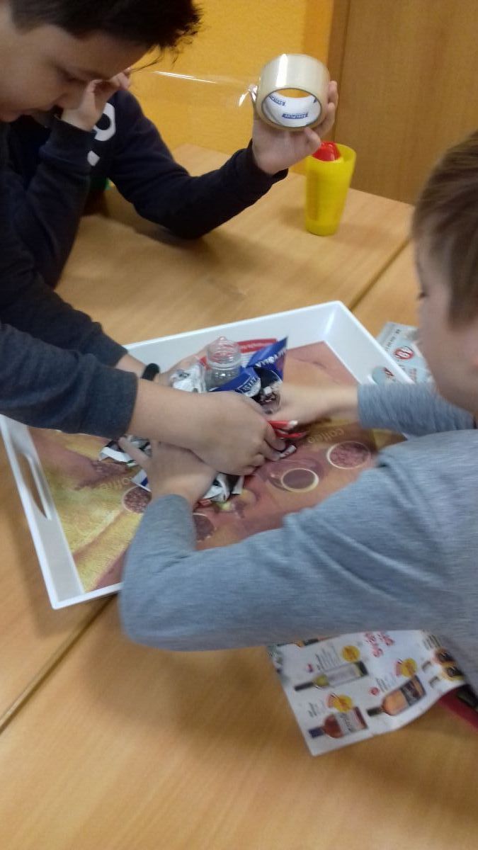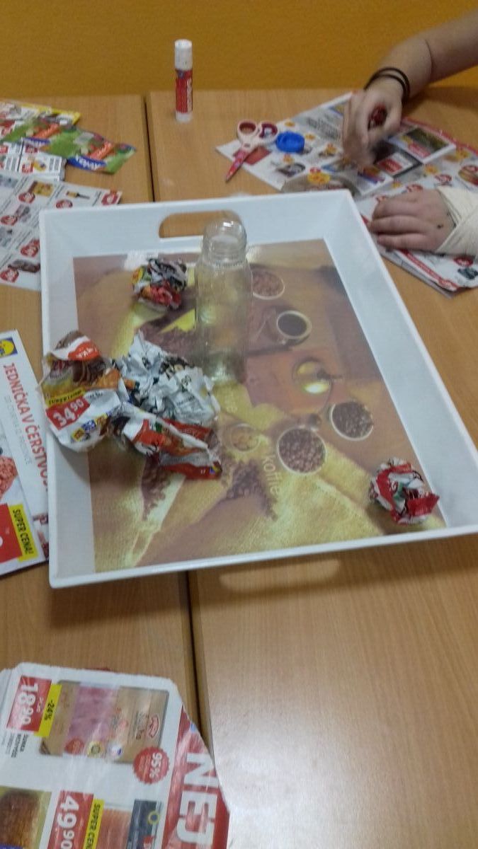 Po rozdělení do skupin a vytvoření pracoviště měla každá skupinka k dispozici podnos, plastovou lahvičku, papíry, nůžky a lepidlo.