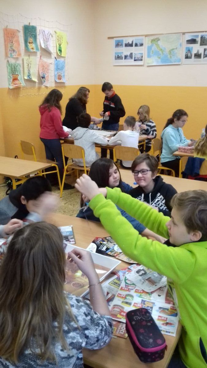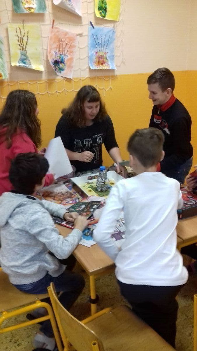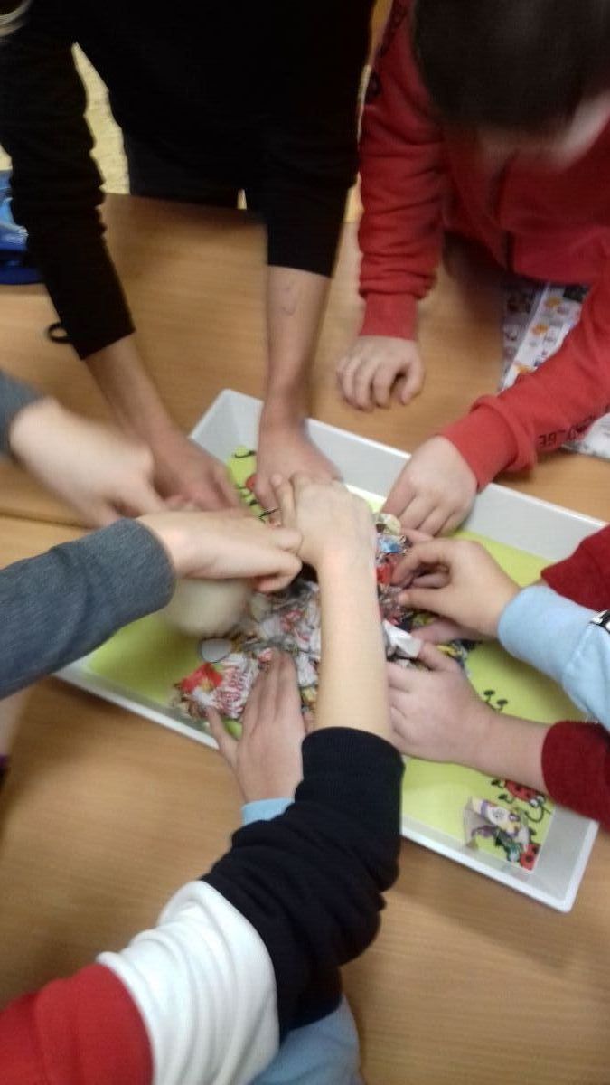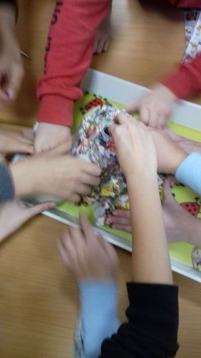 Po rozdělení do skupin a vytvoření pracoviště měla každá skupinka k dispozici podnos, plastovou lahvičku, papíry, nůžky a lepidlo.