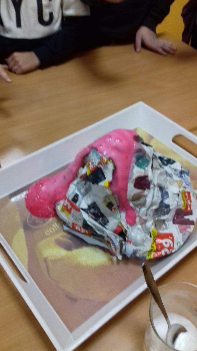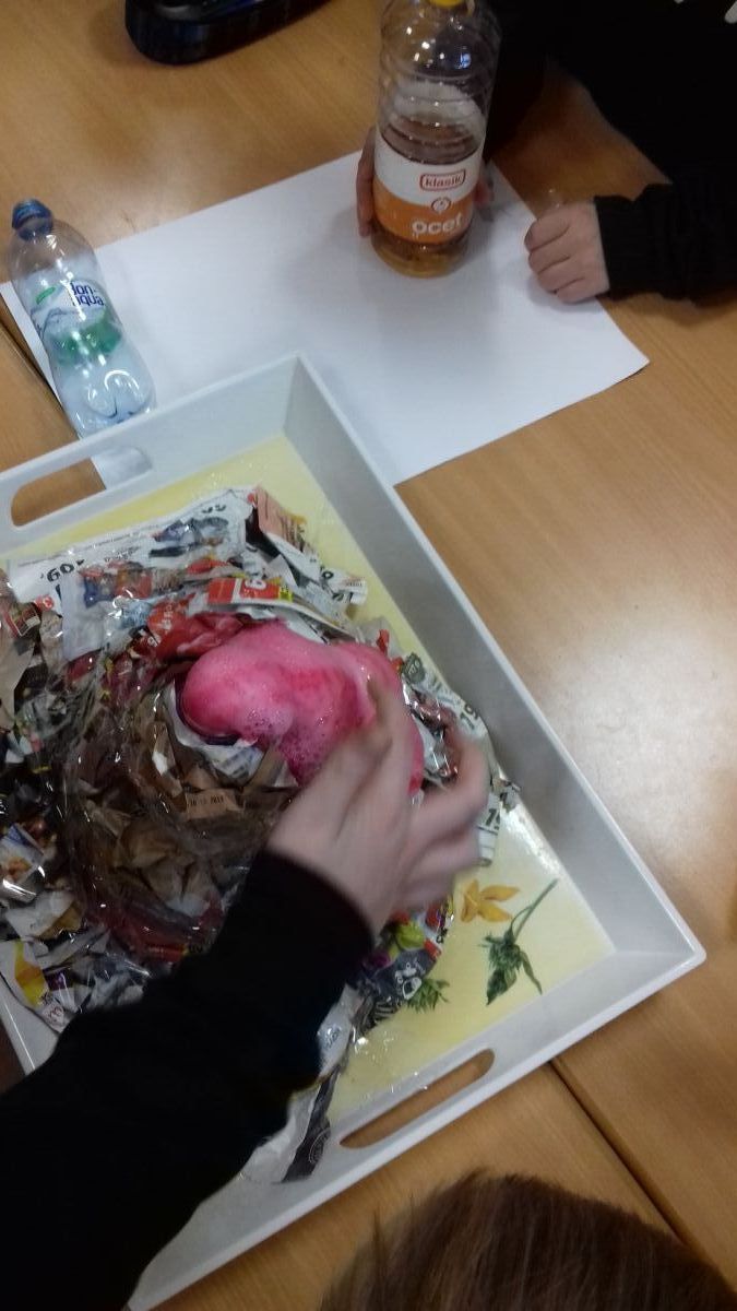 Poté je čekal zážitek sopečné činnosti – lávový proud a výbuch sopky, k čemuž jim posloužila soda, Jar, barevná tuš a ocet.