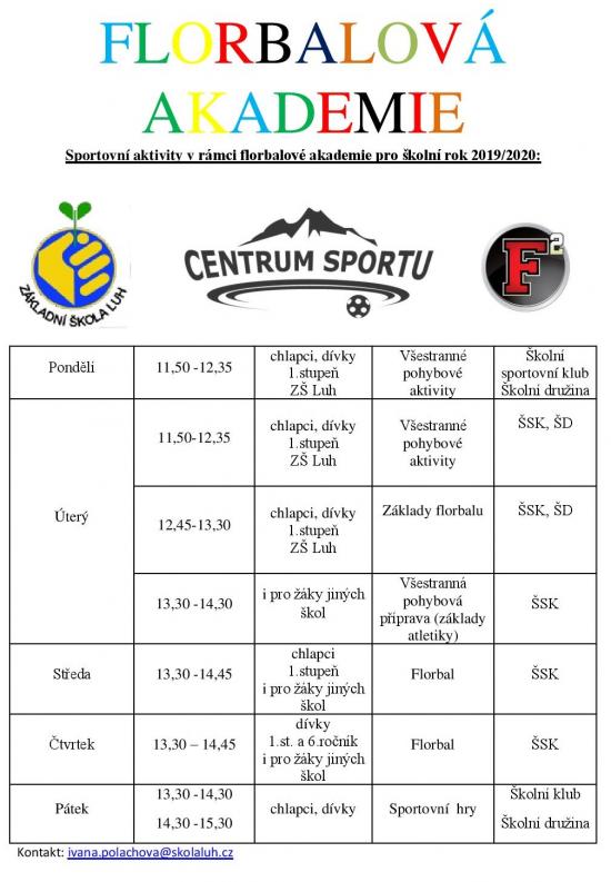 Sportovní aktivity v rámci florbalové akademie pro školní rok 2019/2020: