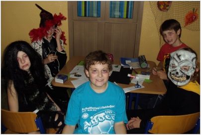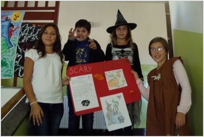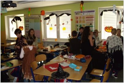 „31. října proběhl ve třídách V. C a IV. A Halloween. Ve třídách měli všichni kostýmy a mluvilo se anglicky. Paní učitelky přišly v kostýmech čarodějek… Ve IV. A dlabaly děti dýně a v V. C jsme dělali projekty… Tento den se nám moc líbil.“ (Terezka, Anička)