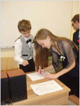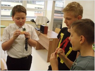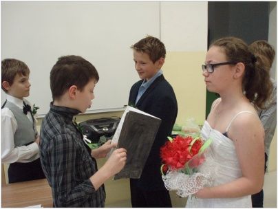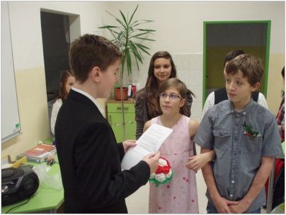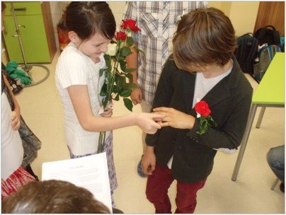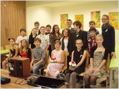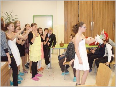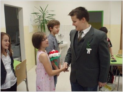 Chystali občanské průkazy, rodné listy, vyhledávali nejvhodnější svatební pochod, vázali kytice a připravovali svatební hostinu. Do „obřadní síně“ se dostavili ve společenském oděvu s napjatým očekáváním. Nakonec vše dobře dopadlo, nevěsta neutekla a snoubenci „právoplatně“ uzavřeli sňatek, pod dohledem oddávajícího, matrikářky, svědků a přítomných svatebčanů. Na závěr nás čekala pestrá svatební hostina. Pochutnali jsme si na chlebíčcích, dortech a spoustě dalších dobrot. Nezapomněli jsme také na svatební zvyky. Nevěsta házela kyticí, zpívali jsme novomanželům a pronášeli slavnostní řeč. Celou událost přišla podpořit také paní ředitelka a třídní učitelky. Velké poděkování patří všem, kteří se podíleli na přípravě a umožnili nám tento nezapomenutelný zážitek nanečisto prožít.