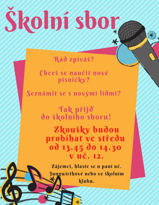 Stále je možné se přihlašovat do školního sboru. Ten je pro všechny žáky 2. stupně, kteří rádi zpívají. To je jediné kritérium přijetí :). Zkoušky budou bývat každou středu od 13.45 do 14.30 v uč. 12. Začínáme 4. 10.