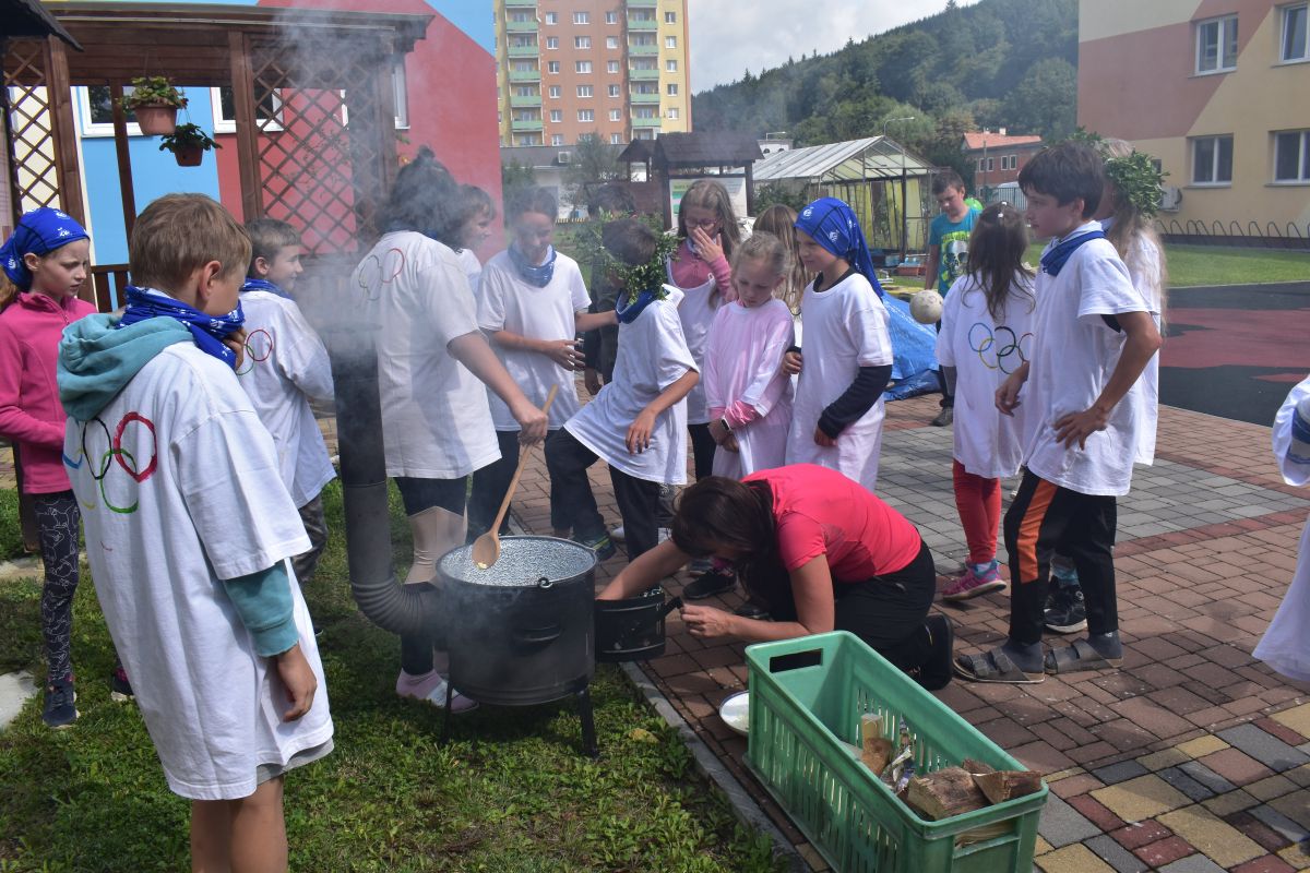 Nejen sportem je však člověk živ. Během kempu jsme poznali historii Olympijských her, víme, kdo naši zemi v Tokiu reprezentoval a kdo získal medaili. Věděli bychom, jaké jsou olympijské disciplíny, jak poskytnout první pomoc a jaká jsou čísla IZS. Hravou formou jsme vyhledávali informace, zopakovali matematiku, přírodovědu, ale i vaření.