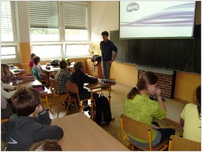 Připravil si pro nás krásnou prezentaci o sobě a svém životě, rodině, svých zálibách a svém státu. Vše bylo v angličtině a my jsme si to museli sami přeložit. Calebovi je 18, žije na velké farmě, létá letadlem a hraje na klavír a trumpetu. Po prezentaci jsme se mohli Caleba ptát na různé dotazy. Další hodinu AJ nám paní učitelka připravila skvělý kvíz o Calebově životě, takže se rychle ukázalo, kolik jsme mu porozuměli. Myslím, že jsme docela uspěli, až na tvoření otázek.